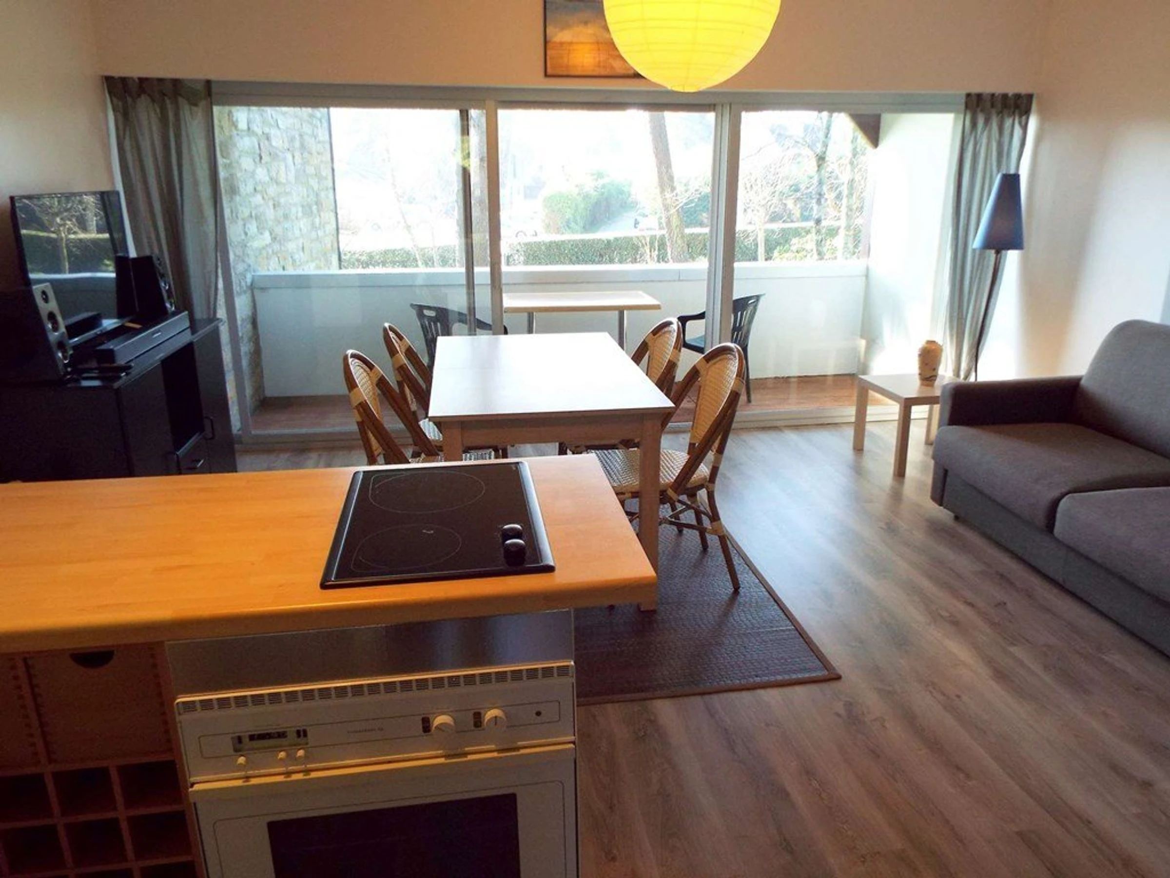 - Living room with dining area (table and chairs) and lounge area (TV, hi-fi system, Rapido sofa: 2-person sleeping, blanket), opening onto a south-facing loggia with garden furniture