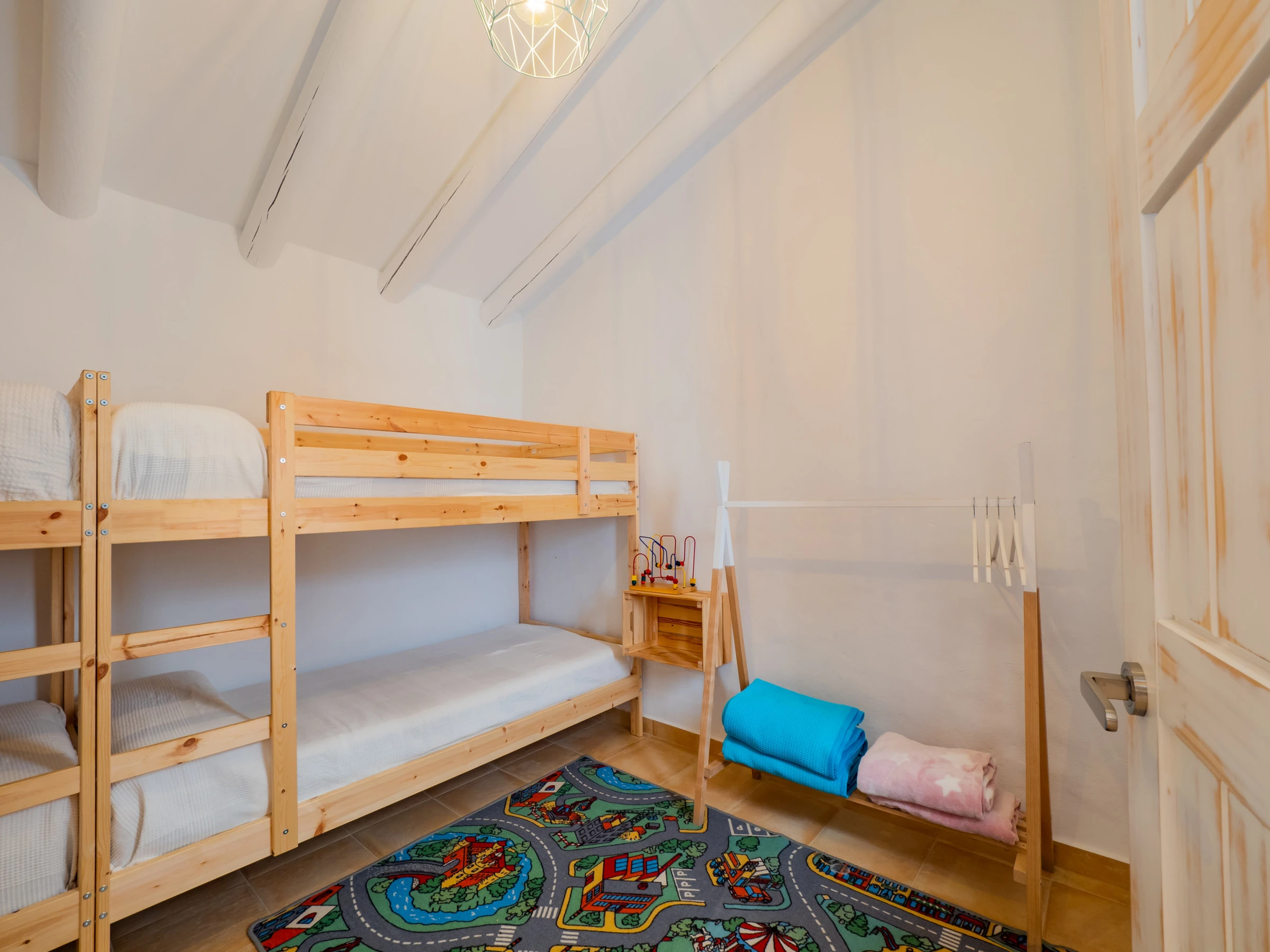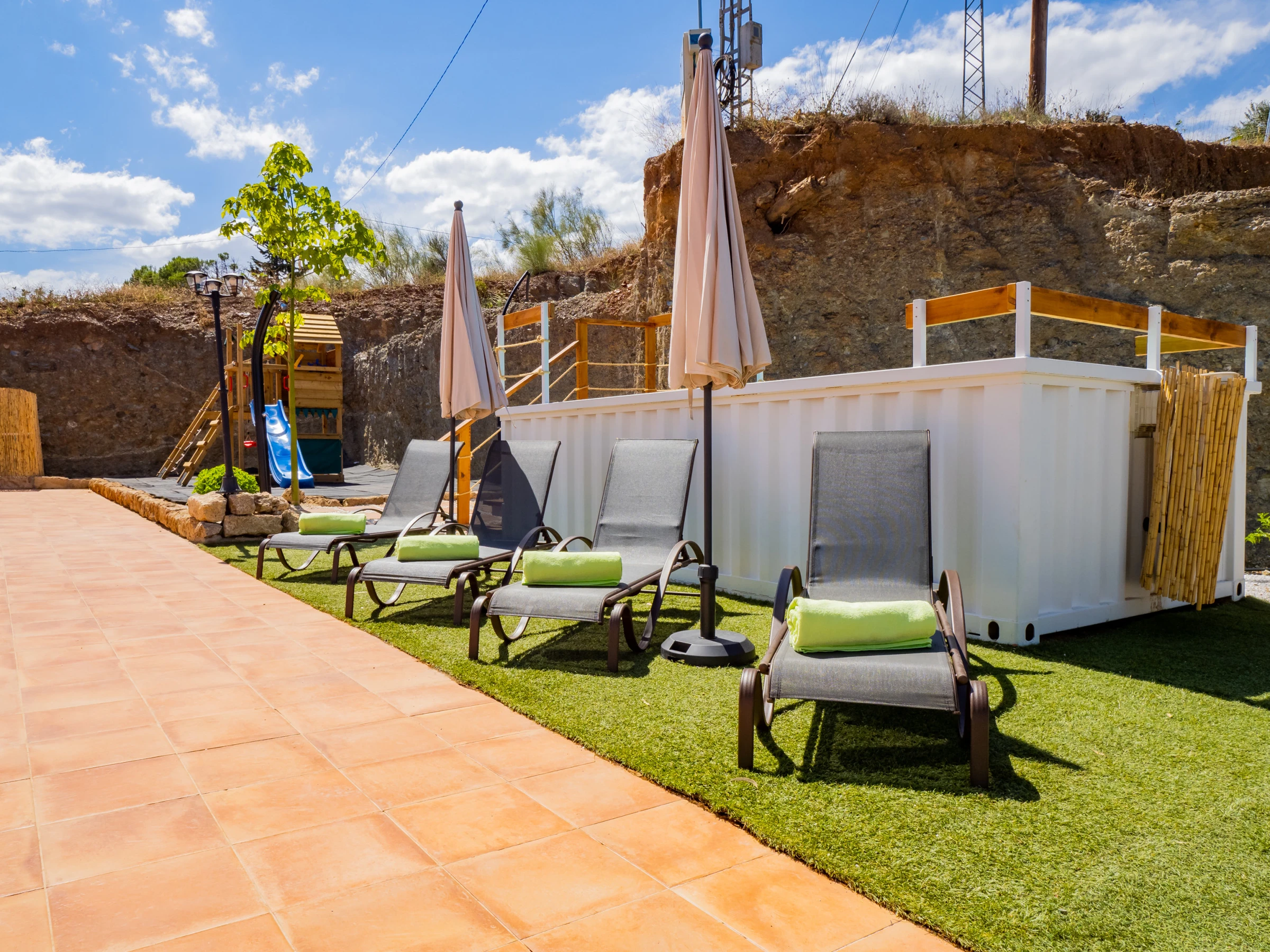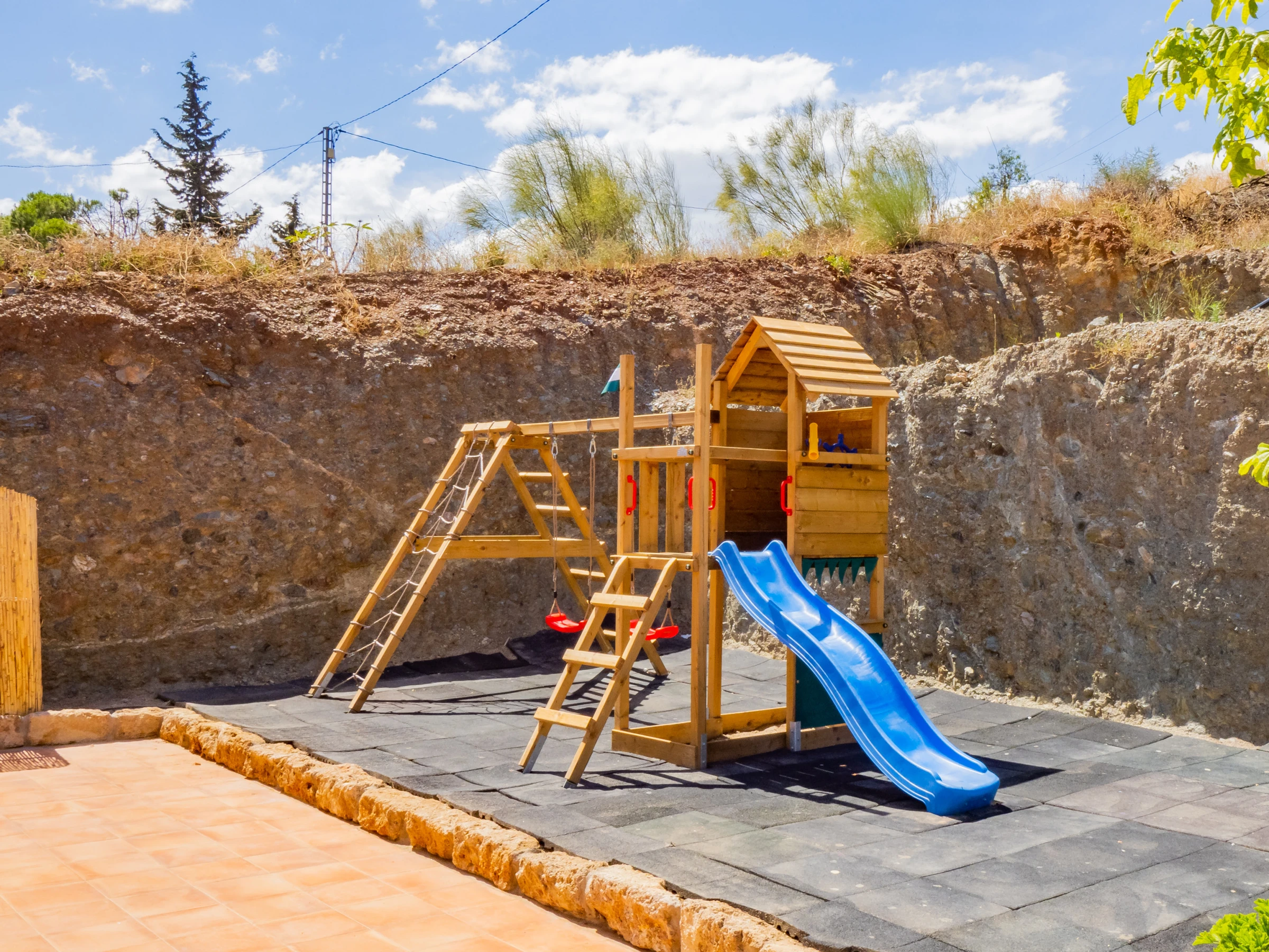 The exteriors are a great attraction: a recycled shallow pool (less than 90 cm) with safe access via a wooden ladder, ideal for children and refreshing as a family. The children's playground is of high quality, with padded ground and various attractions, visible from almost the entire outdoor area for parents' peace of mind. At night, the low light pollution allows enjoying a wonderful starry view, creating a unique atmosphere for family reunions.