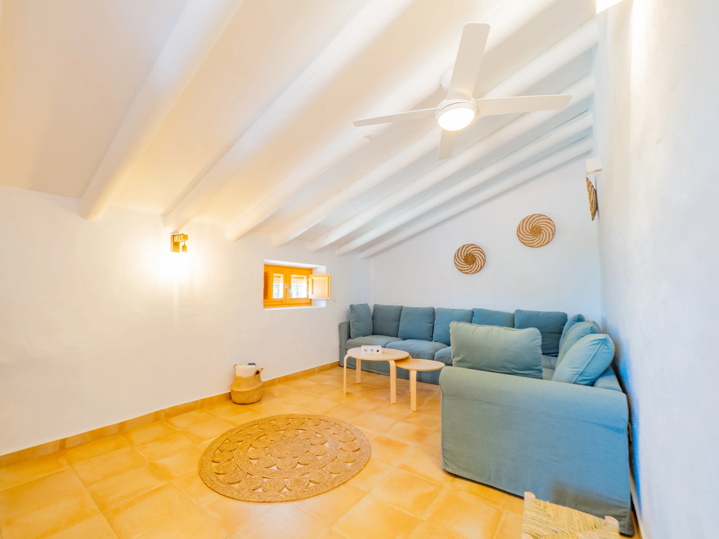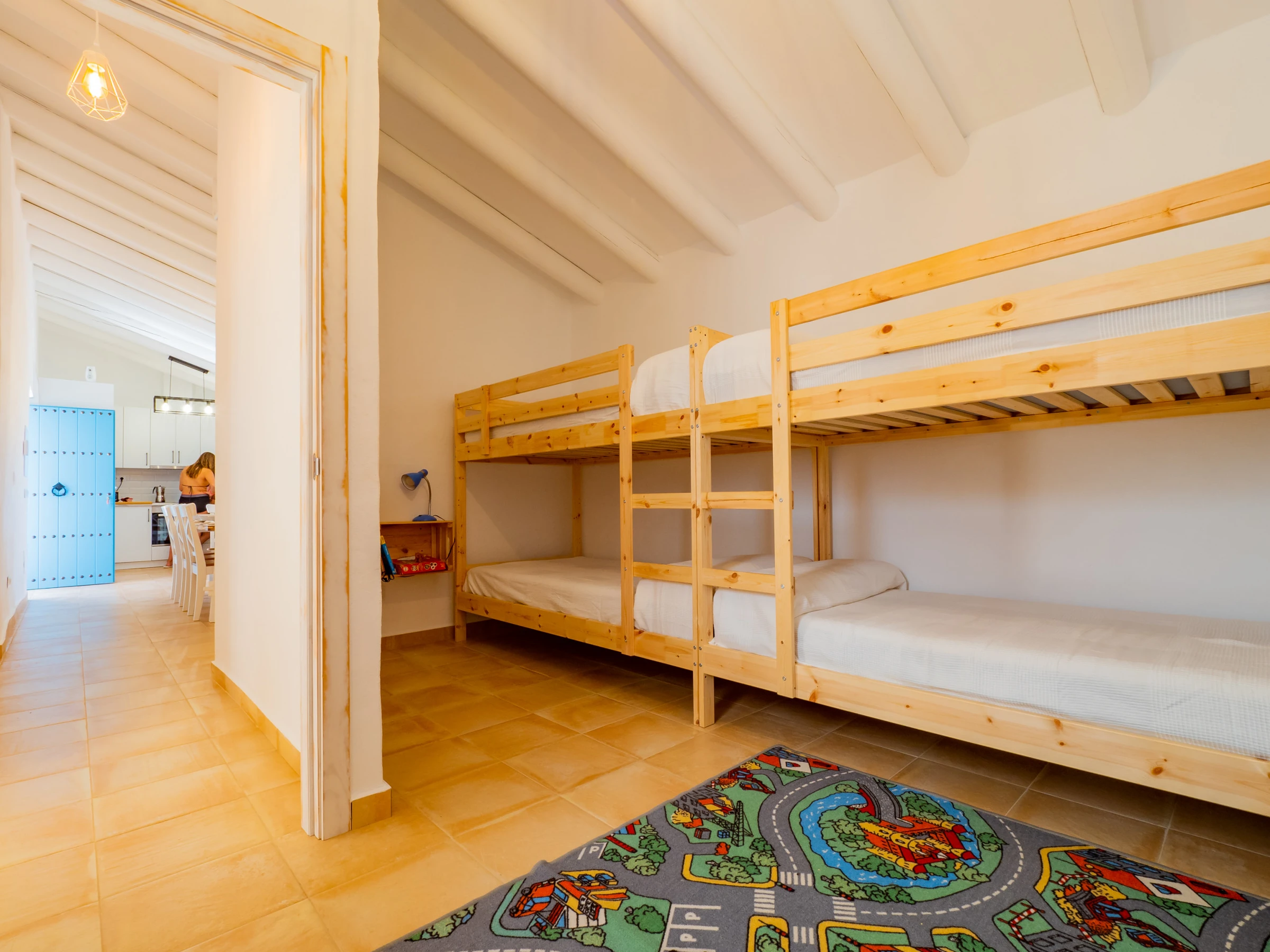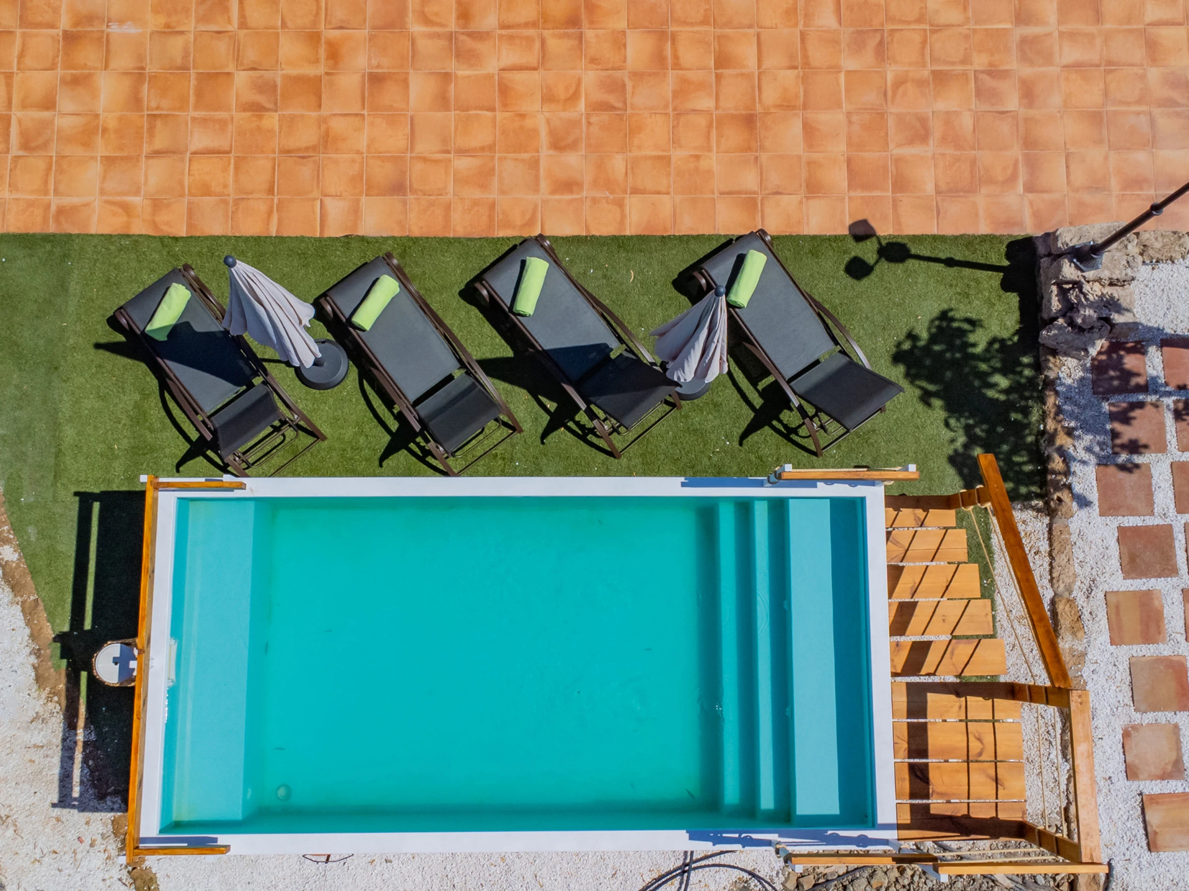 The exteriors are a great attraction: a recycled shallow pool (less than 90 cm) with safe access via a wooden ladder, ideal for children and refreshing as a family. The children's playground is of high quality, with padded ground and various attractions, visible from almost the entire outdoor area for parents' peace of mind. At night, the low light pollution allows enjoying a wonderful starry view, creating a unique atmosphere for family reunions.