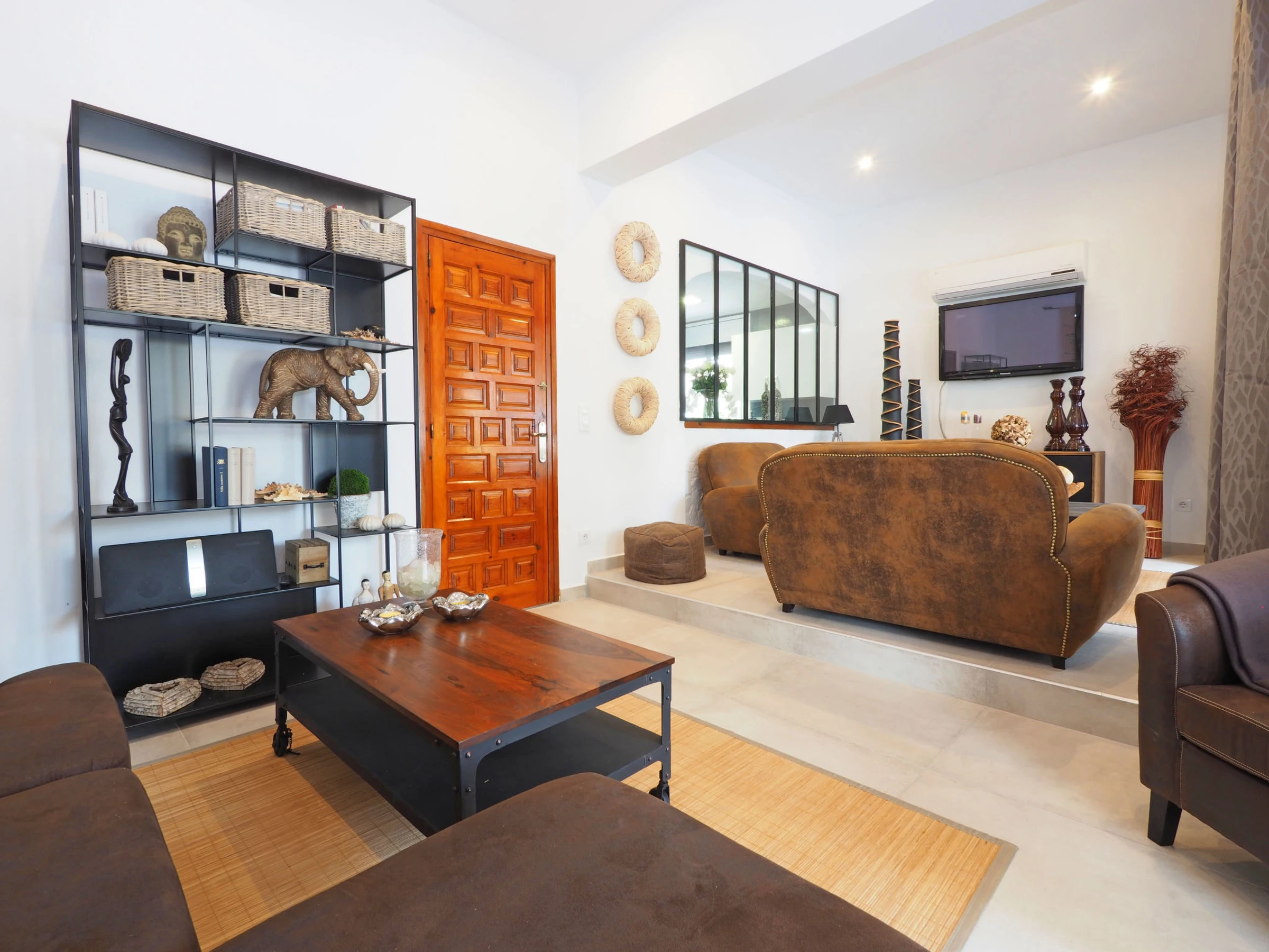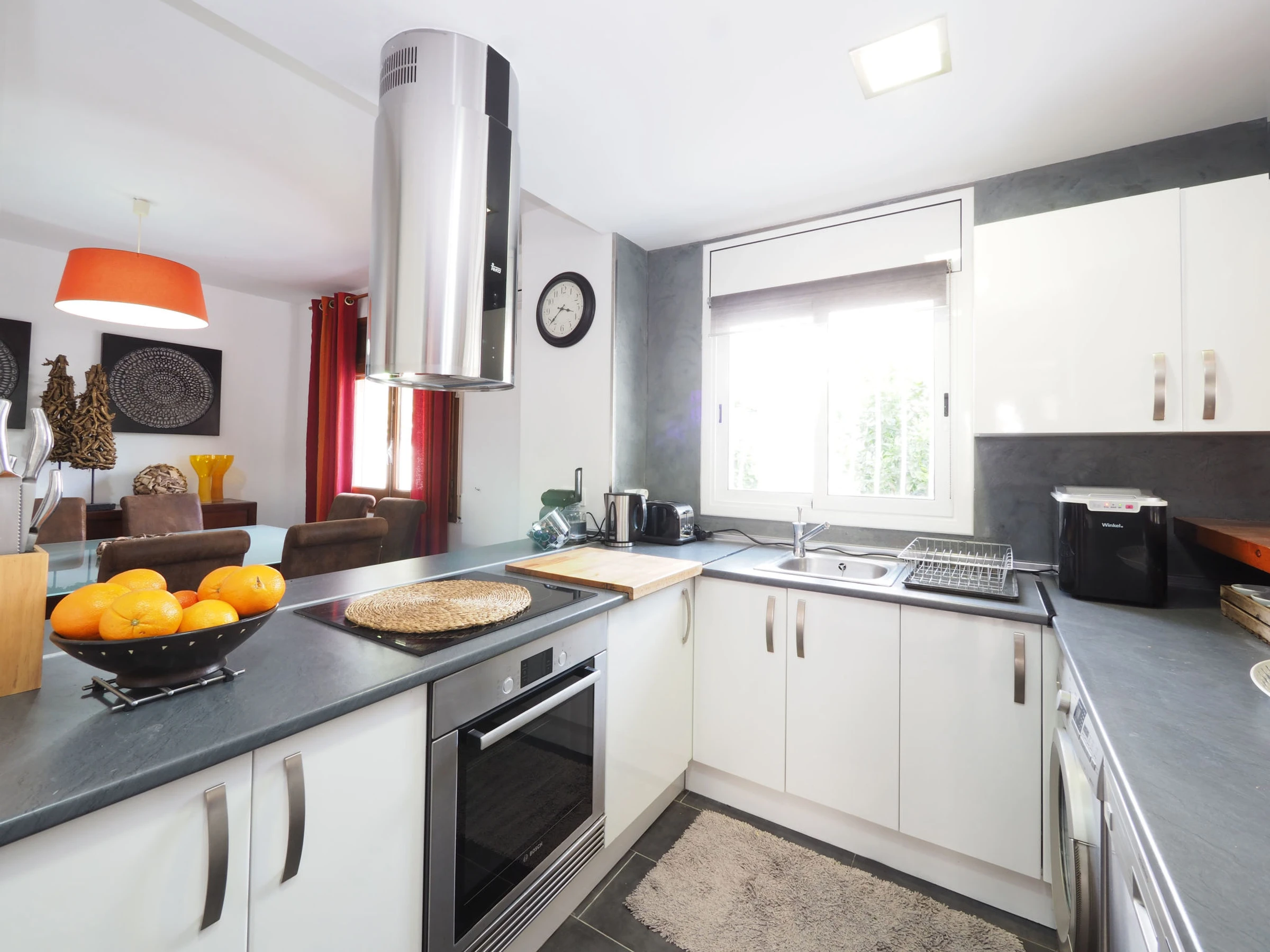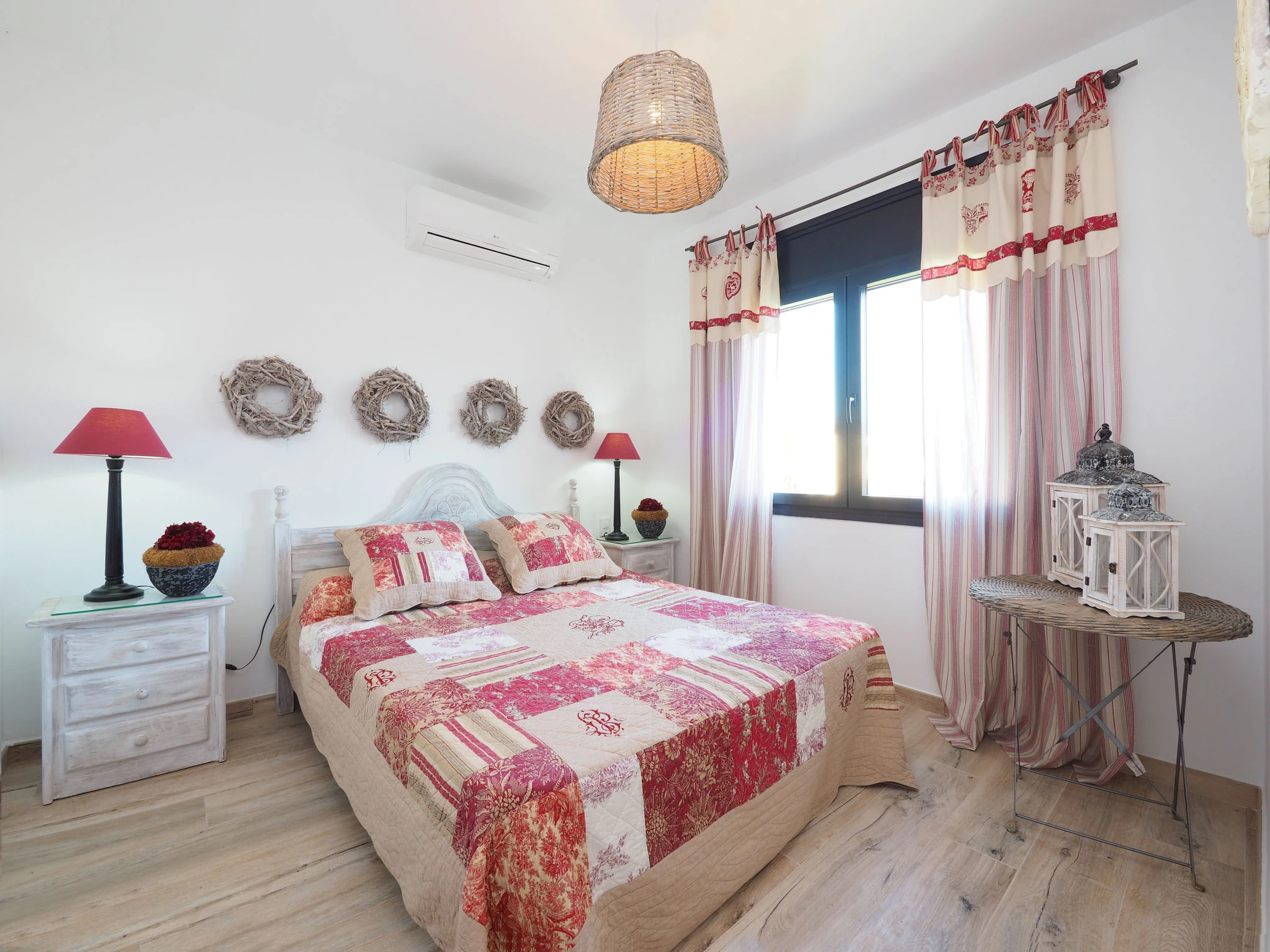 4-room house 125 m2 on 2 levels. Very comfortable and tasteful furnishings: living room with satellite TV and digital TV. Exit to the patio, to the swimming pool. Kitchen-/living room (oven, dishwasher, 2 ceramic glass hob hotplates, microwave, freezer, electric coffee machine) with bar. Shower/WC. Air-conditioning, forced-air heating. Upper floor: 1 room with 1 french bed (150 cm), shower/WC. 1 room with 1 french bed (140 cm), shower/WC. 1 room with 2 beds (90 cm). Terrace 25 m2, roofed, patio, garden. Terrace furniture, barbecue. View of the swimming pool. Facilities: washing machine. Internet (WiFi, free). Reserved parking (fenced 2 cars) at the house. Please note: TV only ES, FR, DE. [hidden]