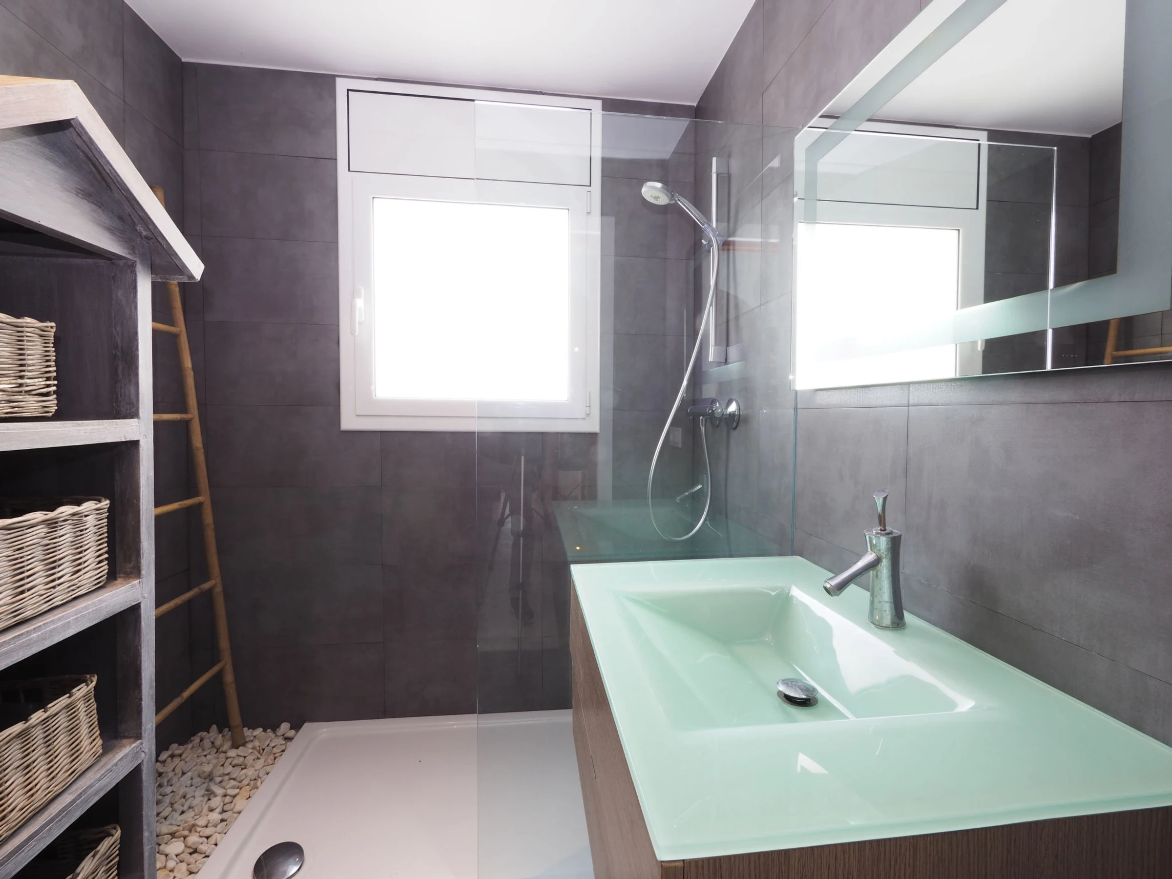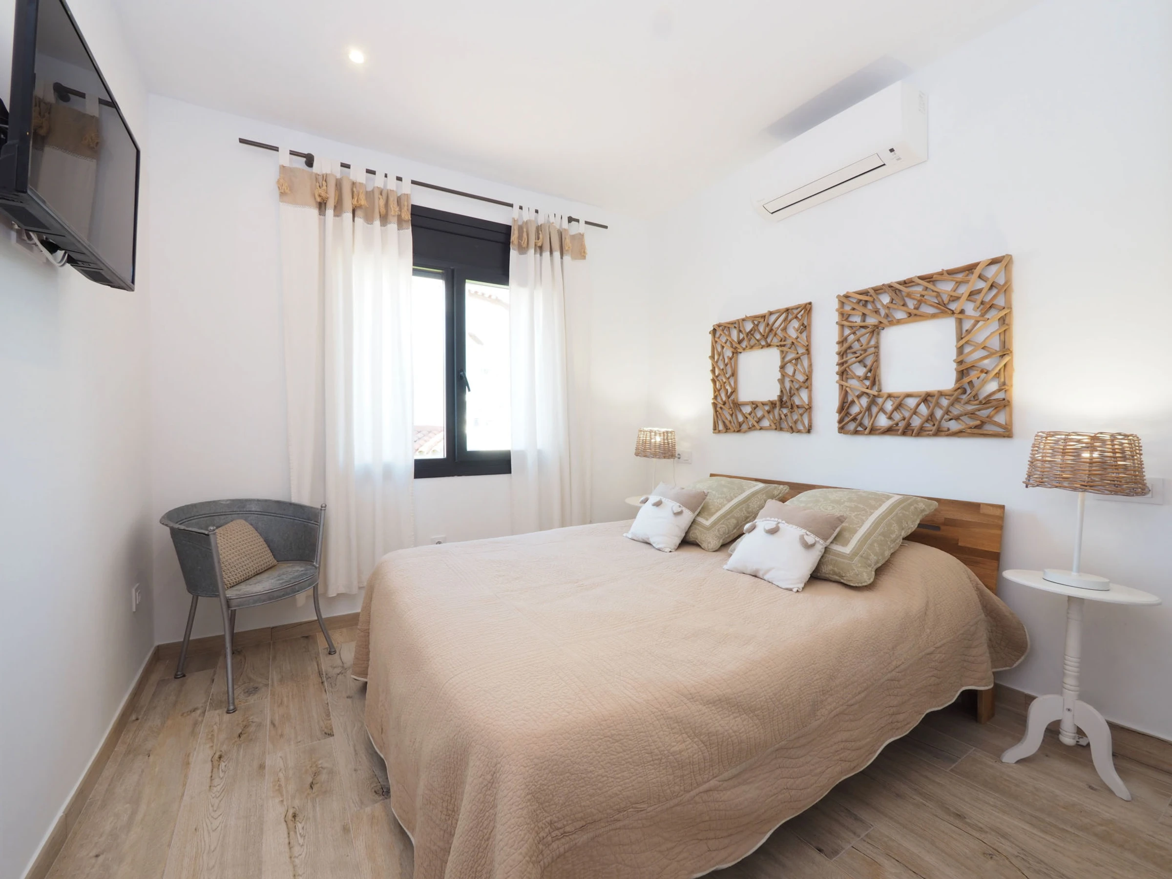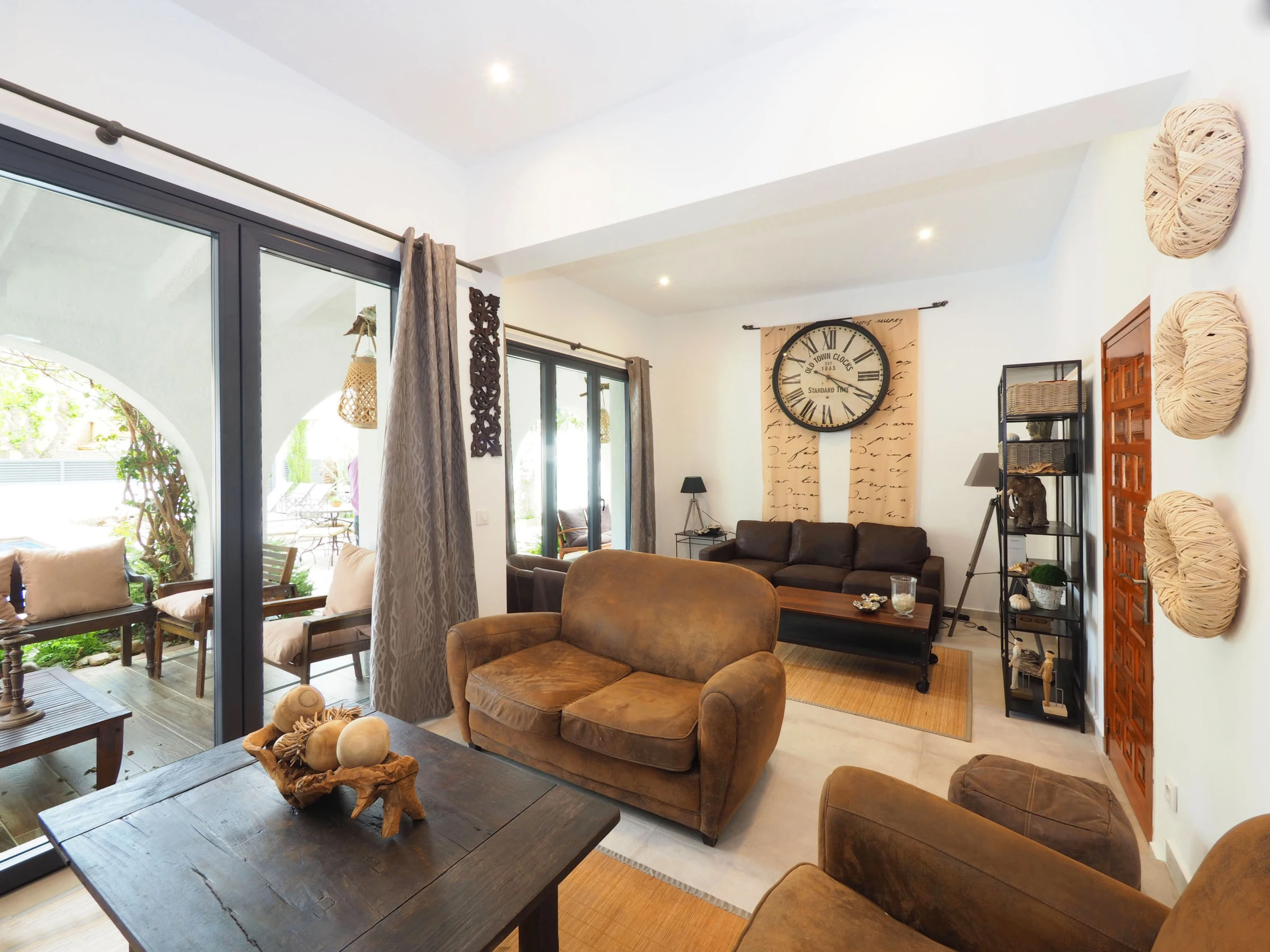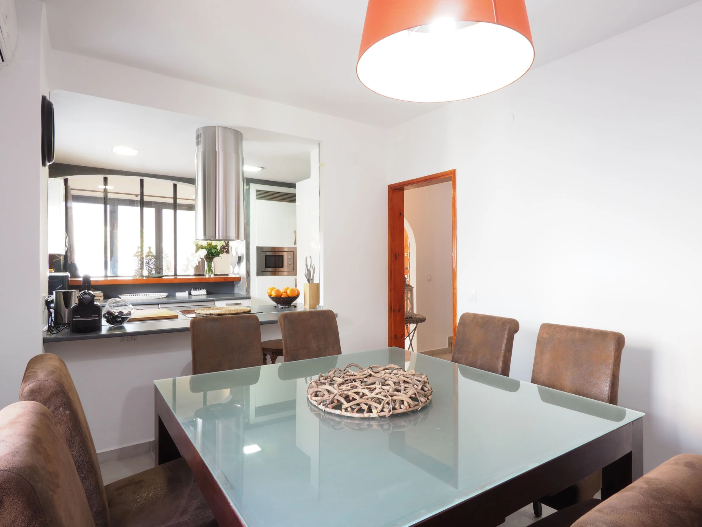 4-room house 125 m2 on 2 levels. Very comfortable and tasteful furnishings: living room with satellite TV and digital TV. Exit to the patio, to the swimming pool. Kitchen-/living room (oven, dishwasher, 2 ceramic glass hob hotplates, microwave, freezer, electric coffee machine) with bar. Shower/WC. Air-conditioning, forced-air heating. Upper floor: 1 room with 1 french bed (150 cm), shower/WC. 1 room with 1 french bed (140 cm), shower/WC. 1 room with 2 beds (90 cm). Terrace 25 m2, roofed, patio, garden. Terrace furniture, barbecue. View of the swimming pool. Facilities: washing machine. Internet (WiFi, free). Reserved parking (fenced 2 cars) at the house. Please note: TV only ES, FR, DE. [hidden]