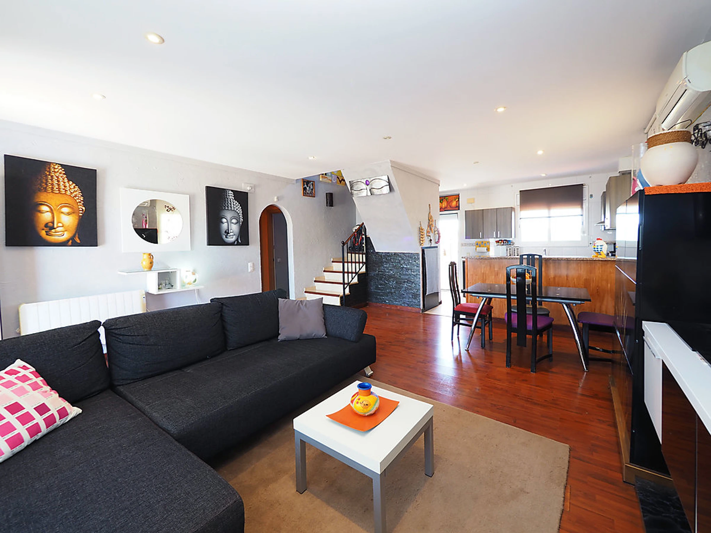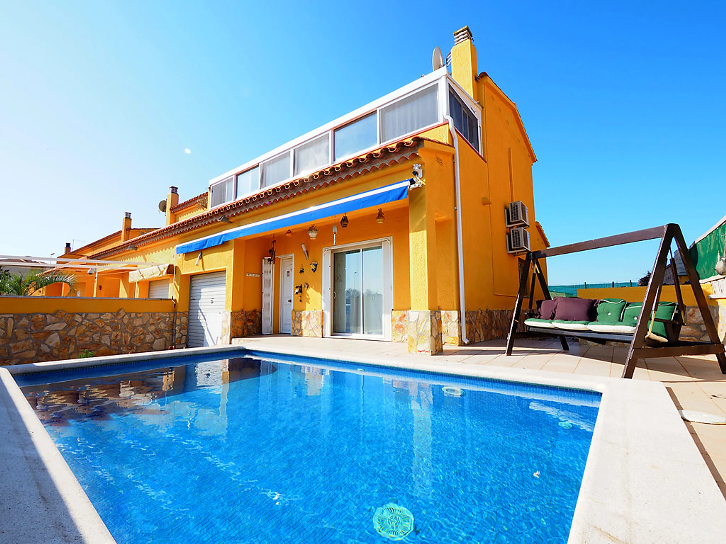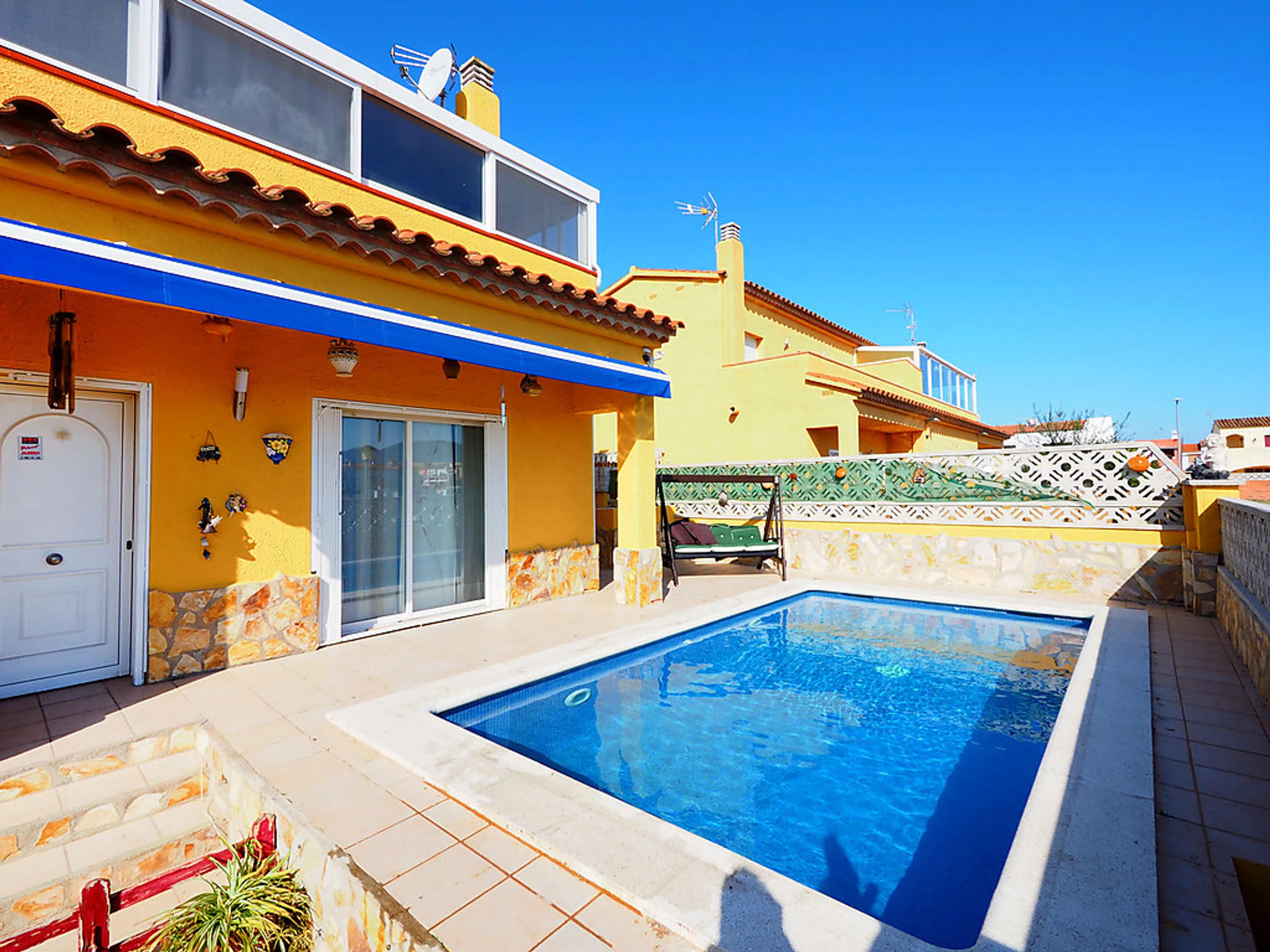 Cosy, comfortable semi-detached house "Puigmal", 2 storeys. In the district of Puigmal 3 km from the centre of Empuriabrava, in a quiet, sunny position residential area (villas), area with little traffic, 3.2 km from the sea, 3 km from the beach, in a cul-de-sac. Private: property (fenced), swimming pool (7 x 4 m,[hidden].). Parking at the house. Grocery, supermarket, restaurant 500 m, bar 650 m, café 400 m, bus stop 1 km, sandy beach "Empuriabrava" 3 km. Sports harbour 3 km, golf course 12 km, tennis 800 m, minigolf 2 km, cycle lane 900 m. Nearby attractions: Aerodromo y Túnel de viento 800 m, Parque acuático Roses 3 km, Casino y Festival Perelada 14 km, Museo Dalí Figueres 15 km, Monasterio de Sant Pere de Rodes 20 km, Ruinas de Empuries 23 km.