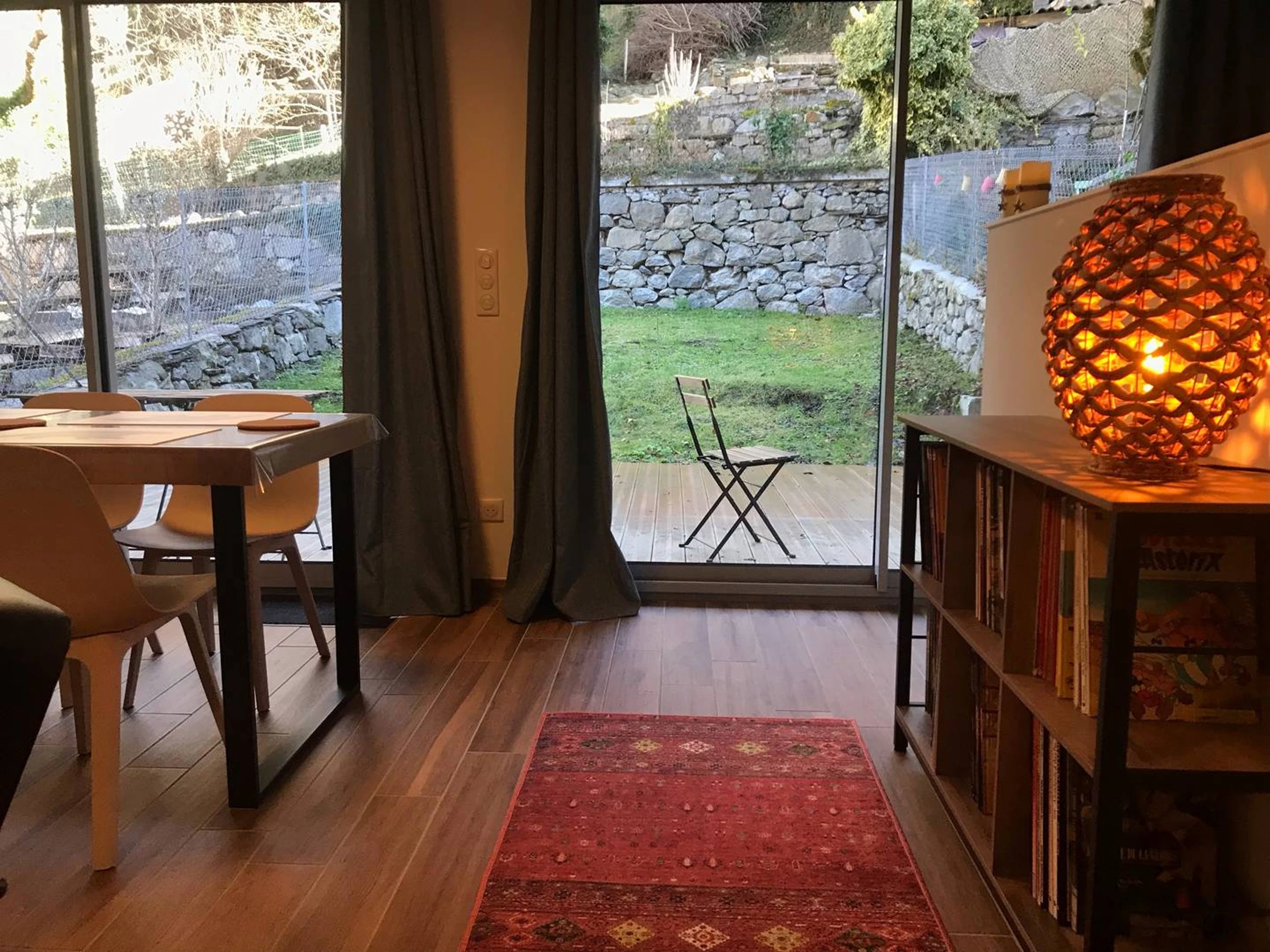Jardin/terrasse coté montagnes et grand balcon coté village sans vis à vis.