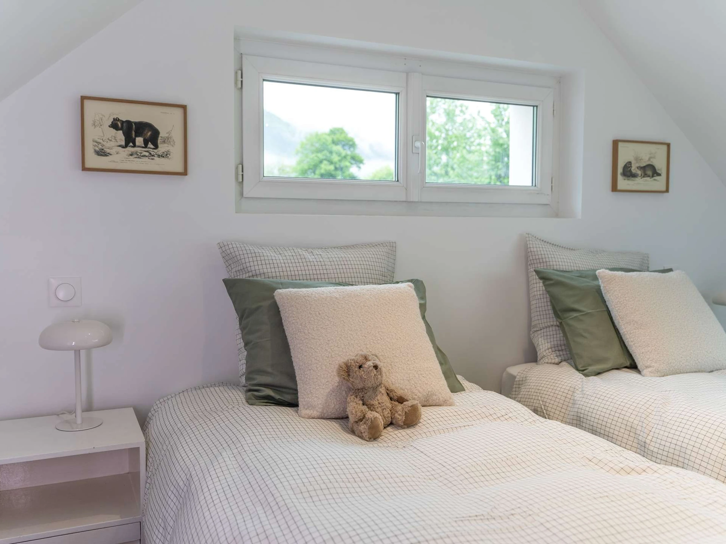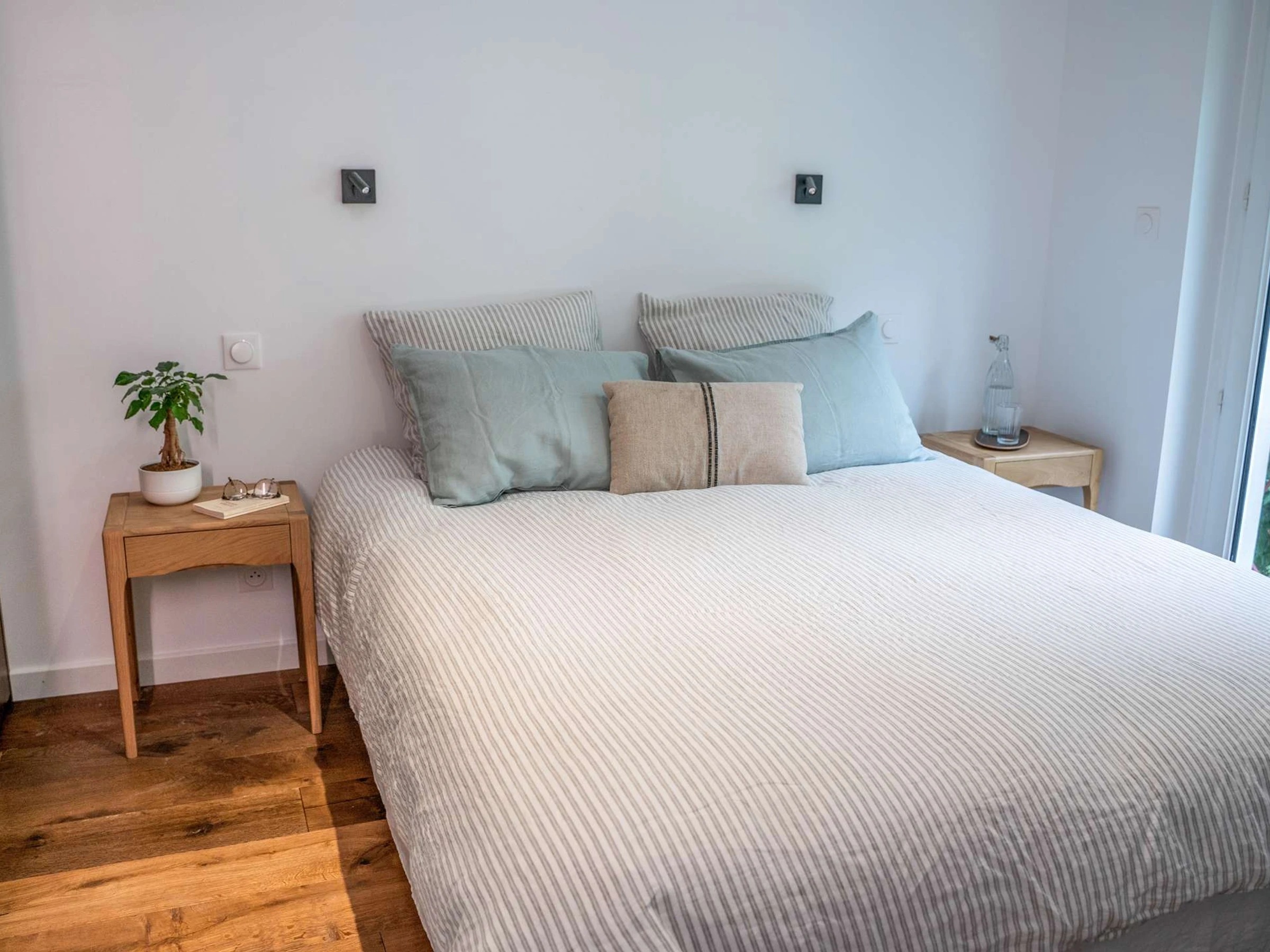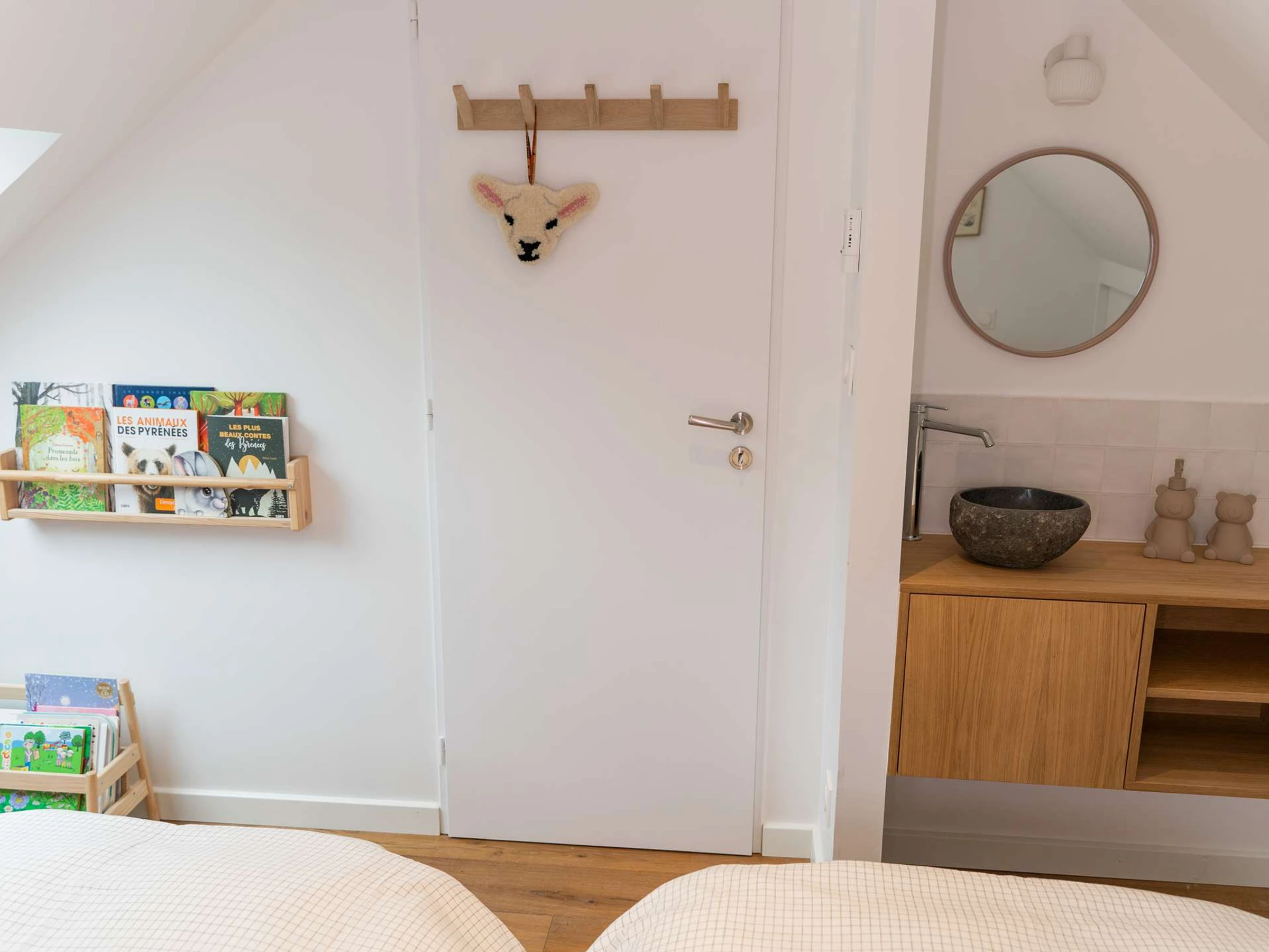 Upstairs, there is a separate toilet and a third bedroom with a queen-size bed (160 cm) and its own bathroom (shower and sink). A 4th bedroom, children's room equipped with 2 single beds in 90x190, possibility of pushing them together to make a double room with water point and storage.