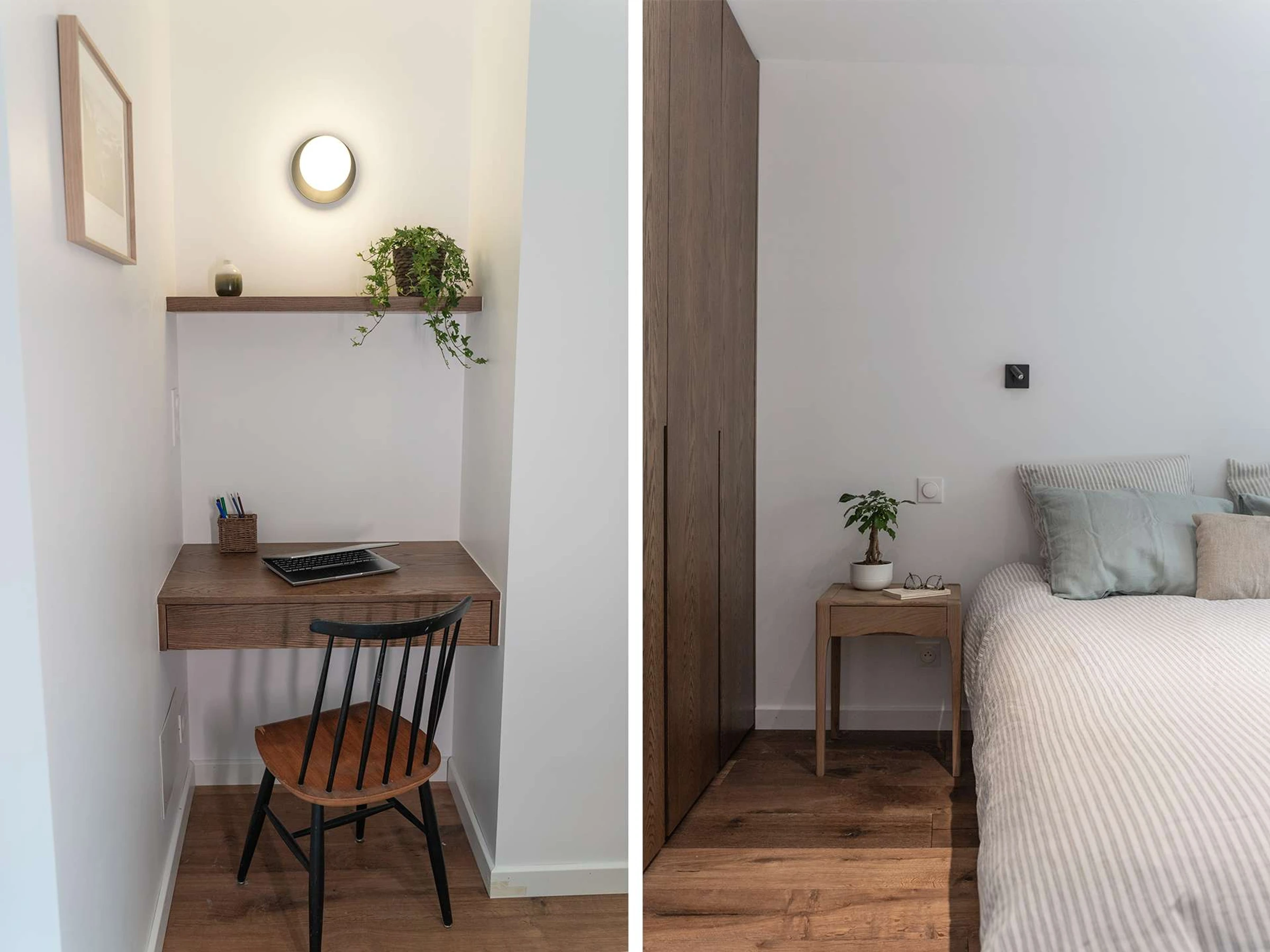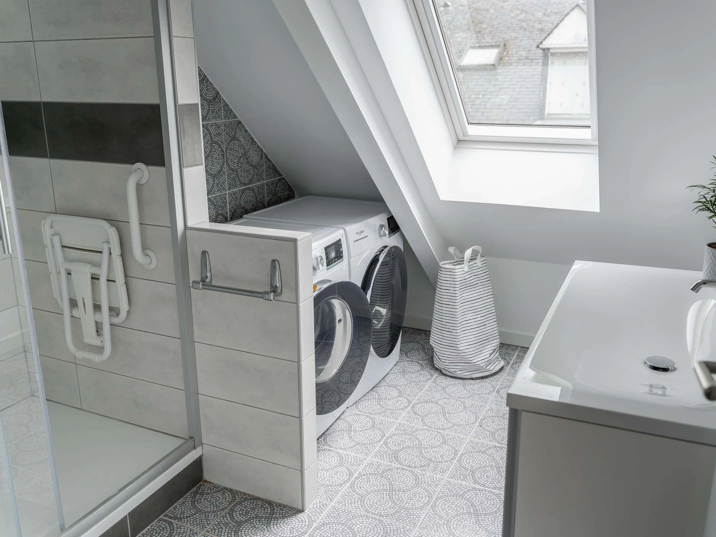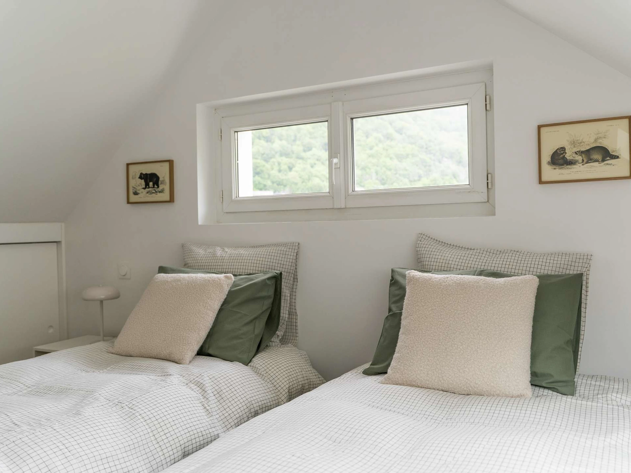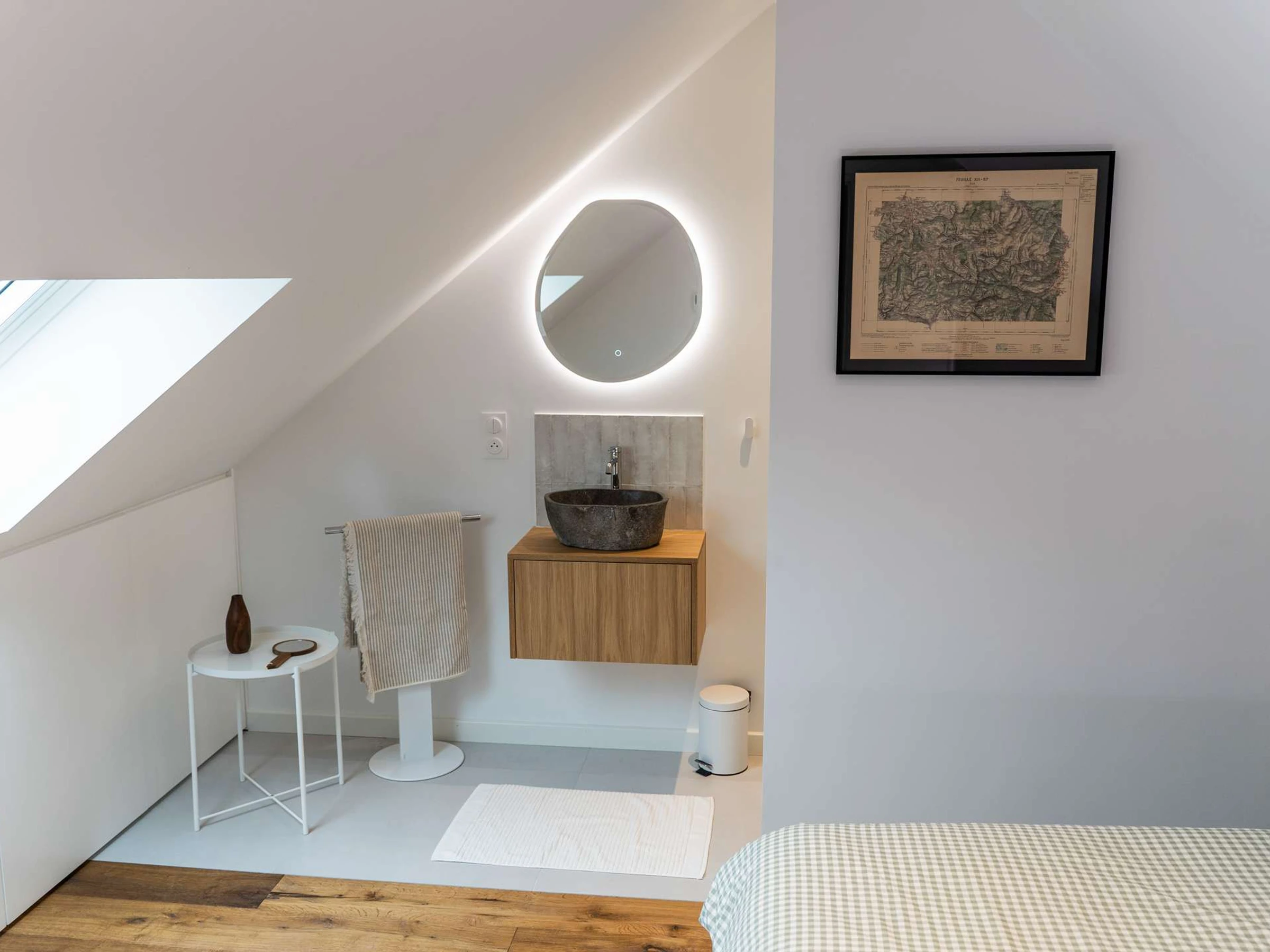 Upstairs, there is a separate toilet and a third bedroom with a queen-size bed (160 cm) and its own bathroom (shower and sink). A 4th bedroom, children's room equipped with 2 single beds in 90x190, possibility of pushing them together to make a double room with water point and storage.