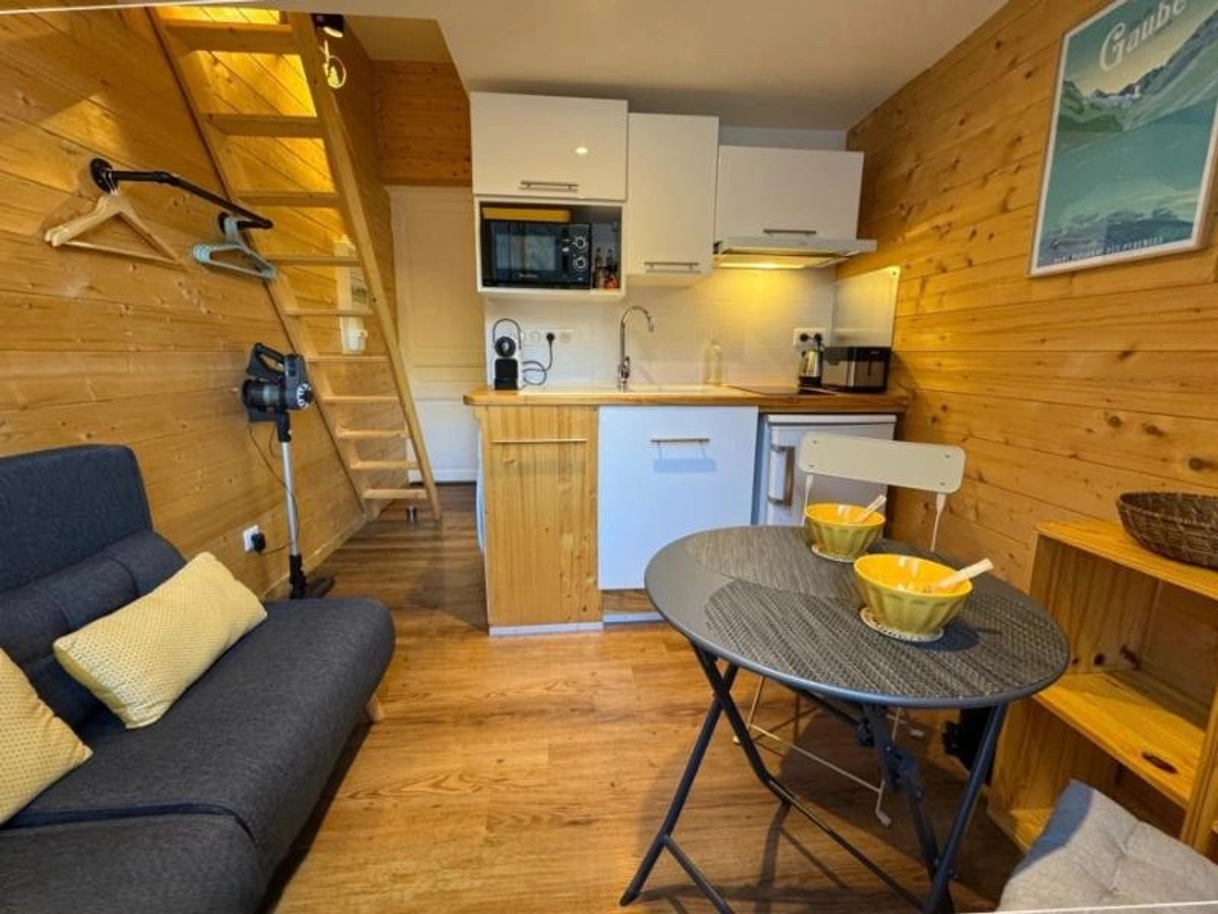 In a 1900s residence, this cozy apartment offers a charming mountain setting. The mezzanine sleeps two, and on the ground floor, there is a living area with a fully equipped kitchen (toaster, Nespresso machine, refrigerator, two-burner cooktop, range hood, dishes, etc.). The lounge area includes two armchairs, a TV, and a dining area. There is also a bathroom with a shower, sink, and toilet. A ski locker is located on the ground floor of the residence.