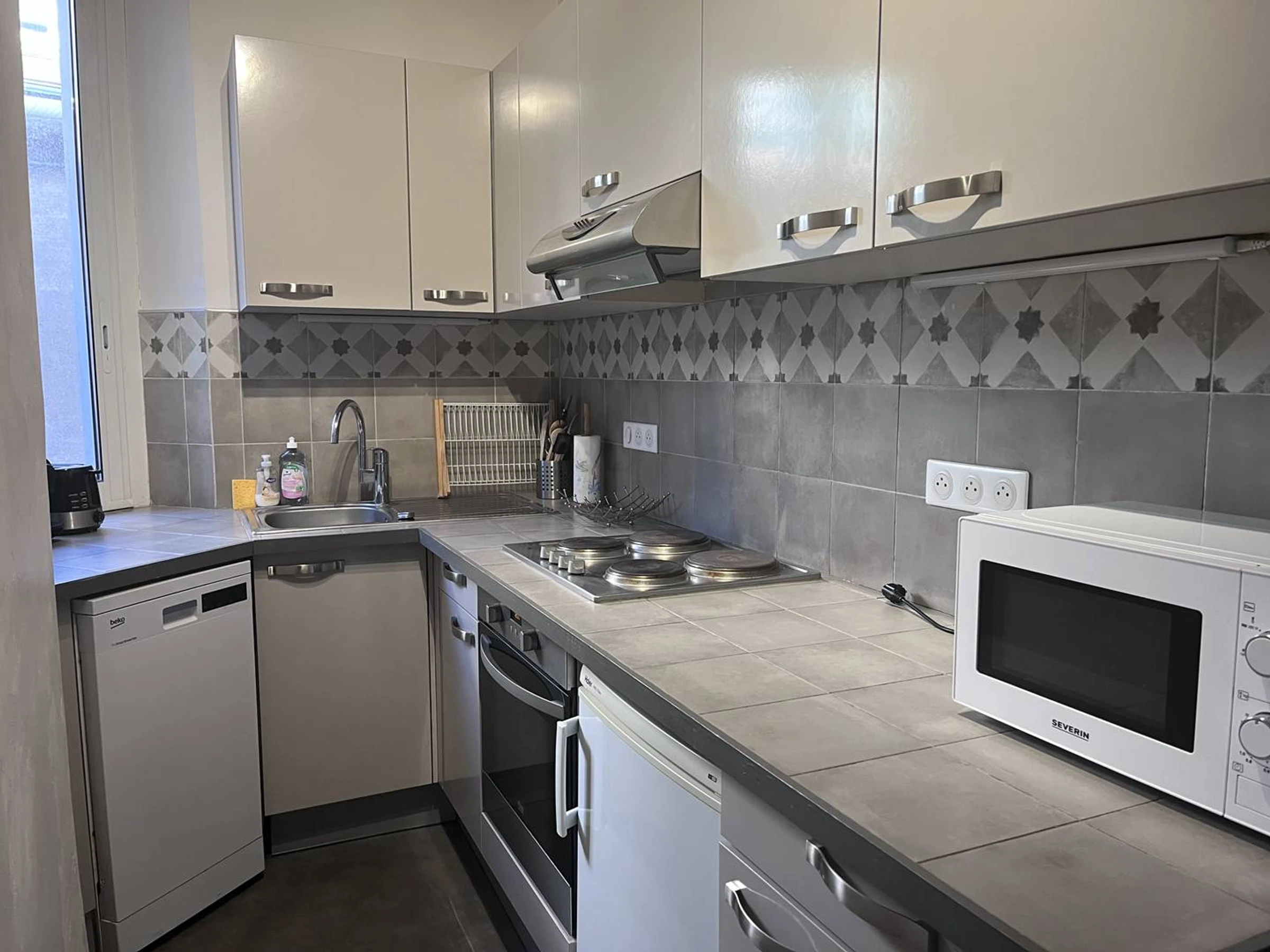 D’une cuisine équipée : grand four, micro-ondes, petit réfrigérateur, grille-pain, cafetière à filtre, nespresso, un appareil à raclette...