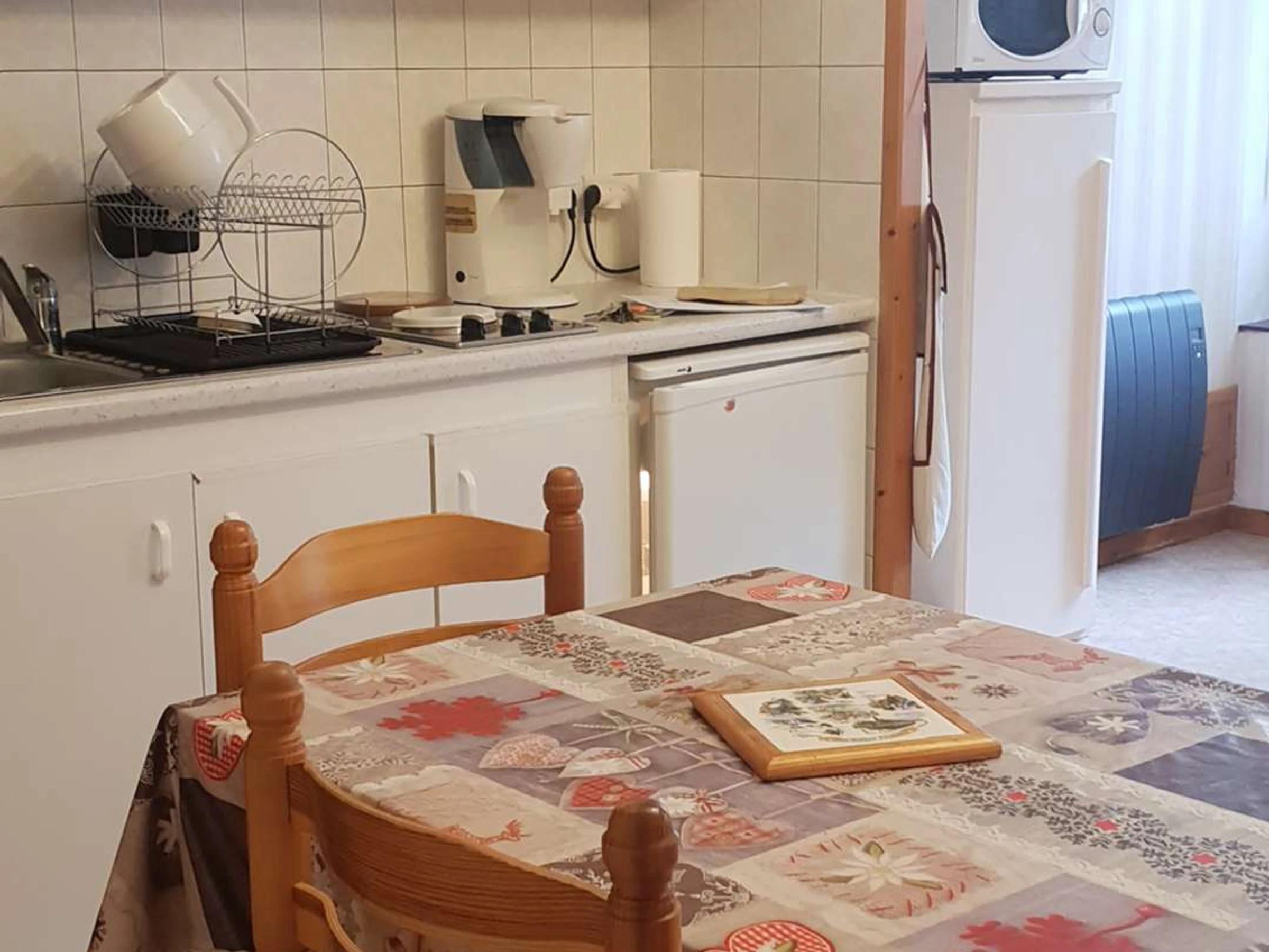 Apartment that can accommodate 4 people, in the very center of the village near shops and cable car. On the 3rd floor of a residence with elevator, this apartment consists of a living room with sofa bed/living room/equipped kitchen, a bedroom with two 90cm twin beds + storage, a bathroom, bathtub , vanity unit, toilet. On the ground floor of the residence there are ski racks. Paid municipal parking 50 m away, or free parking nearby.