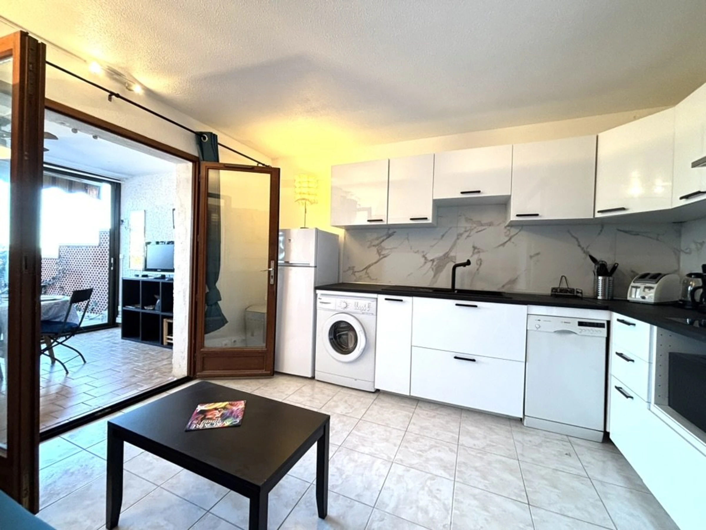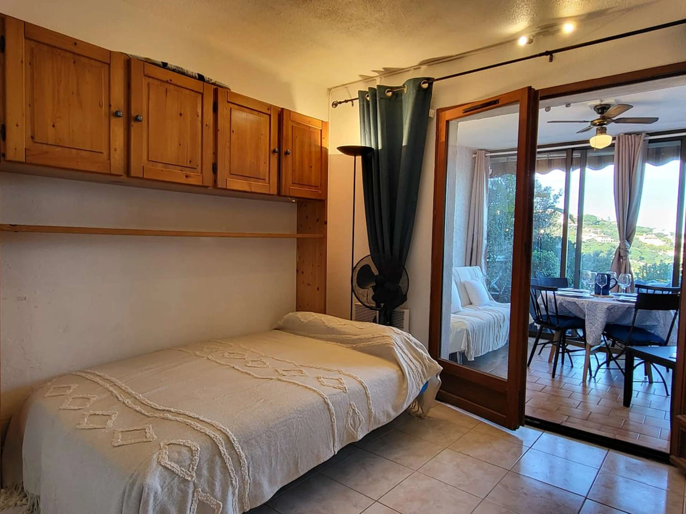 In Cavalaire-sur-Mer, within a quiet residence featuring a swimming pool and tennis courts, discover this studio apartment offering stunning views of the hills, the sea, and the Bay of Cavalaire.
