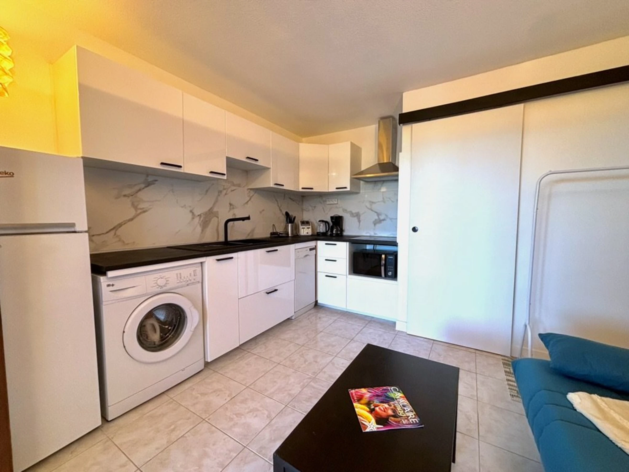 This vacation apartment, which is not air-conditioned but is equipped with fans, comprises a terrace and a furnished loggia with a table, chairs, and television, as well as a sofa bed for two children. You will also find a living room with a fully equipped kitchen and a second sofa bed for two people, as well as a bathroom with a shower, vanity unit, and toilet.