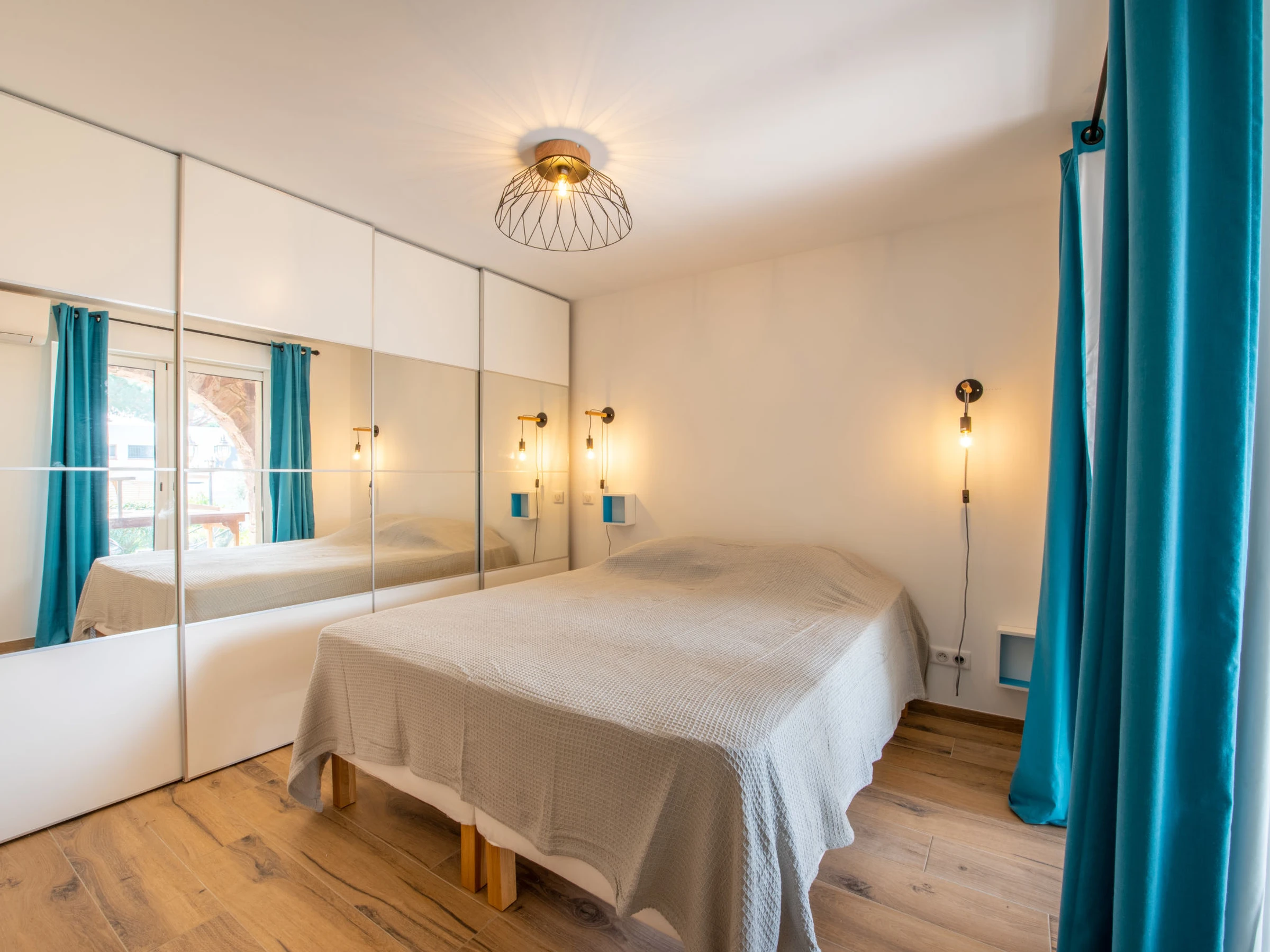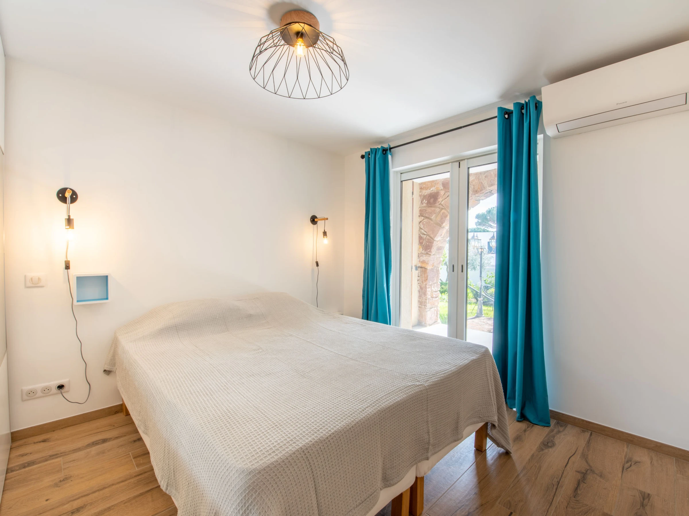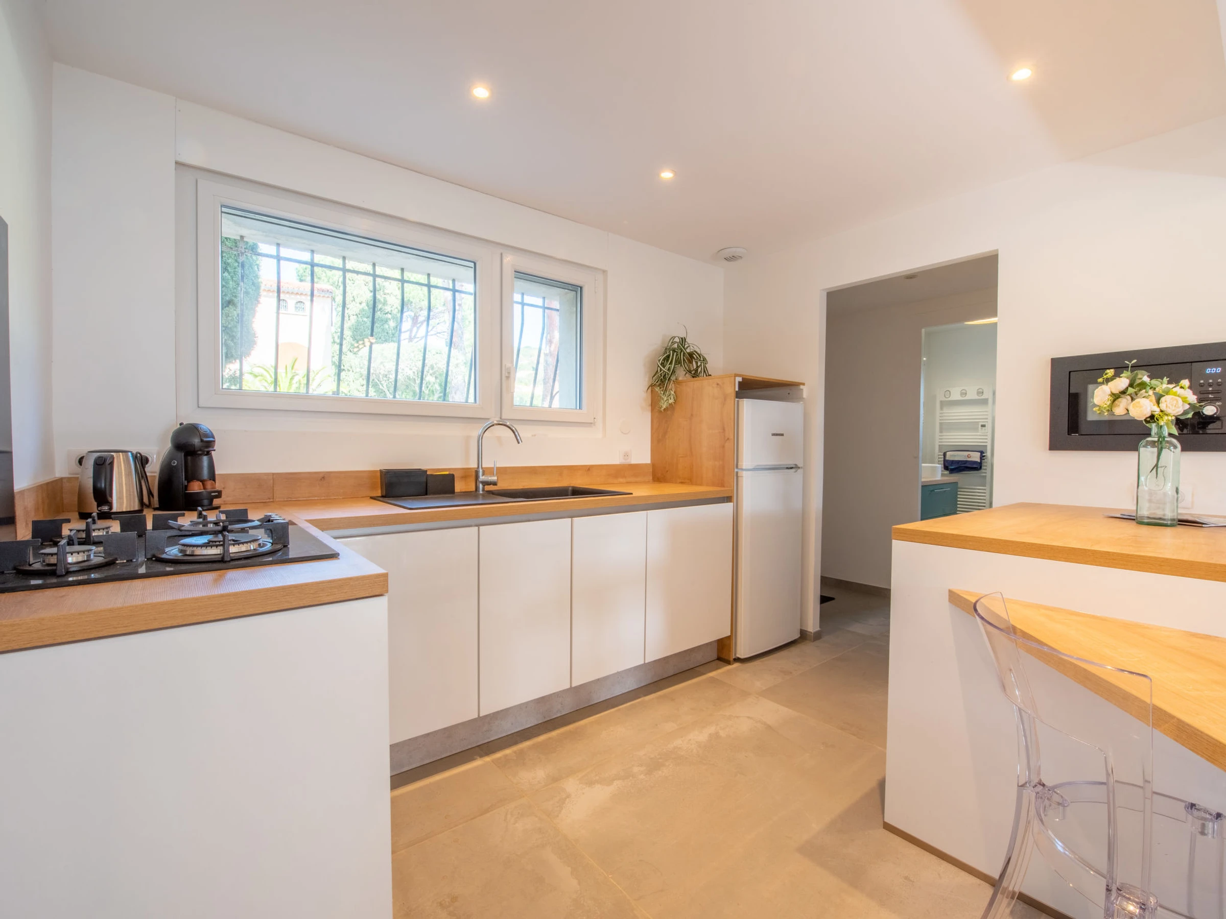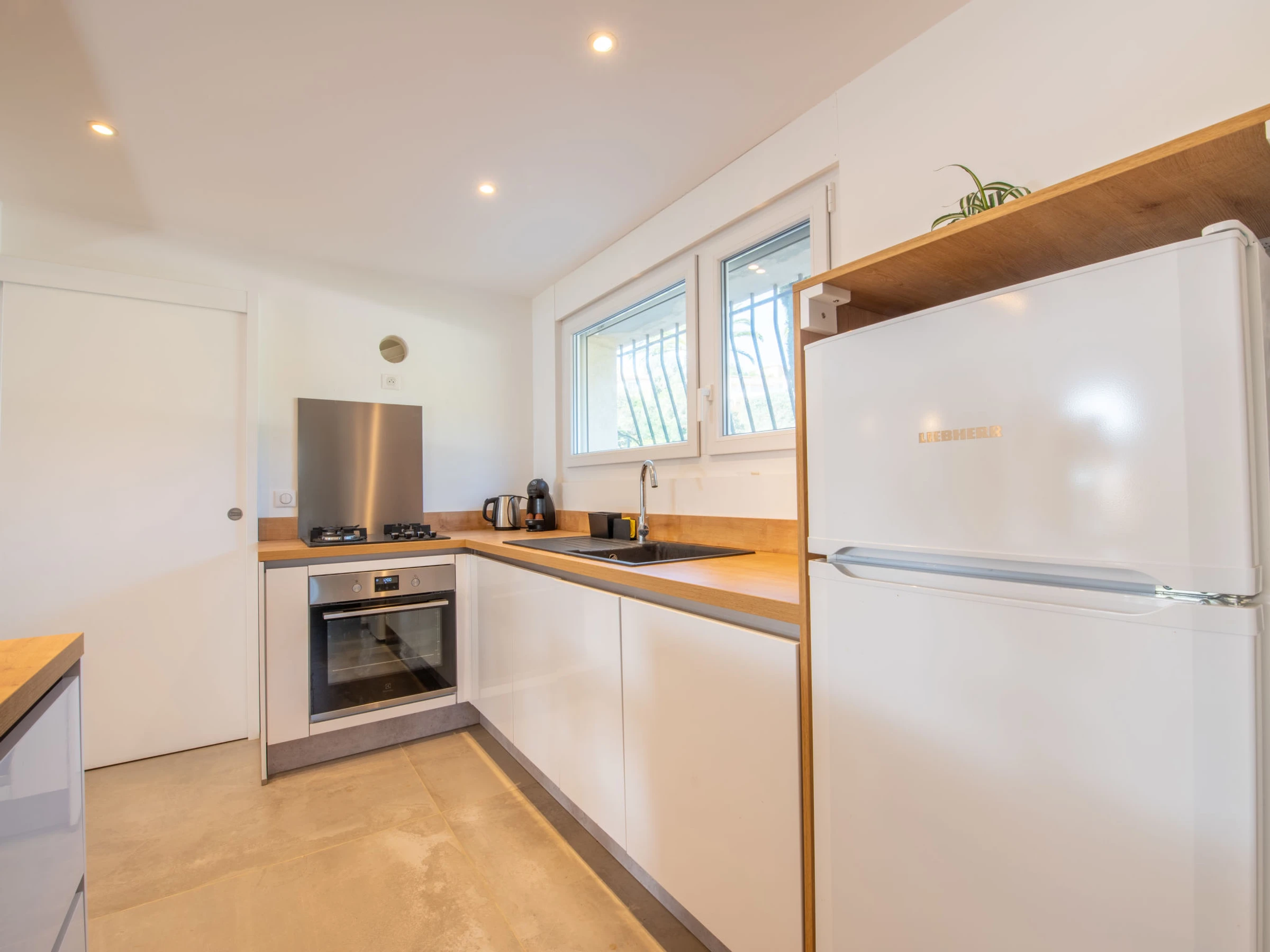 2-room apartment 55 m2, on the ground floor, south facing position. Renovated in 2023, comfortable and modern furnishings: living room with 1 double sofabed (140 cm, length 200 cm), TV (flat screen). Exit to the terrace. 1 room with Dressing room with 1 french bed (160 cm, length 200 cm). Exit to the terrace. Kitchen-/living room (oven, dishwasher, 4 gas rings, toaster, kettle, microwave, freezer, electric coffee machine, Capsules for coffee machine (Dolce Gusto) extra). Shower, sep. WC. Electric heating, air-conditioning, boiler (250 litres). Terrace 25 m2, south facing position, large garden. Terrace furniture, deck chairs (4). Beautiful view of the swimming pool and the garden. Facilities: washing machine, iron, hair dryer. Internet (WiFi, free). Parking (fenced 3 cars). Please note: TV only FR. Smoke alarm. Offer by a private individual according to Art. 155, IV of CGI.