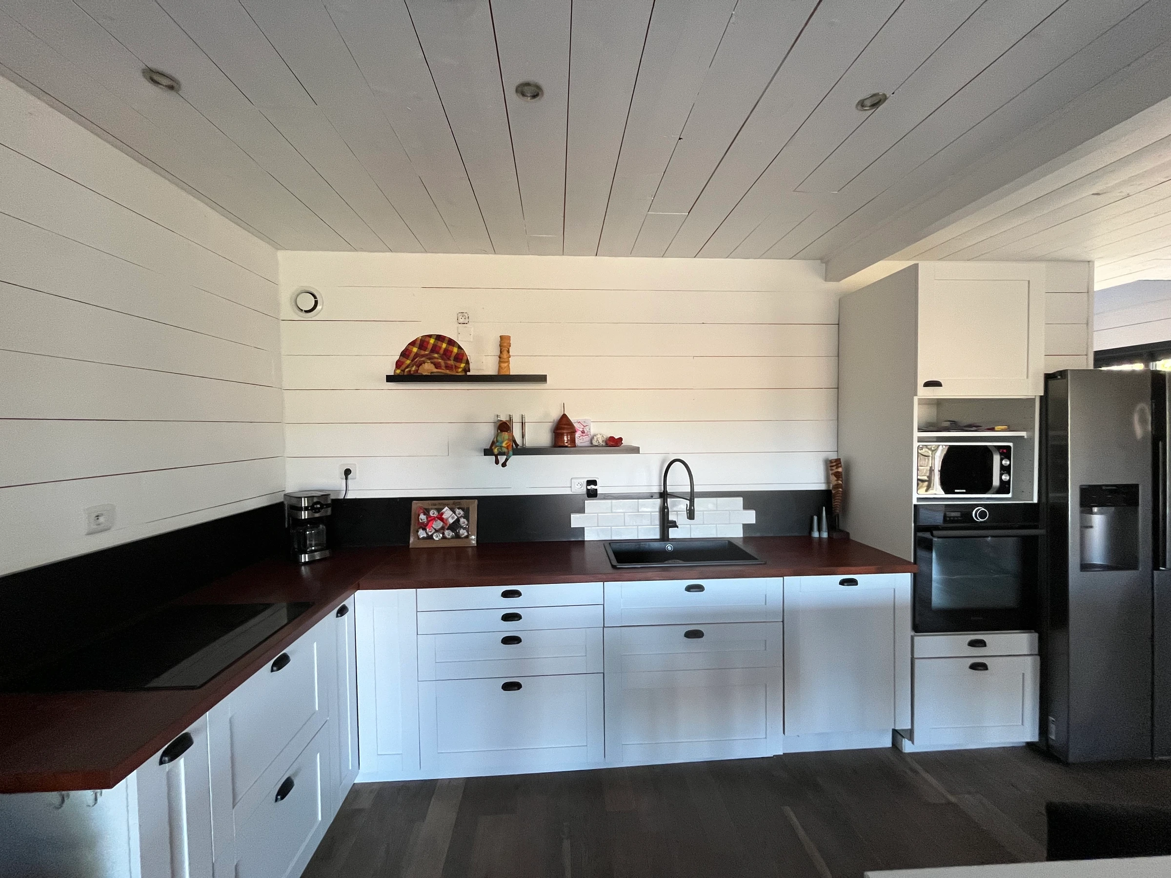 You can park two cars in the garage in front of the house. The entrance leads to the fully equipped kitchen with a stovetop, fridge/freezer, dishwasher, oven, microwave, and filter coffee maker.