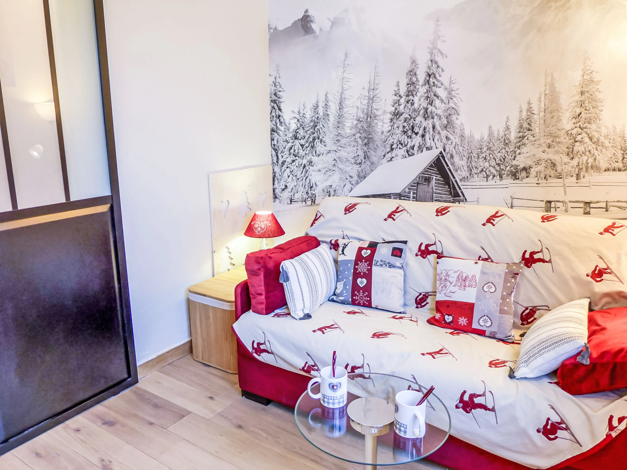 1-room studio 12 m2 on 4th floor, east facing position. Living/dining room with 1 double sofabed (140 cm, length 190 cm), TV. Kitchenette (1 induction hot plates, kettle, microwave, electric coffee machine). Shower/WC. Beautiful view of the mountains. Facilities: Internet (WiFi, extra). Please note: TV only FR. Smoke alarm. mini fridge. [hidden]