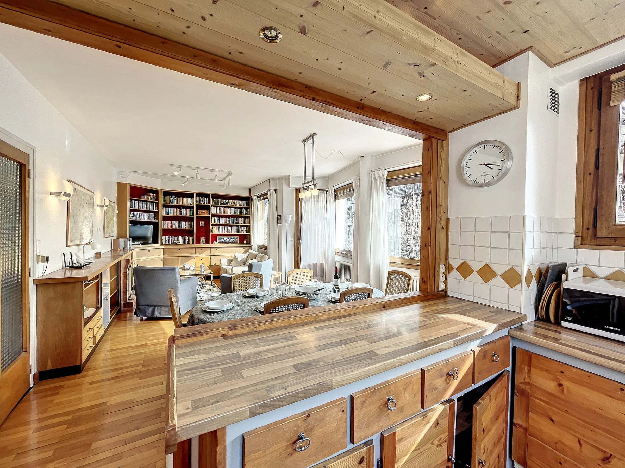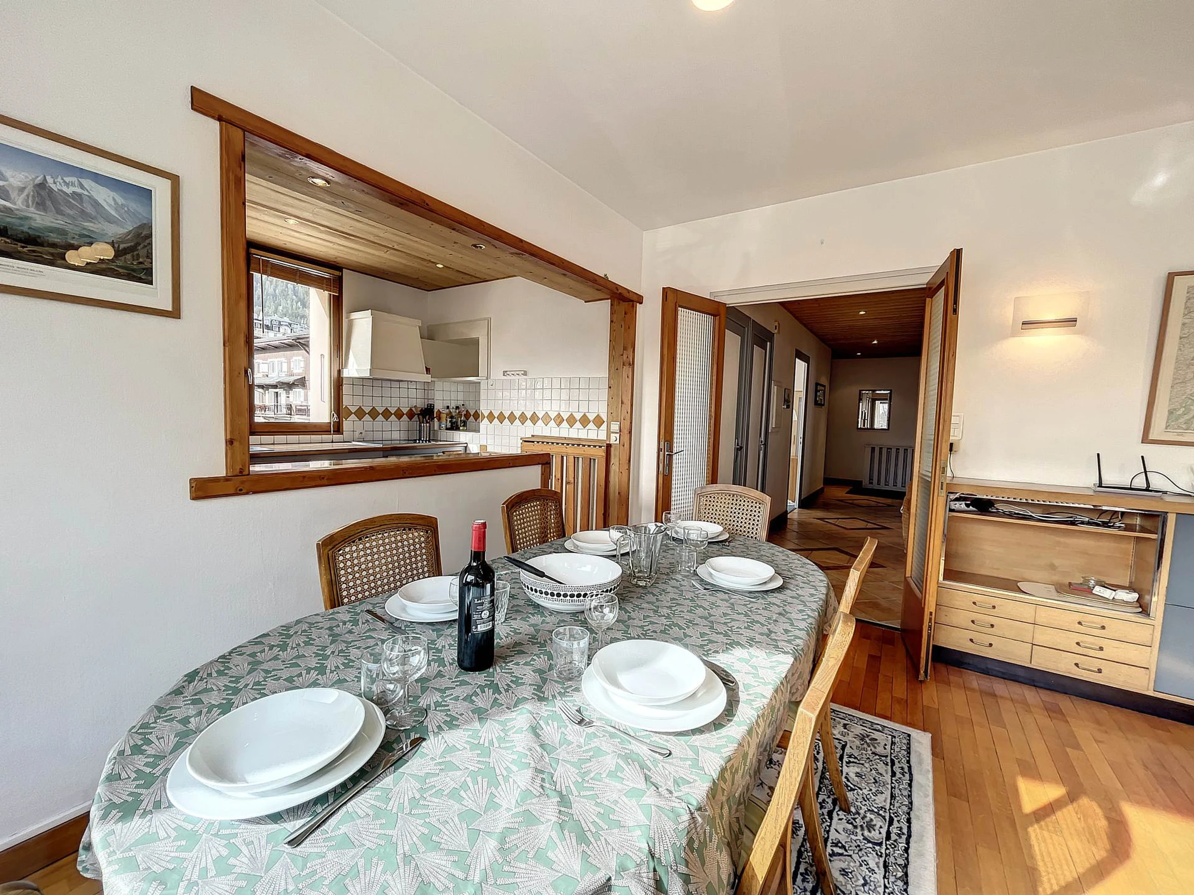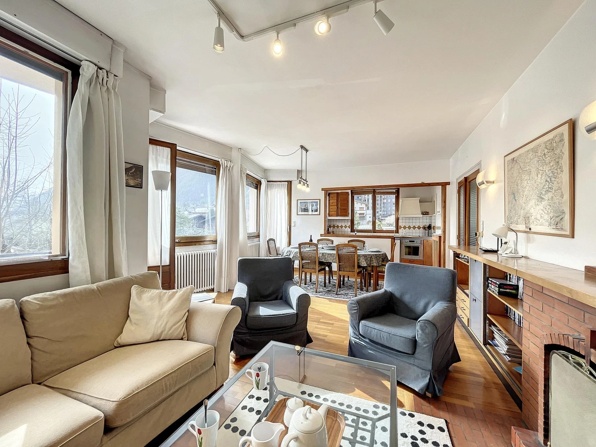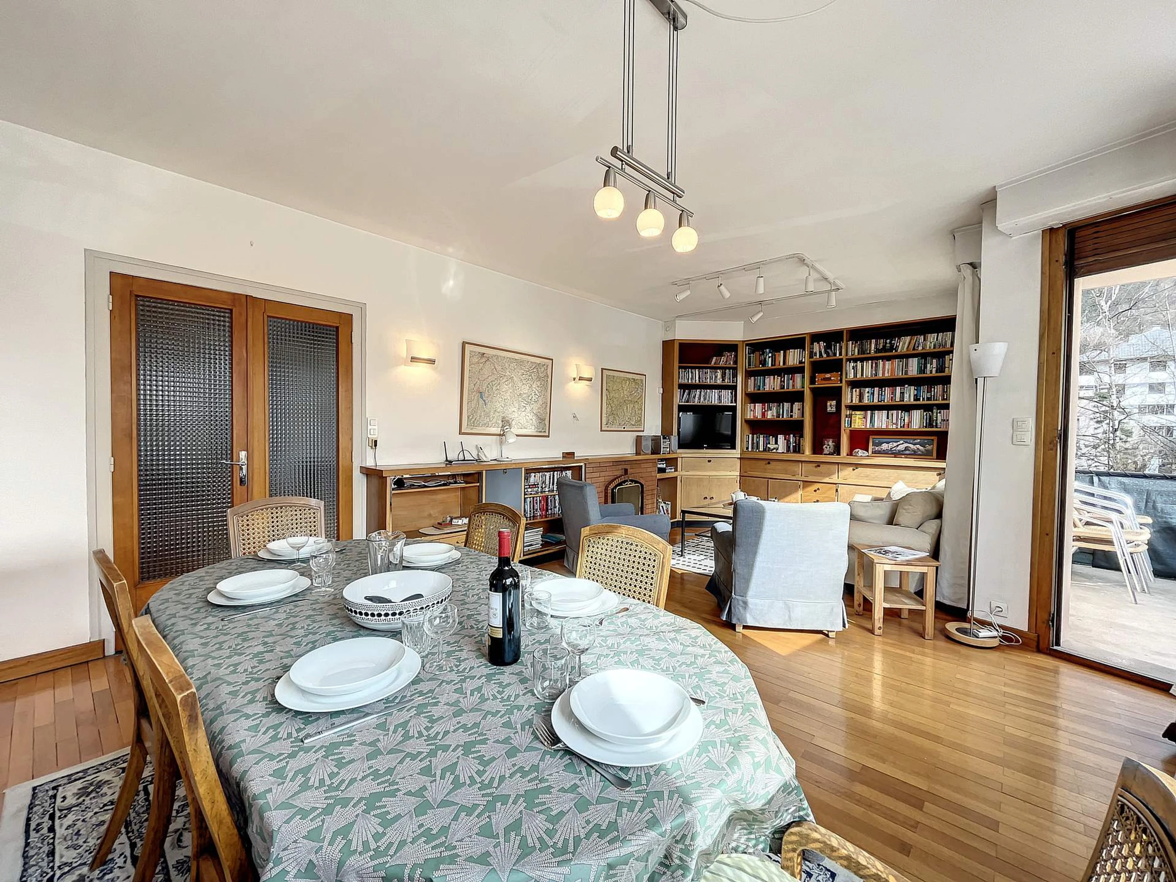A living/dining room giving access to two sunny balconies facing South-West with a magnificent view on the Brevent, the Aiguille du Midi and the Mont-Blanc