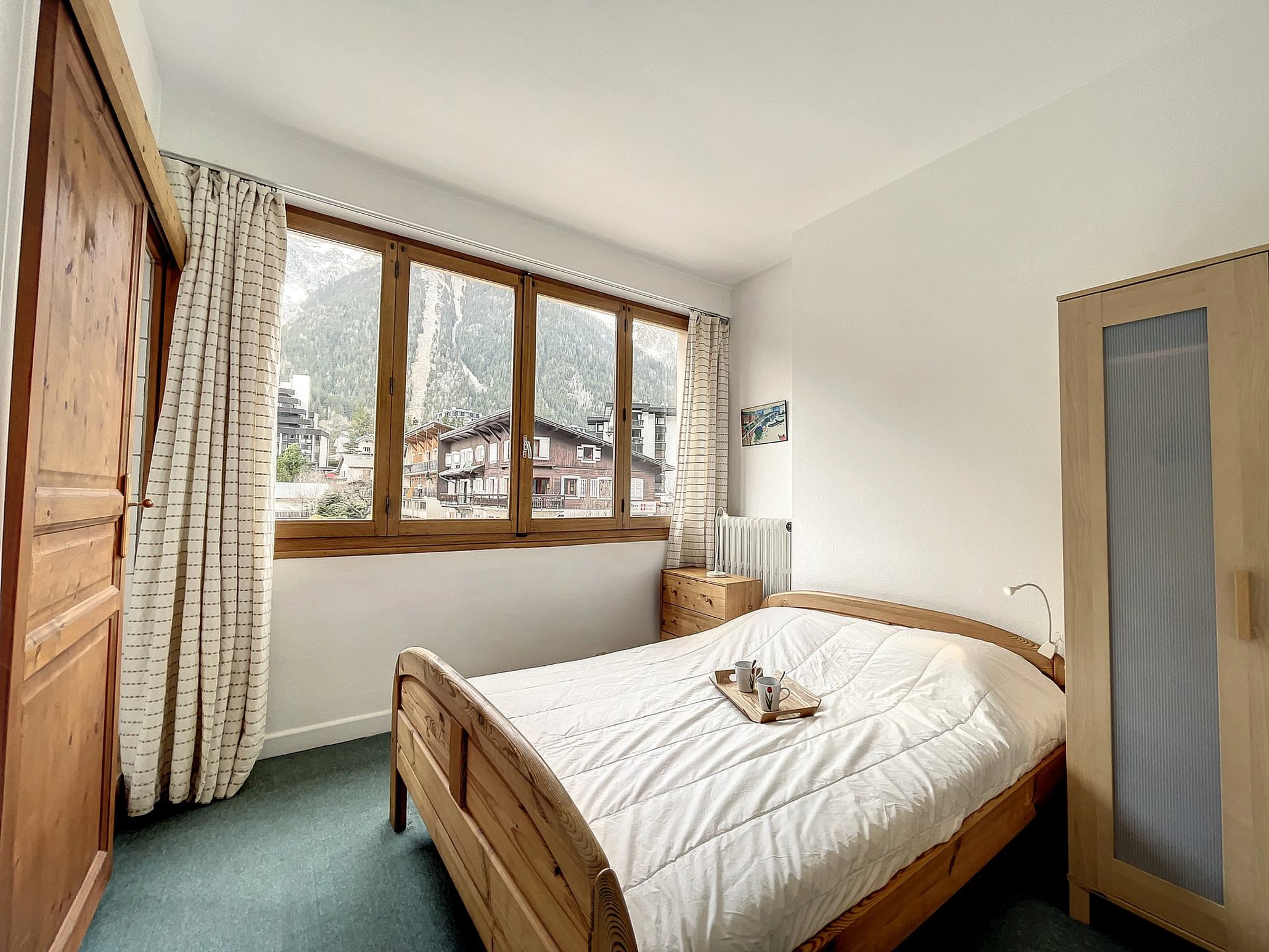A 2nd bedroom with 2 single beds (90x190cm) facing South-East with a view on the Aiguille du Midi. Carpet on the floor