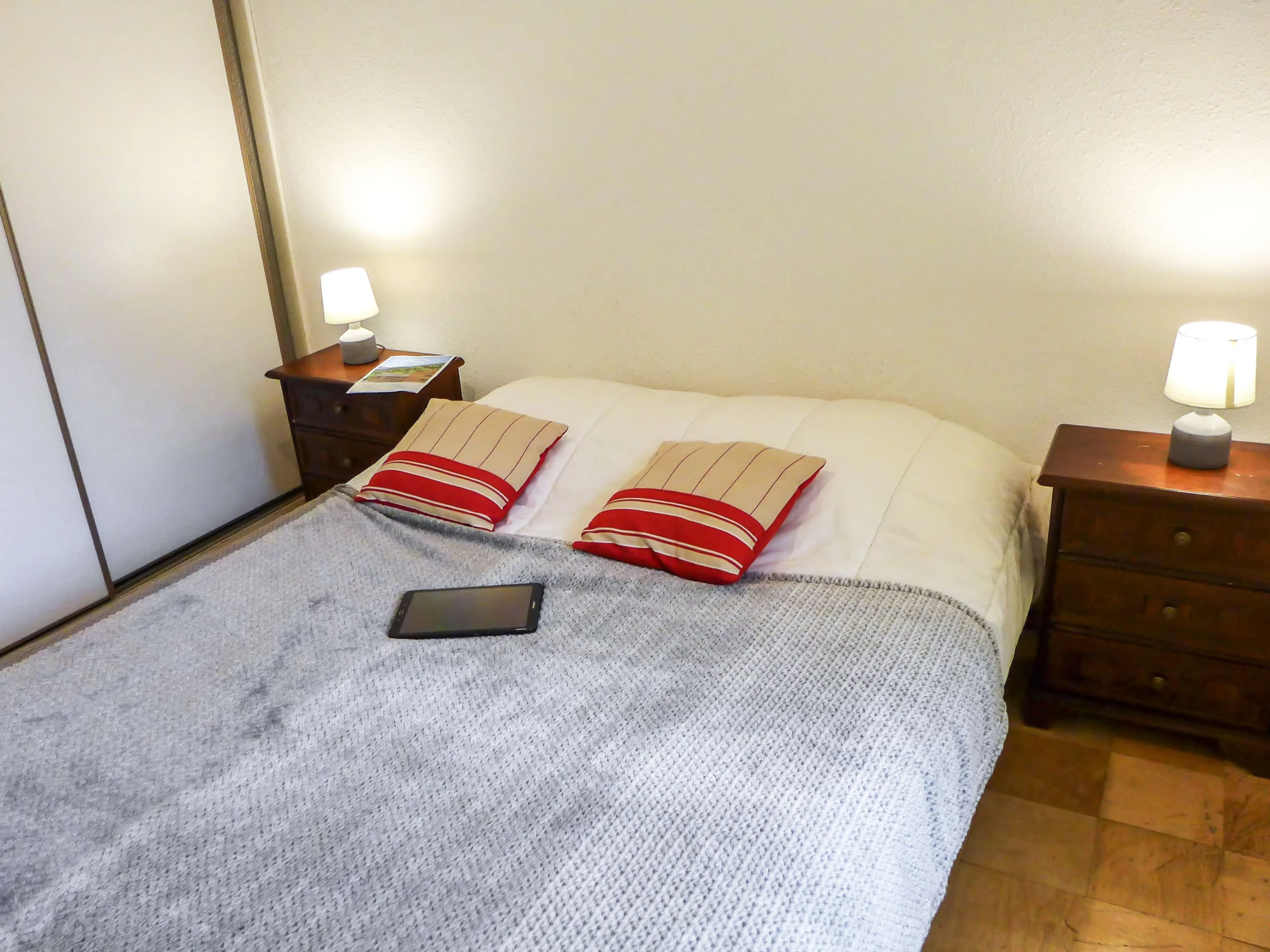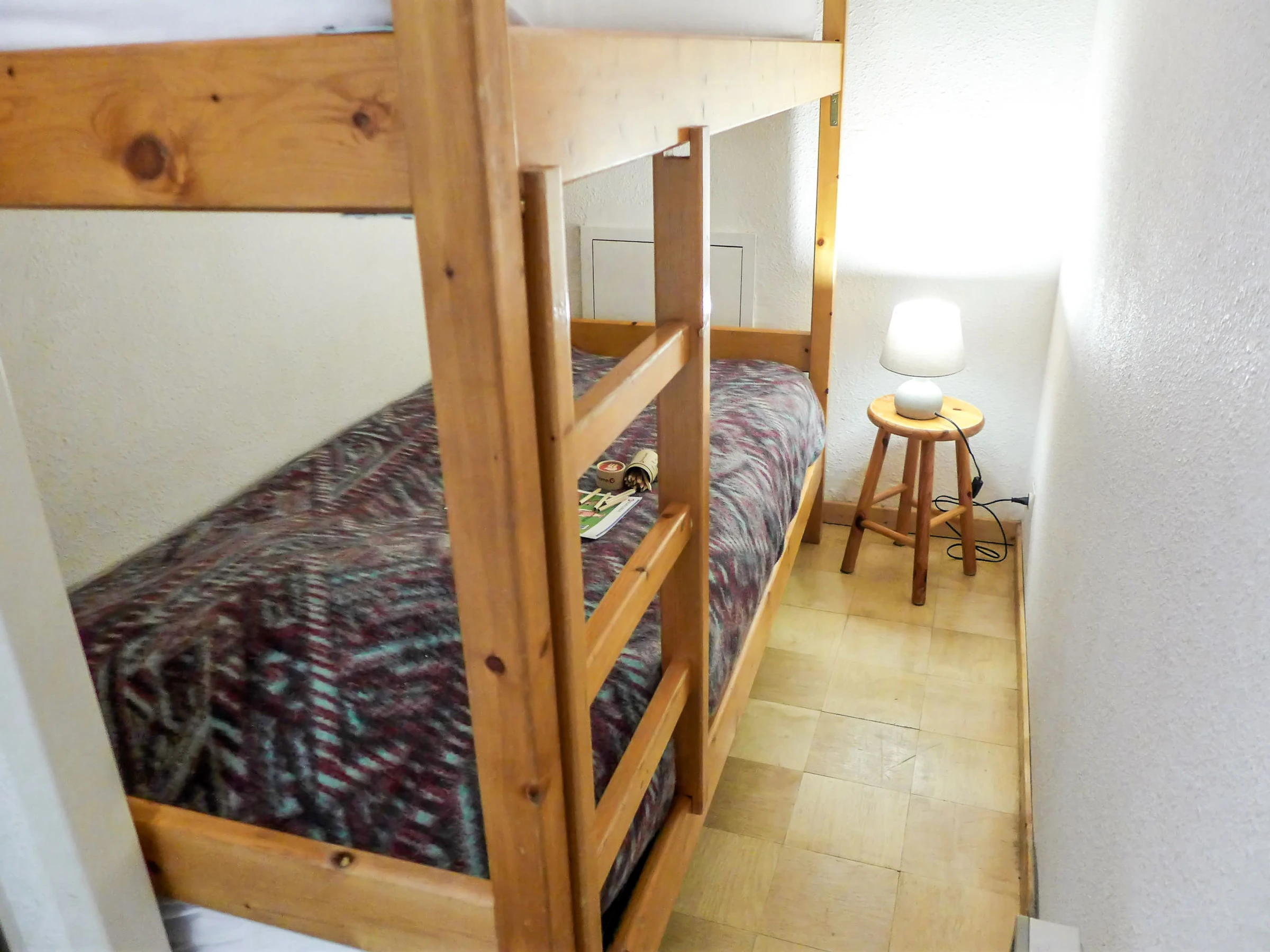 2-room apartment 42 m2 on 3rd floor. Simple furnishings: living/dining room with TV. Exit to the balcony. Alcove with 1 x 2 bunk beds (90 cm, length 190 cm). 1 room with 1 french bed (140 cm, length 190 cm). Kitchenette (oven, dishwasher, 2 ceramic glass hob hotplates, microwave, electric coffee machine, Capsules for coffee machine (Tassimo) extra). Shower, sep. WC. Electric heating. Balcony, north-east facing position. View of the mountains. Facilities: washing machine. Internet (WiFi, extra). Garage space n 34 petite voiture. Please note: TV only FR. Smoke alarm. Instead of an enclosed bedroom, some sleeping areas are located in an open-plan area (gallery, alcove, etc.). [hidden]