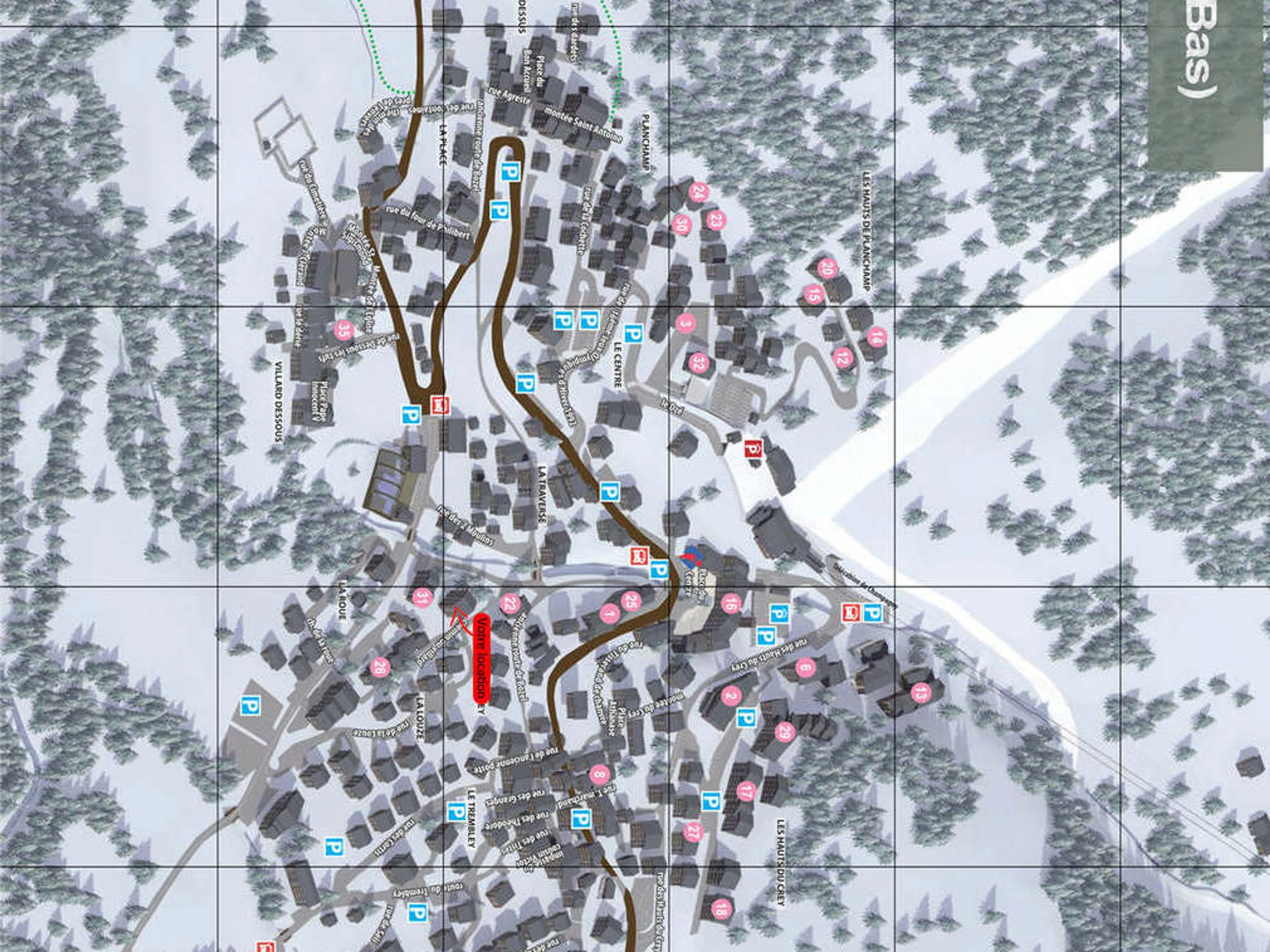 Near the swimming pool, 200 m on foot from the shops and the lift for the cable car to Champagny / la Plagne ski area.
