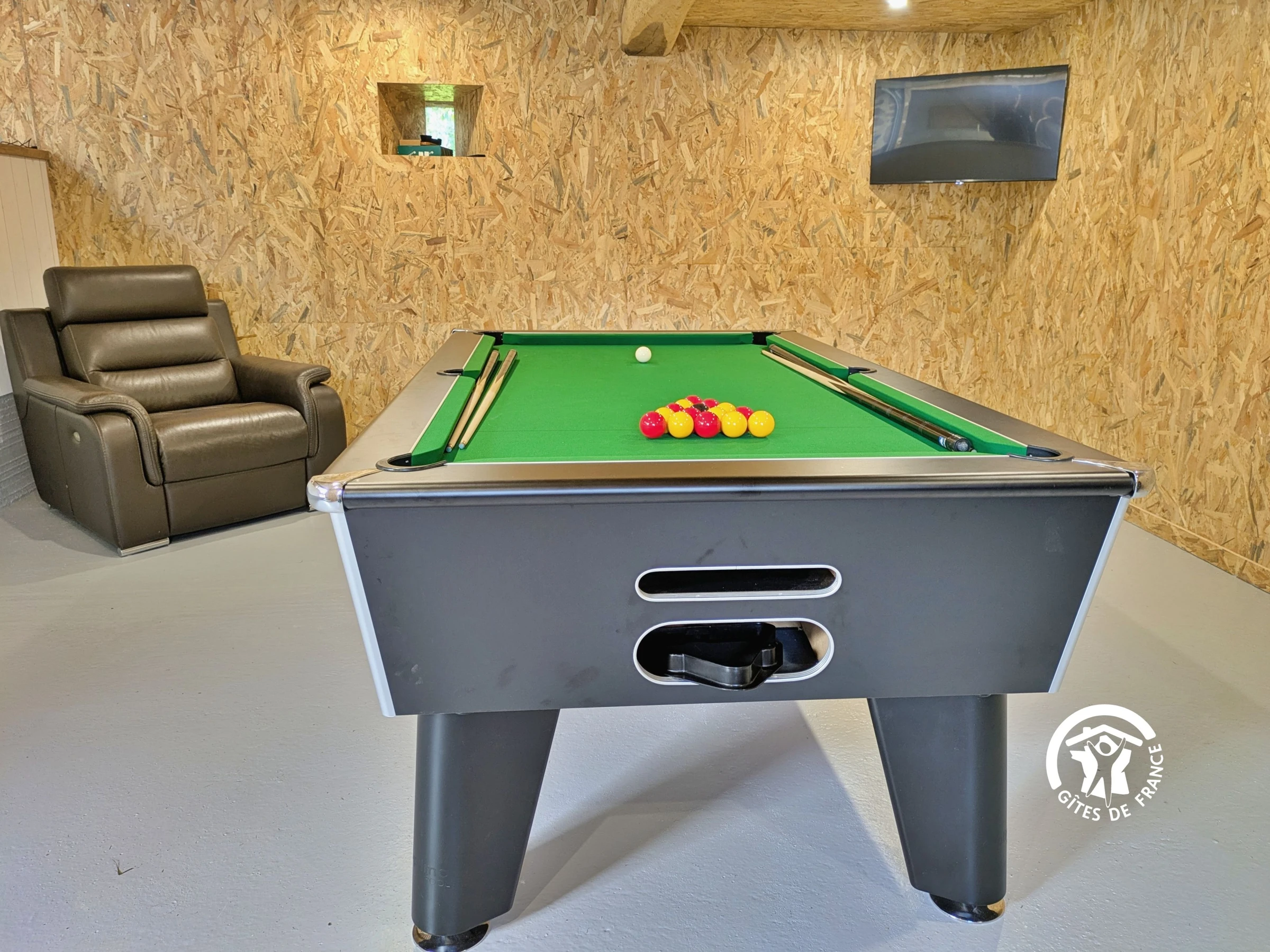 Games room opposite the house (62 m²): sofa, ping-pong table, pool table, darts, foosball, speaker, television.