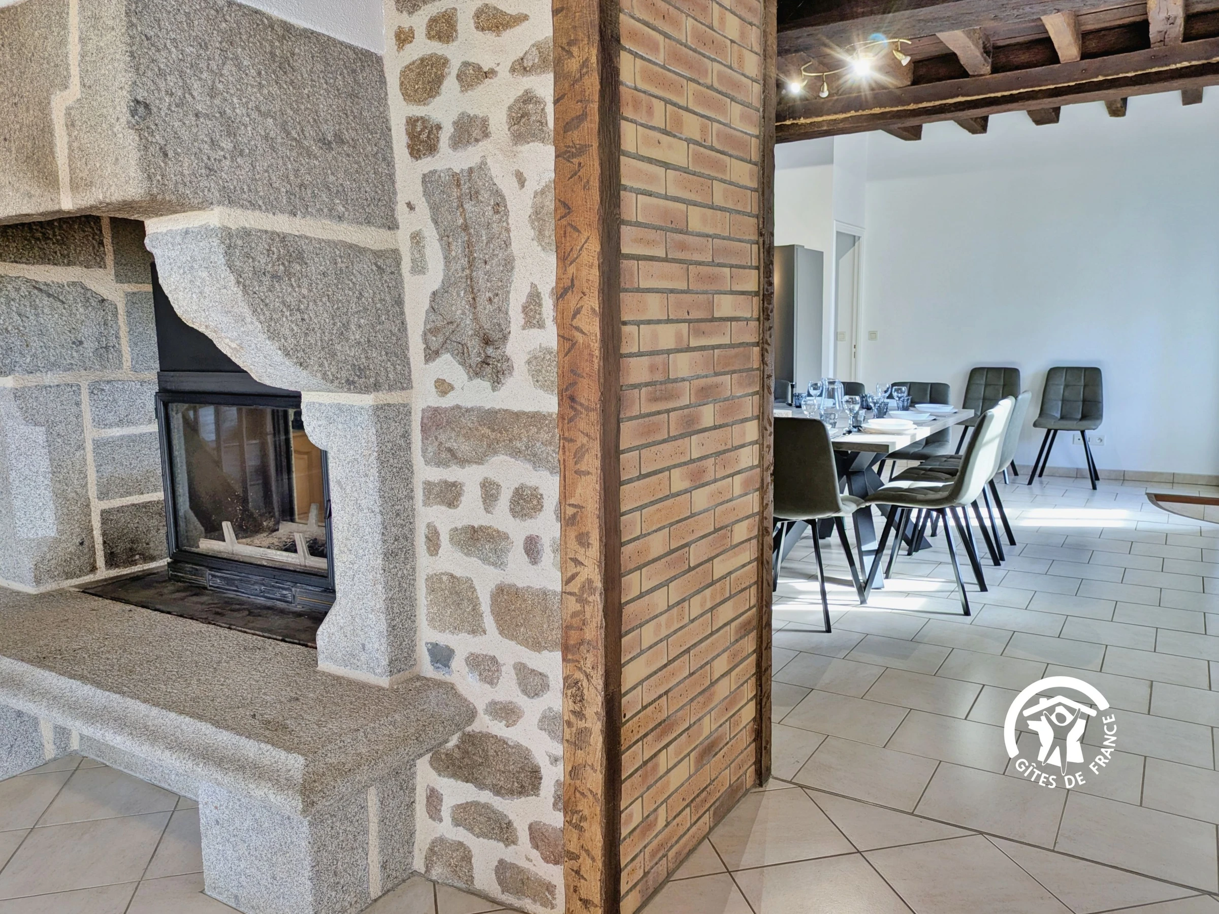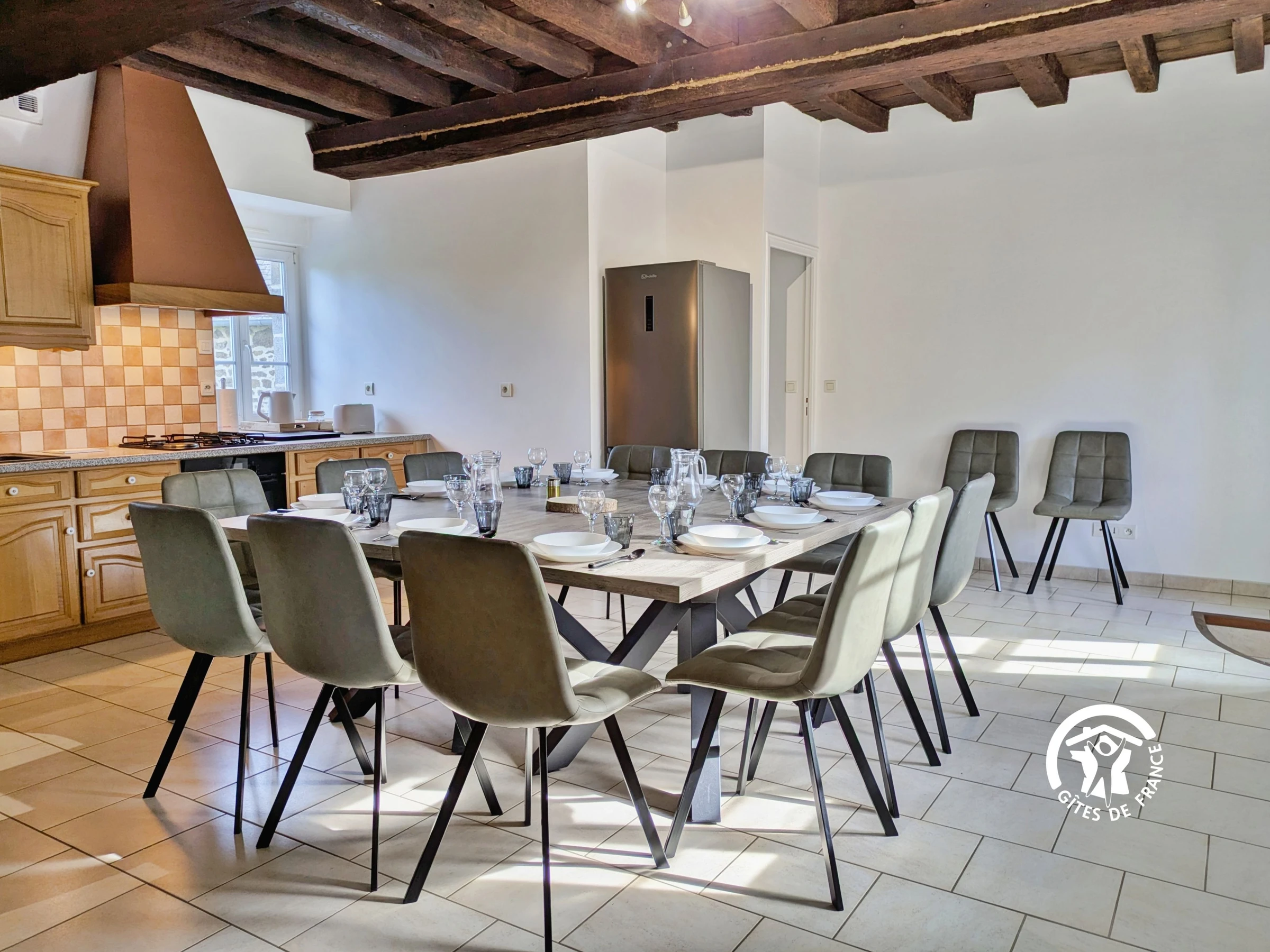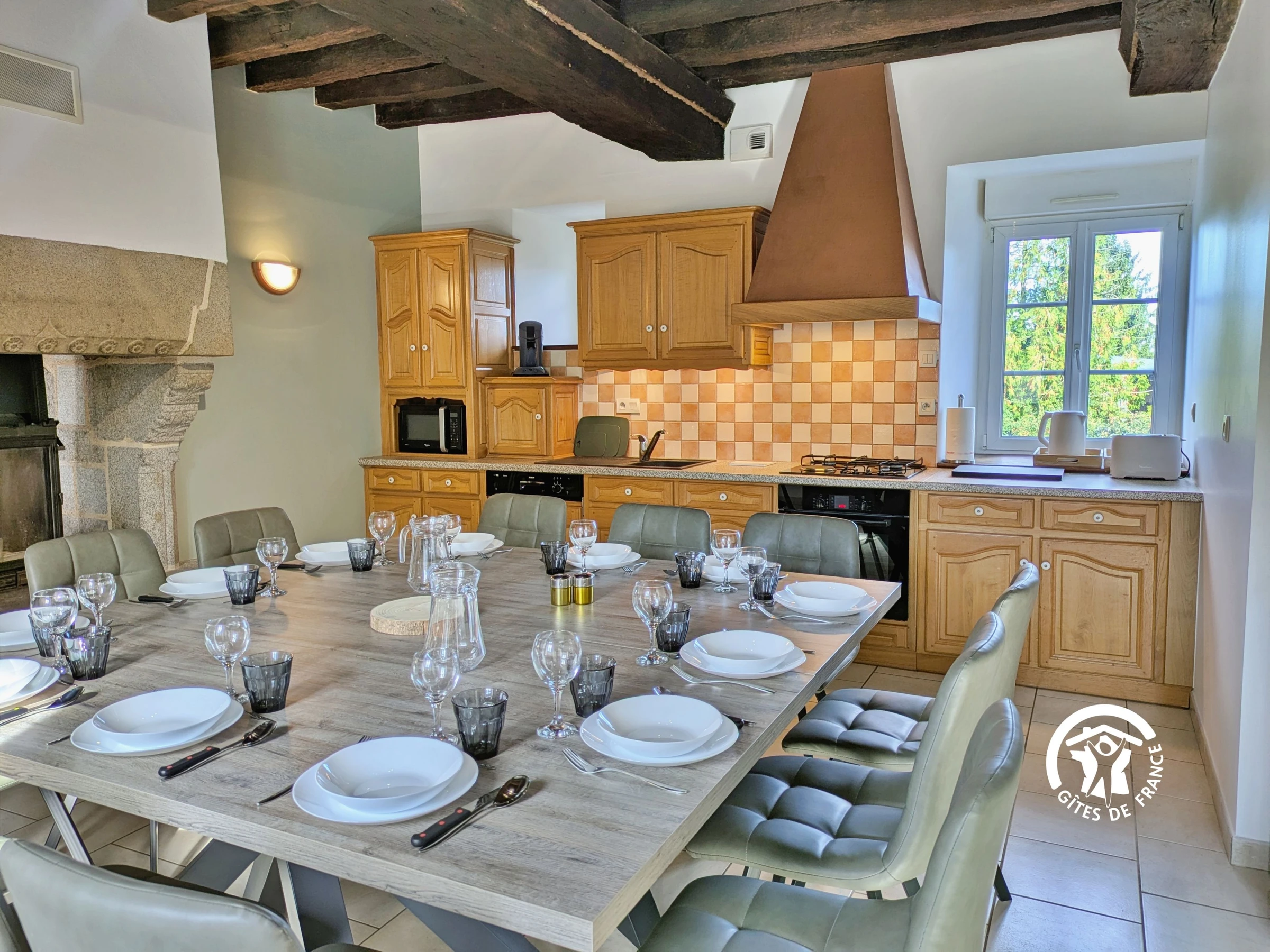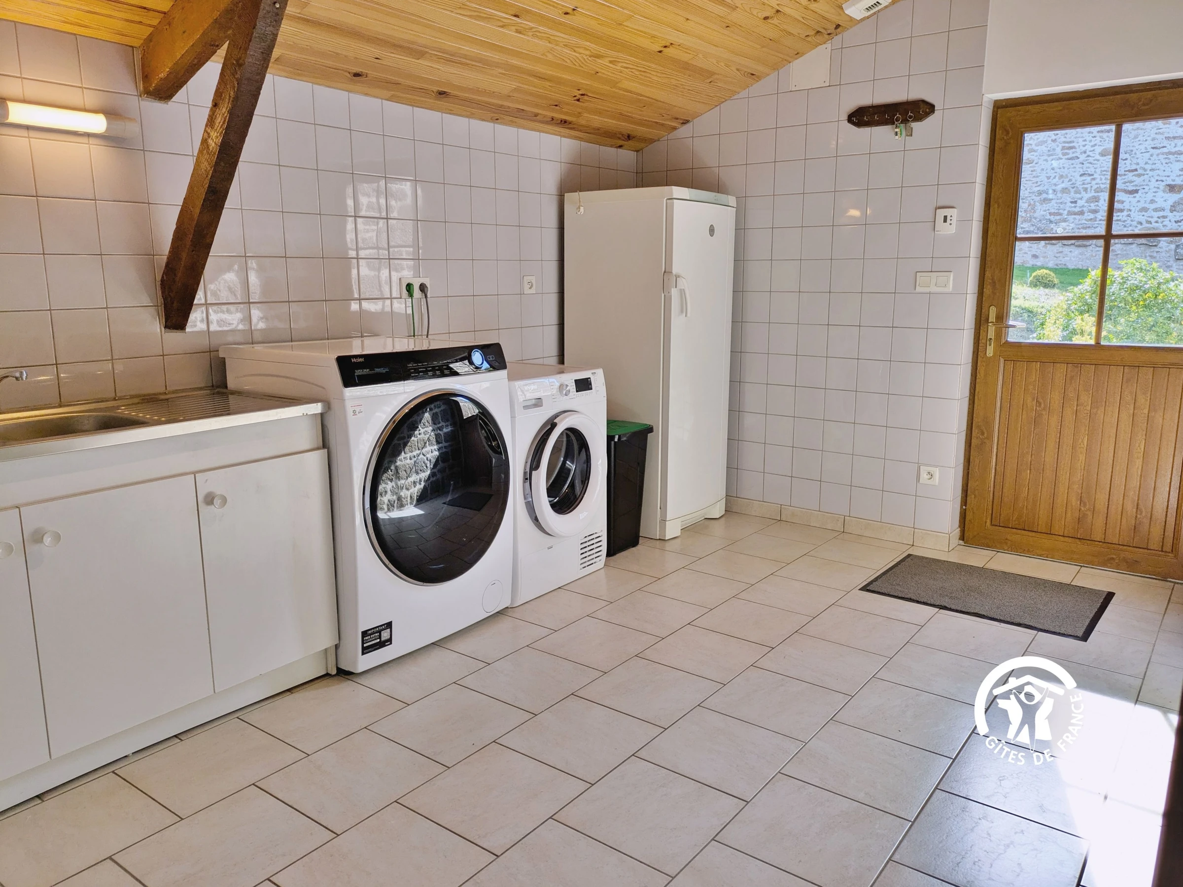 LEVEL 0: Open-plan living room/kitchen (36m²): sofas, armchairs, television with decoder (numerous channels), wood-burning fireplace overlooking the living room and kitchen - Fully equipped kitchen (32m²): sink, oven, 4-burner gas hob, extractor hood, microwave, toaster, kettle, filter coffee maker, Senseo pod coffee maker, dishwasher, refrigerator, freezer, blender, 2 3-in-1 raclette grills (grilling stone, grill, crepe maker), modular table (square or rectangular) - Shower room (2.1m²): shower, washbasin - Separate WC with hand basin (1.4m²) - Laundry room (11m²): sink, washing machine, tumble dryer, second refrigerator.