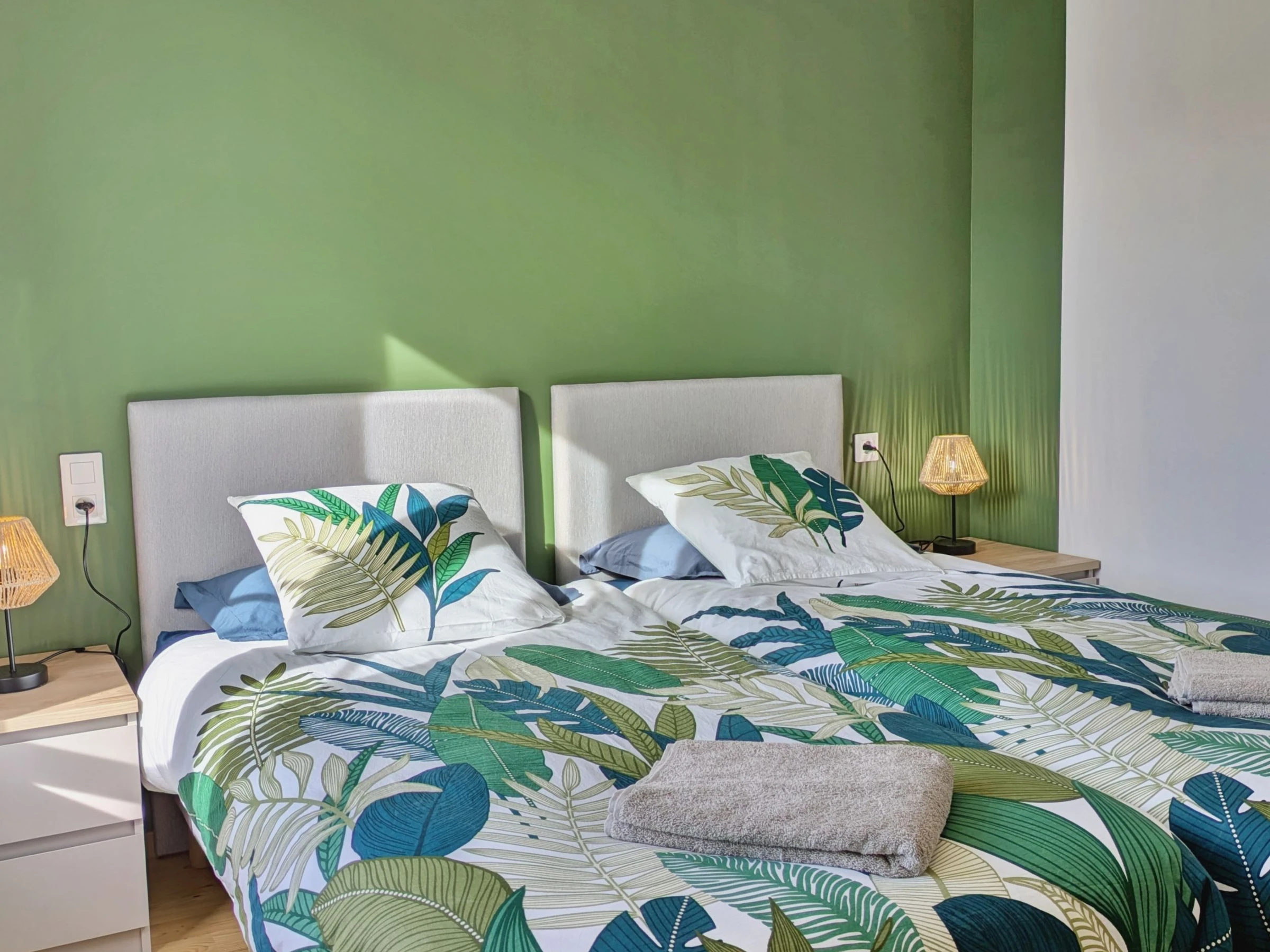 LEVEL 1: Bedroom 1 (11.7m²): 2 twin beds 90x200cm - Bedroom 2 (9.8m²): 2 twin beds 90x200cm - Bedroom 3 (13.6m²): 1 double bed 160x200cm - Bathroom (7.7m²): bathtub, shower, sink, towel warmer, hairdryer - Separate WC (2.2m²) - LEVEL 2: Bedroom 4 (15m² floor area and 12m² with a ceiling height of 1.80m): 2 twin beds 90x200cm - Bedroom 5 (27m² floor area, 18.7m² with a ceiling height of 1.80m): 4 single beds 90x200cm (2 of which can be made into a double bed 180x200cm) + 2 single beds 80x200cm (can be made into a double bed 180x200cm) 160x200 cm), - Bathroom (6.5 m² floor area, 5.5 m² ceiling height at 1.80 m): shower, sink, towel warmer, hairdryer, toilet.