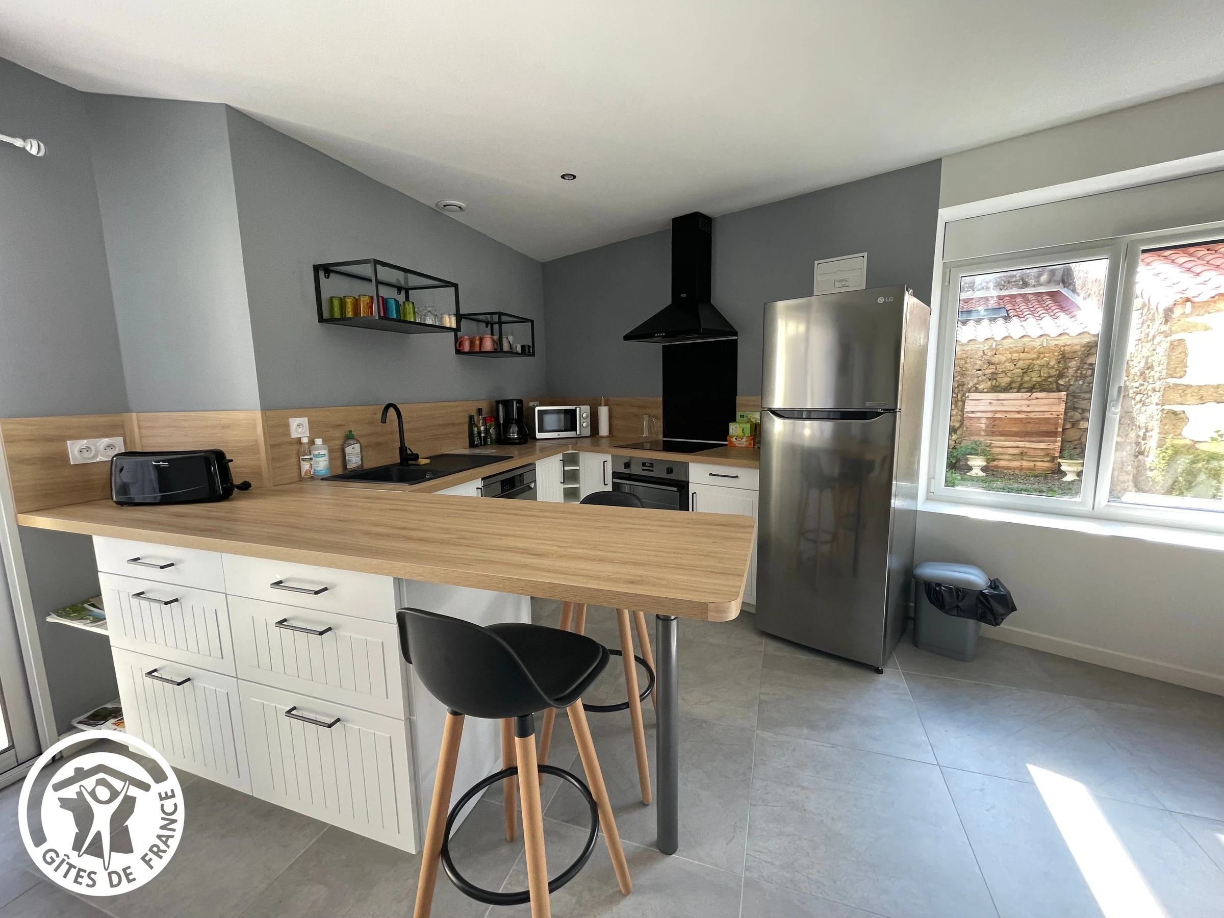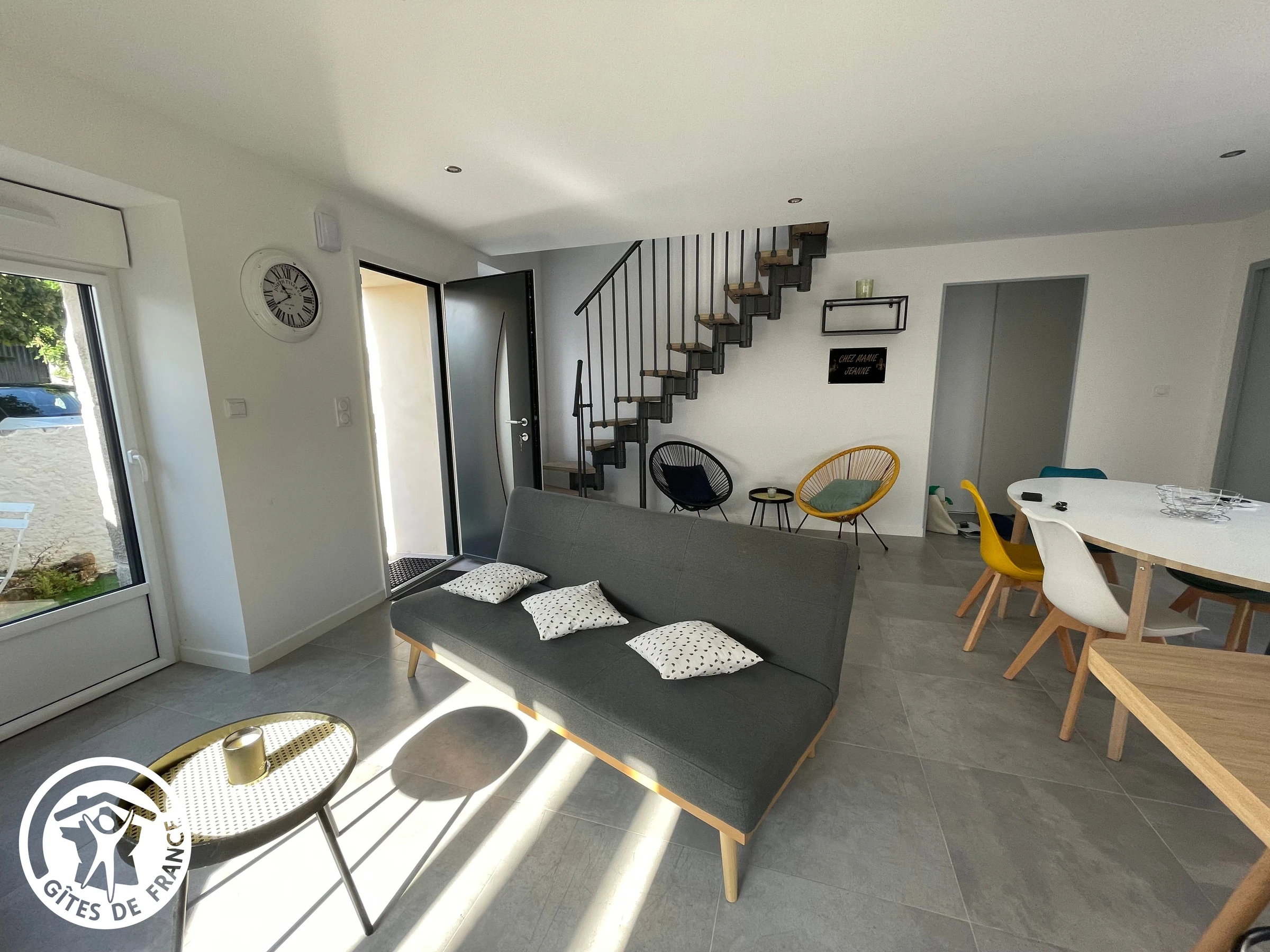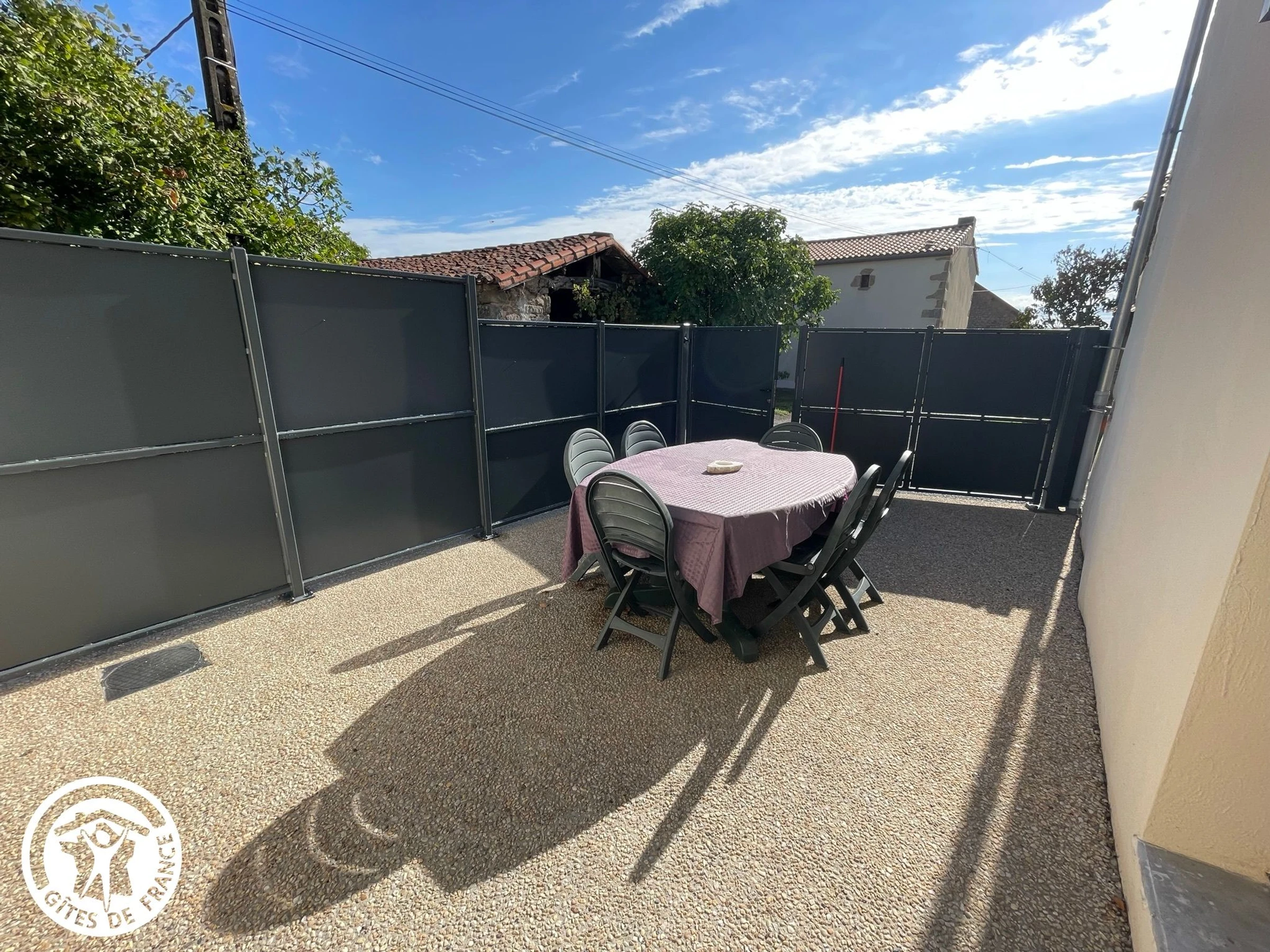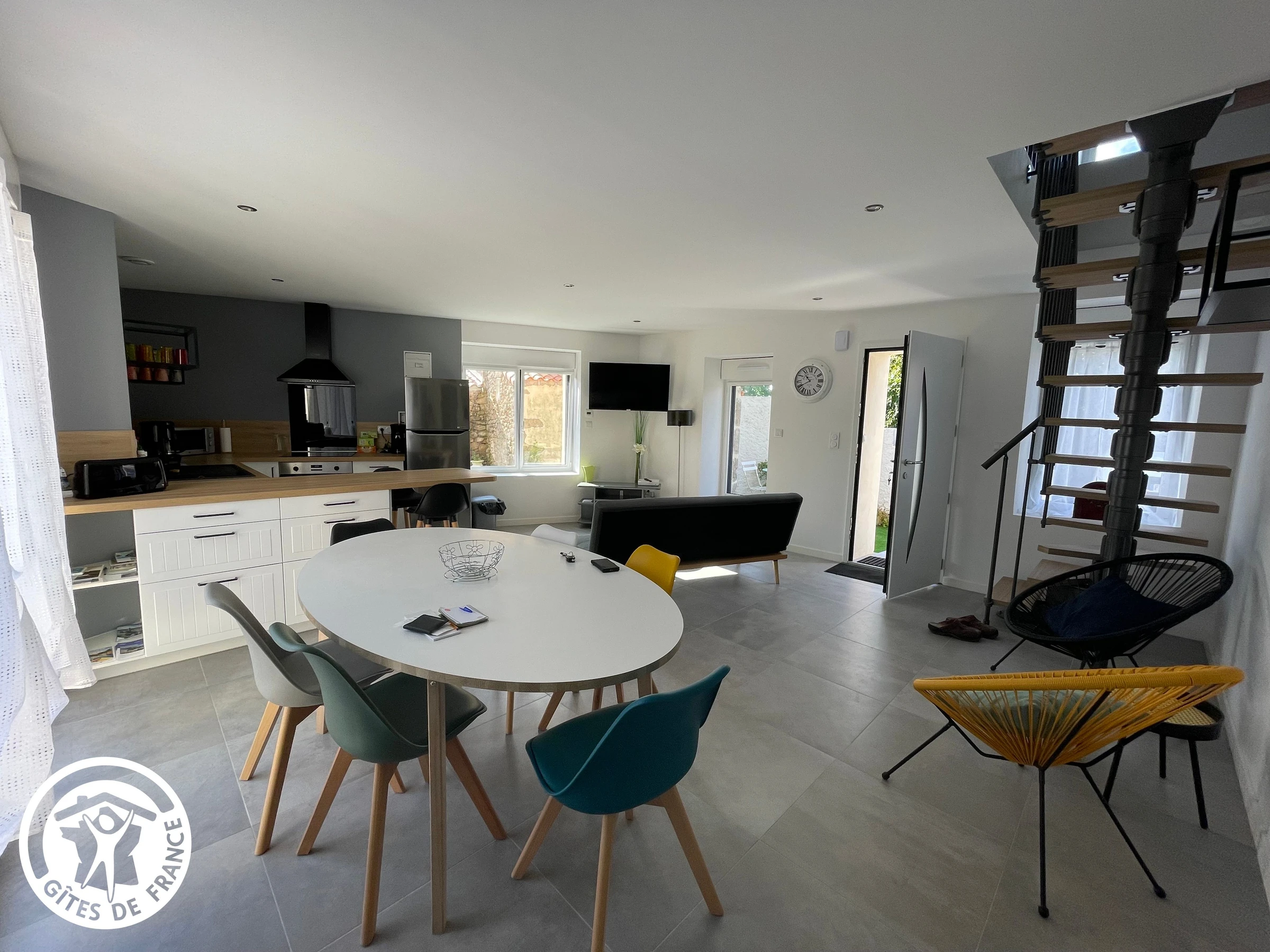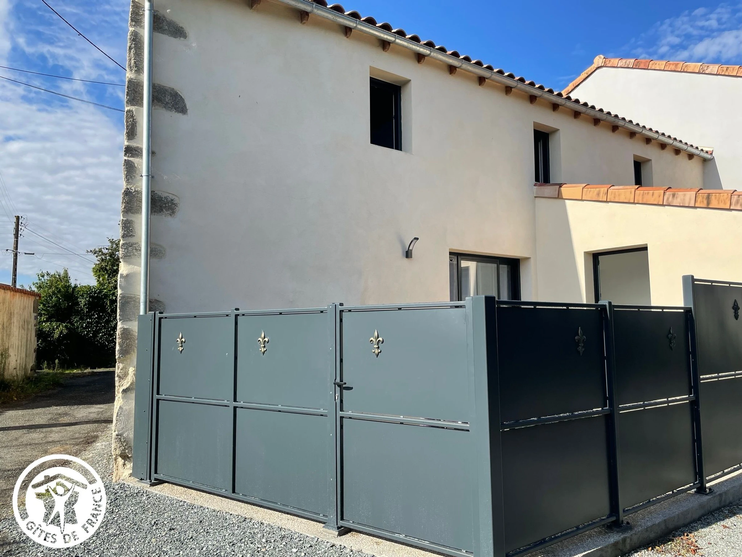 Gîte for 6 people in La Verrie (800m from the town center), adjoining another house, comprising on the ground floor a living/dining room/kitchen, a bedroom (1 double bed) with a private bathroom, a separate toilet, and a laundry room with a washing machine and dryer. Upstairs, a landing with a play area and children's books, 2 bedrooms (2 double beds) with 2 private bathrooms and toilets. Three fans are available. Wi-Fi. An outdoor terrace with a plancha grill and garden furniture is available. Bed linen and towels are provided.
