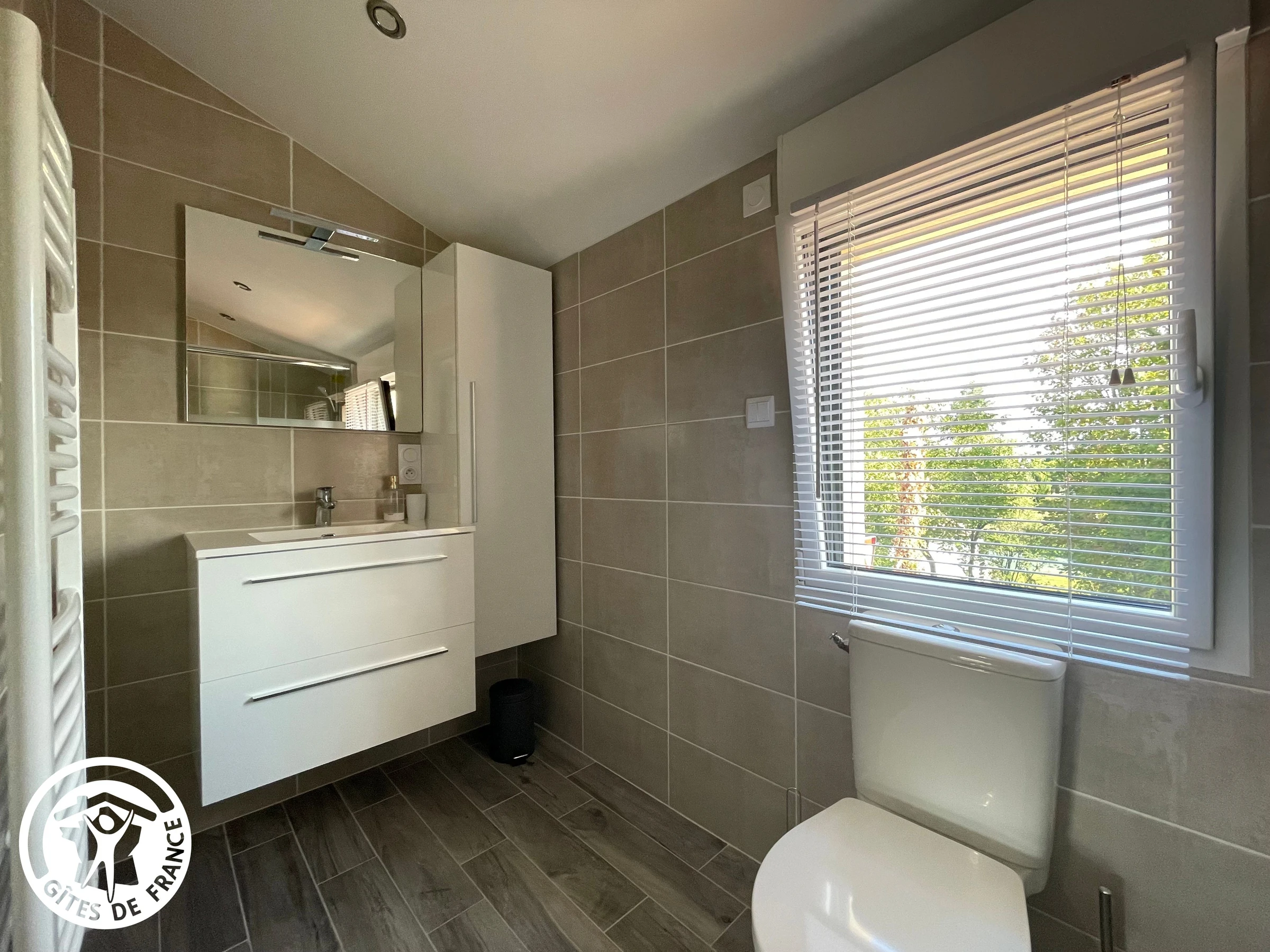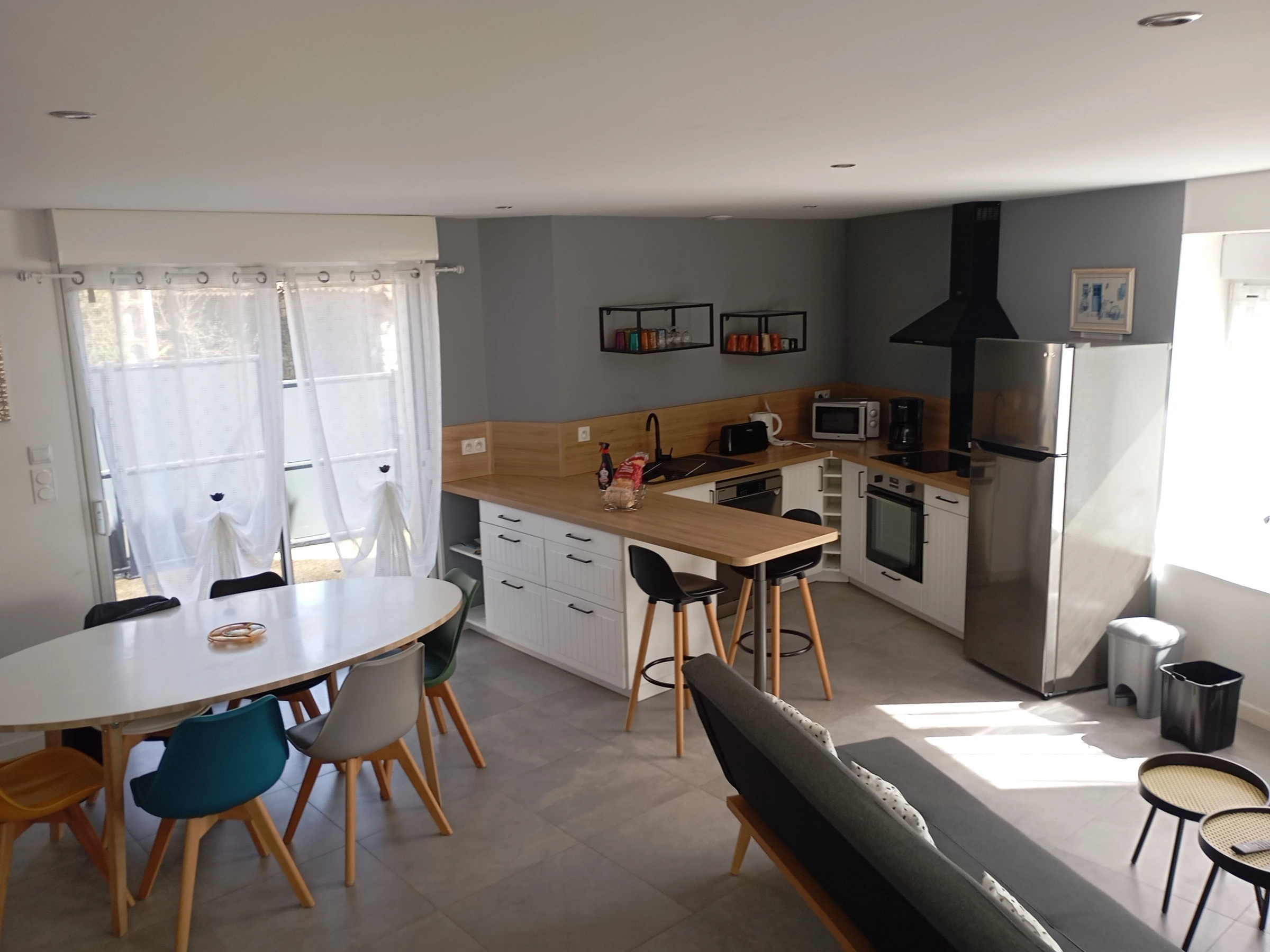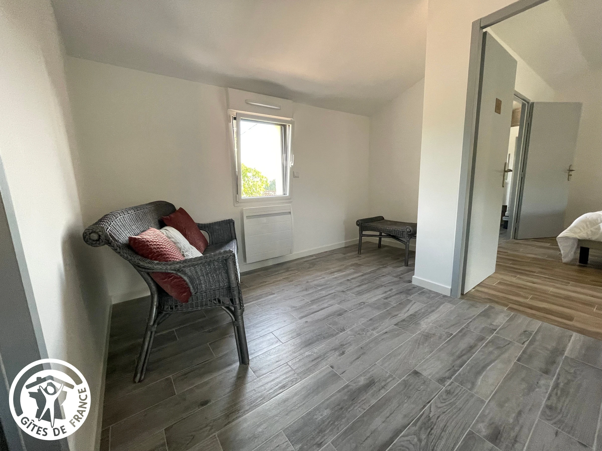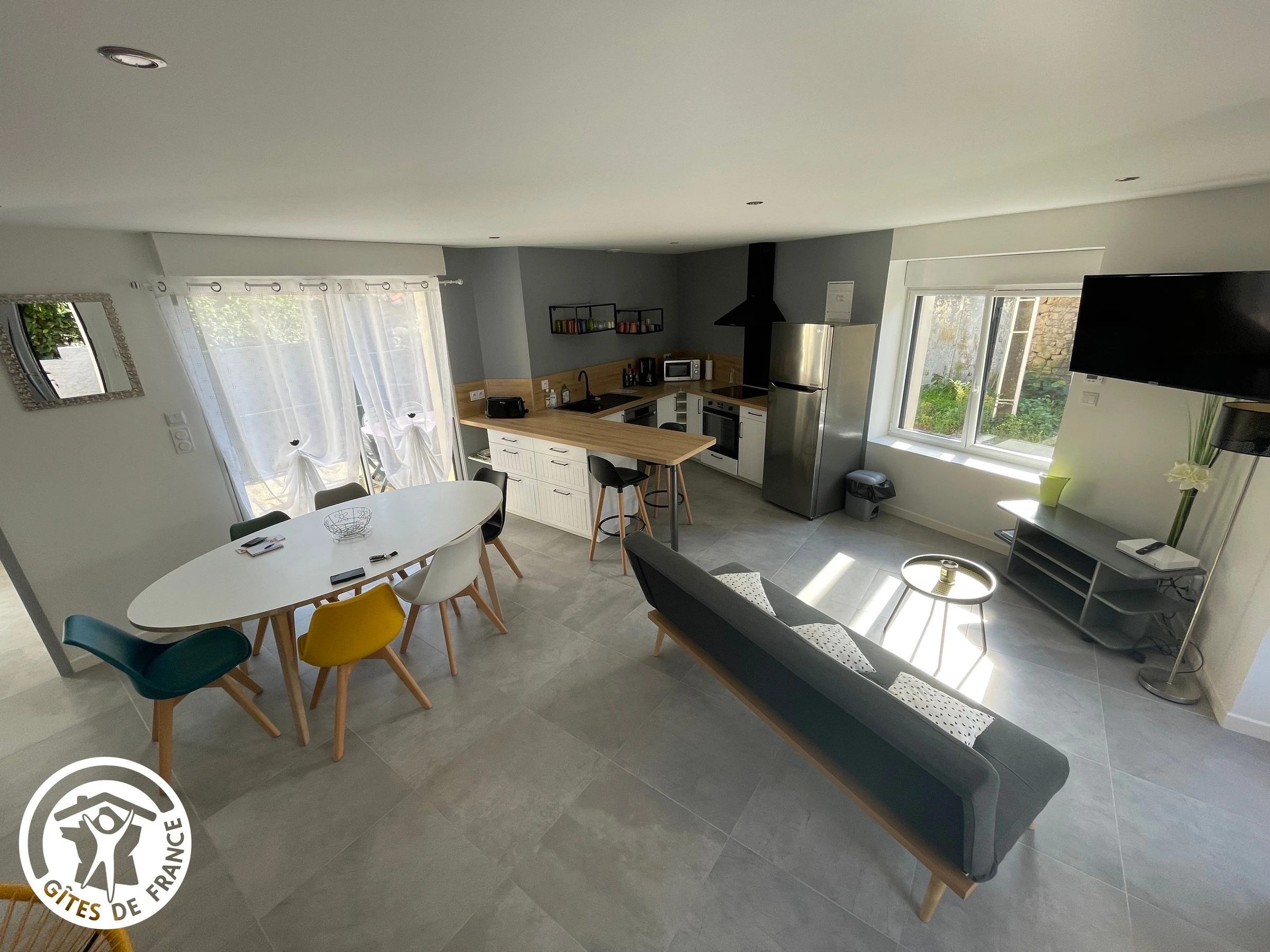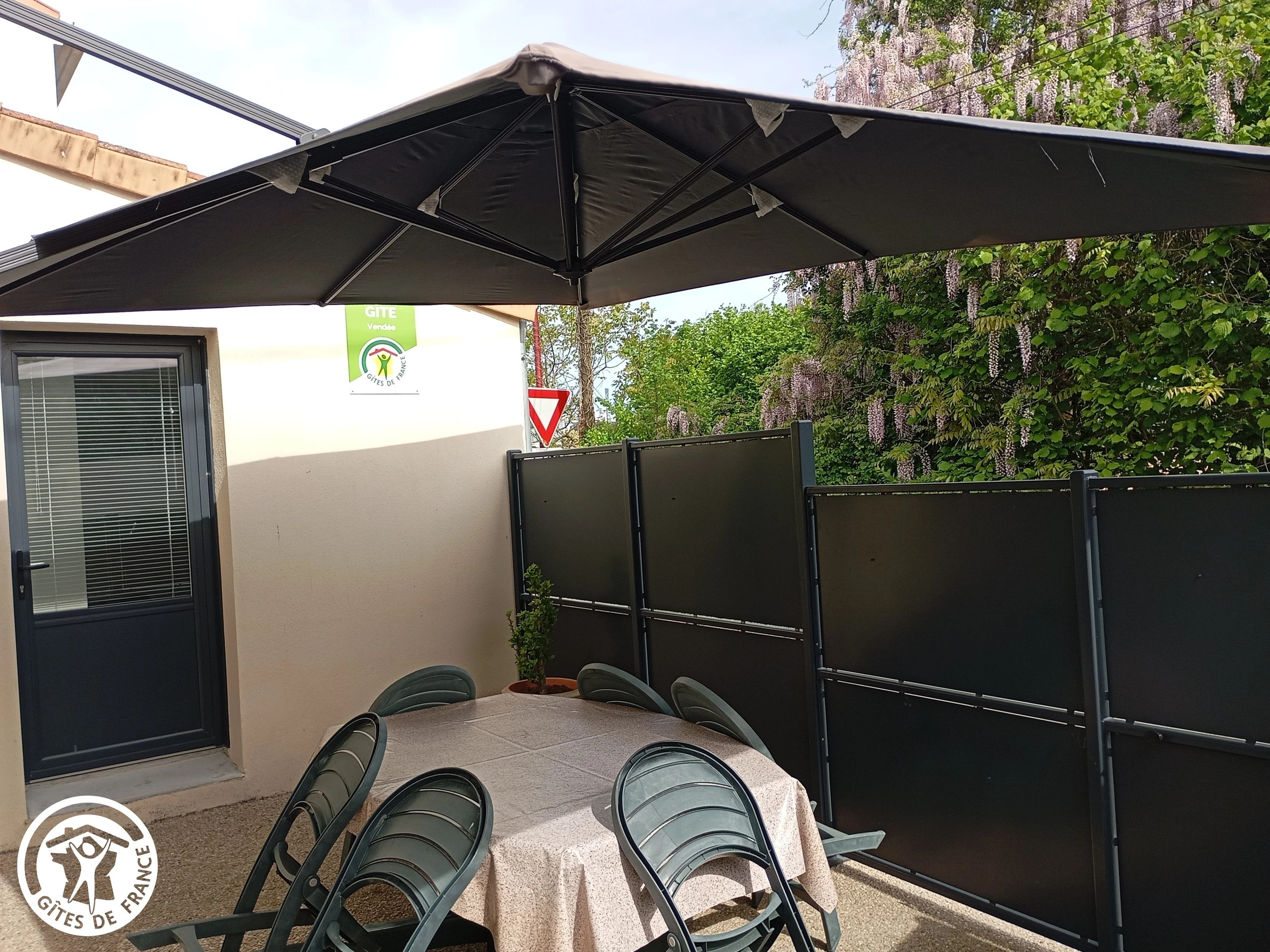 Gîte for 6 people in La Verrie (800m from the town center), adjoining another house, comprising on the ground floor a living/dining room/kitchen, a bedroom (1 double bed) with a private bathroom, a separate toilet, and a laundry room with a washing machine and dryer. Upstairs, a landing with a play area and children's books, 2 bedrooms (2 double beds) with 2 private bathrooms and toilets. Three fans are available. Wi-Fi. An outdoor terrace with a plancha grill and garden furniture is available. Bed linen and towels are provided.