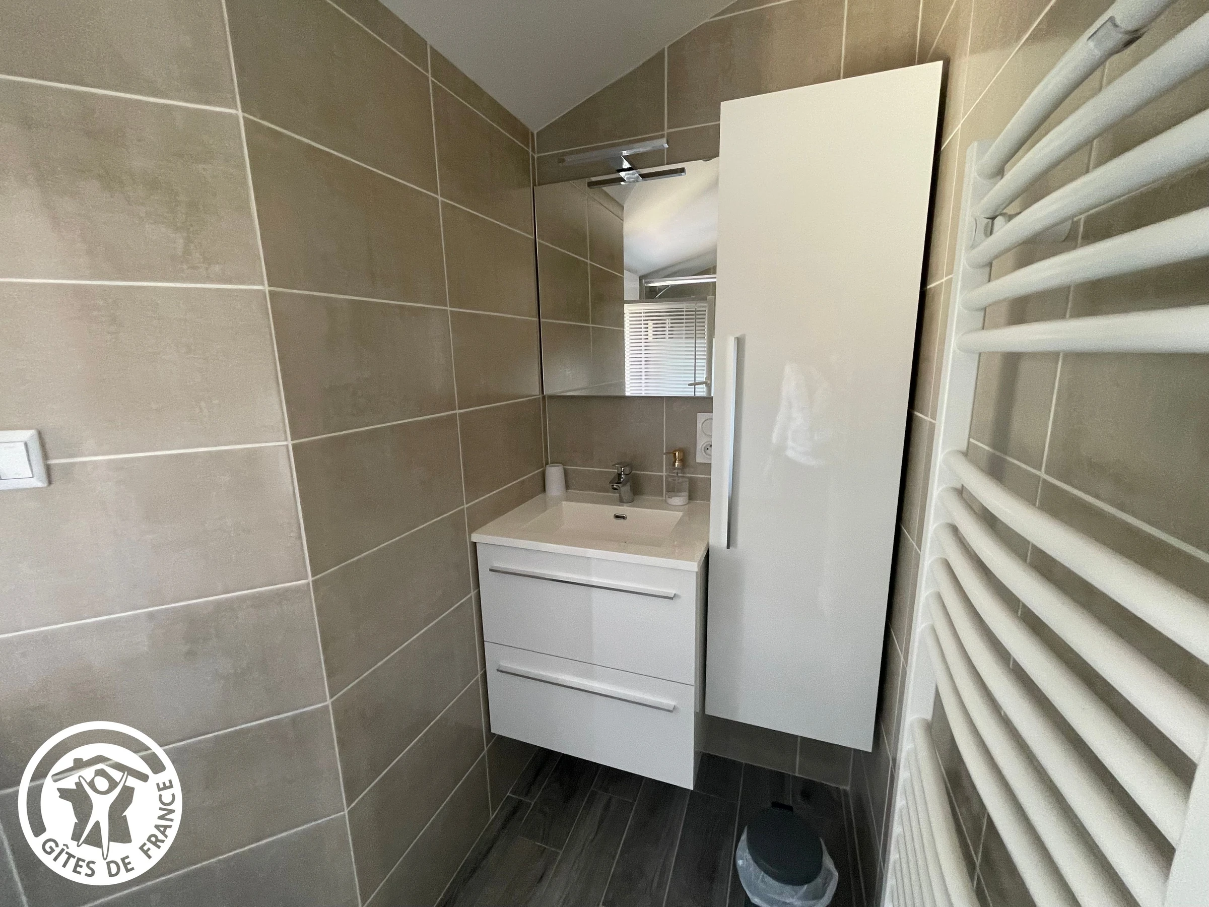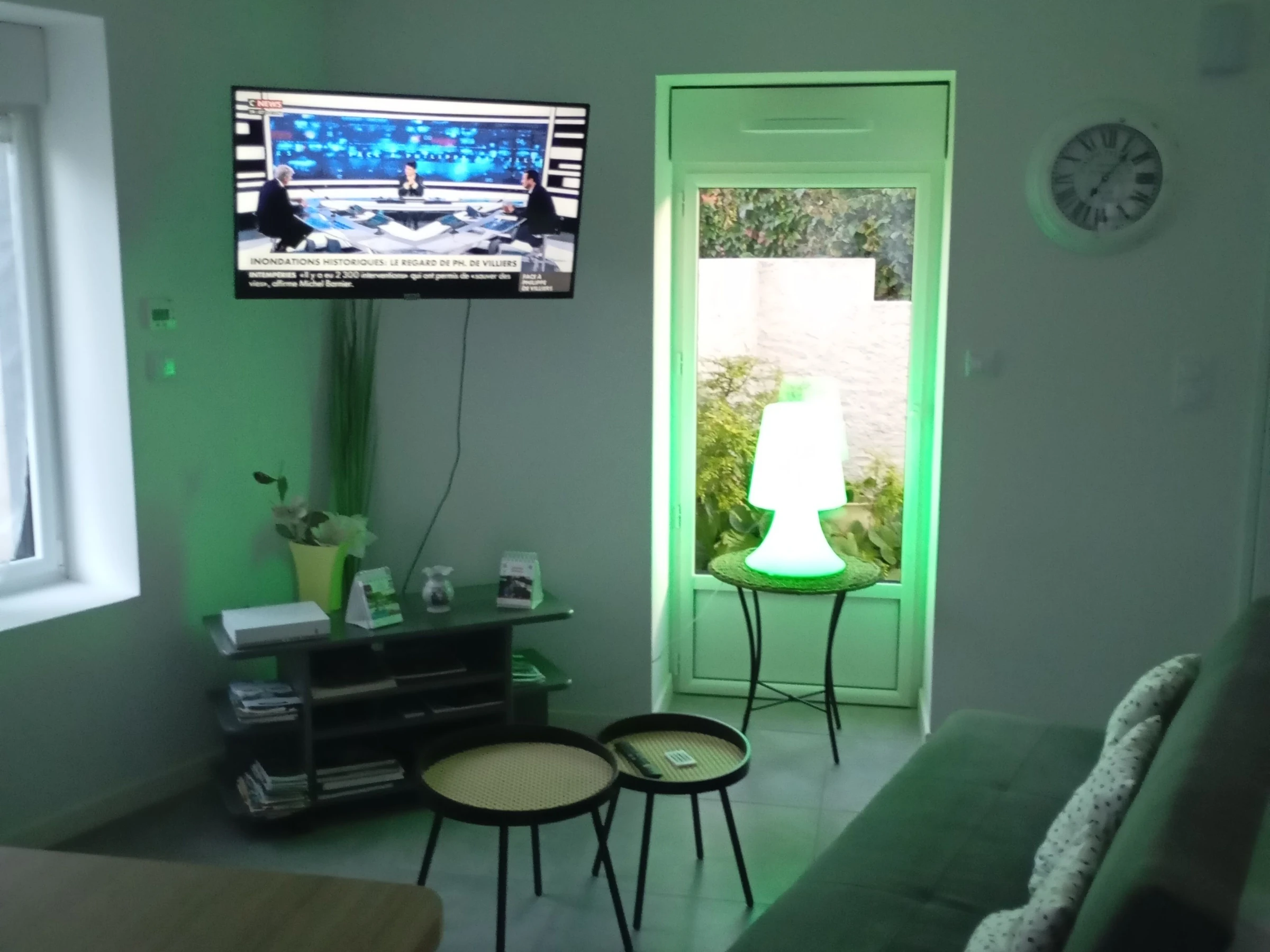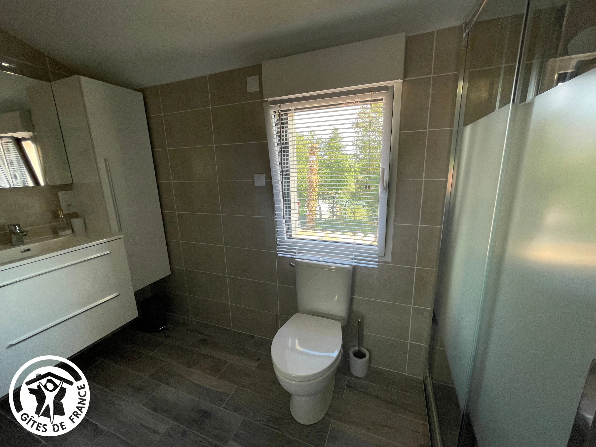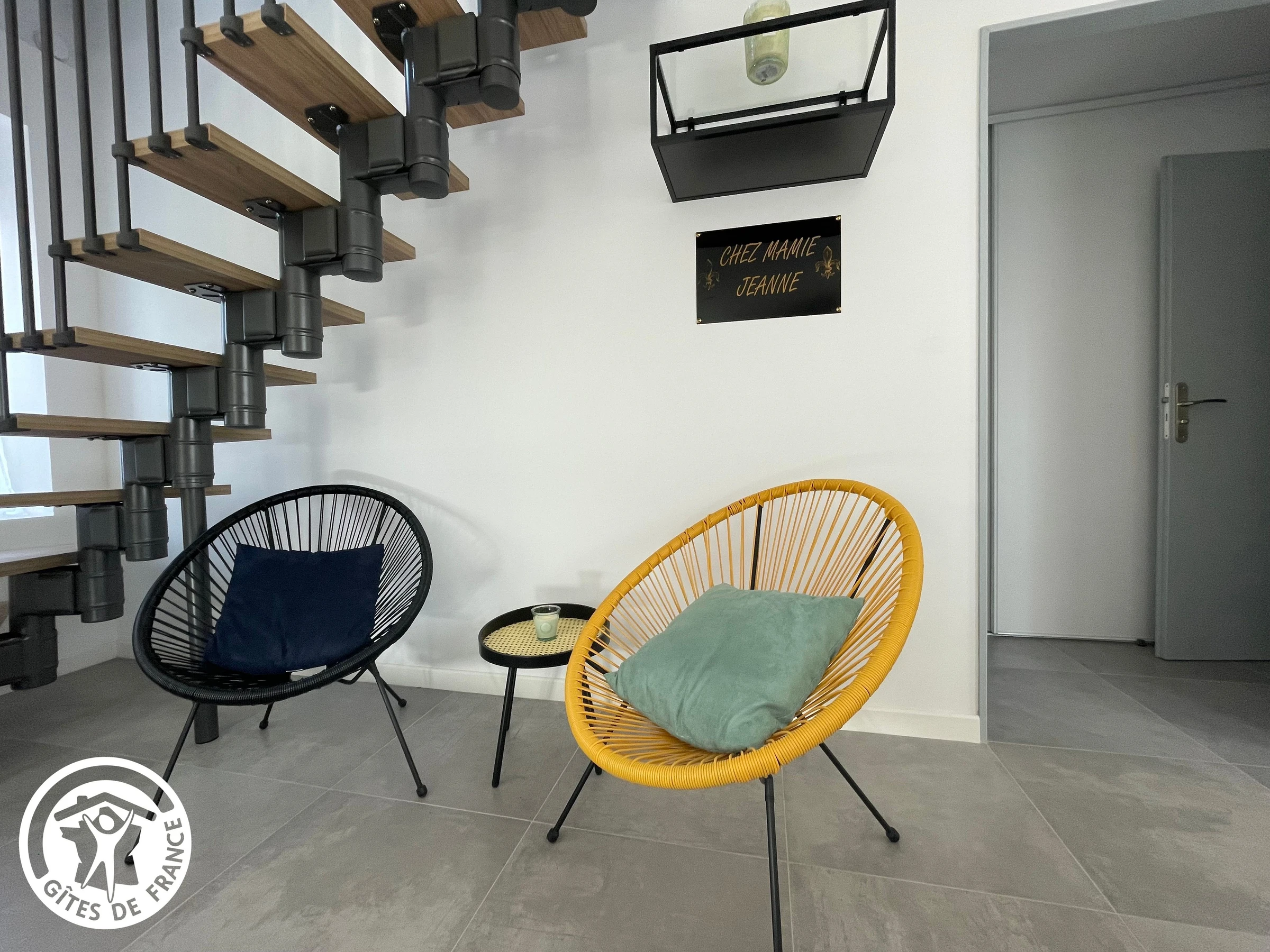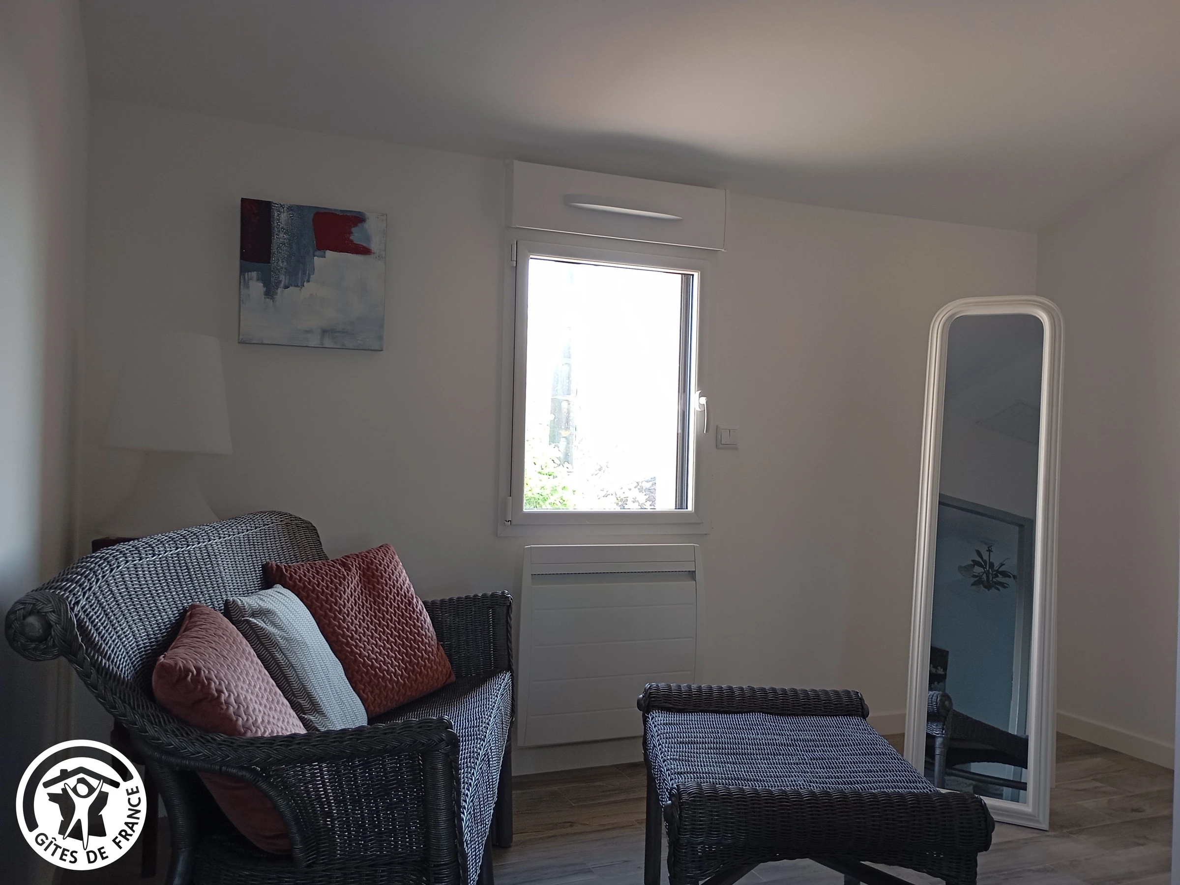 Gîte for 6 people in La Verrie (800m from the town center), adjoining another house, comprising on the ground floor a living/dining room/kitchen, a bedroom (1 double bed) with a private bathroom, a separate toilet, and a laundry room with a washing machine and dryer. Upstairs, a landing with a play area and children's books, 2 bedrooms (2 double beds) with 2 private bathrooms and toilets. Three fans are available. Wi-Fi. An outdoor terrace with a plancha grill and garden furniture is available. Bed linen and towels are provided.
