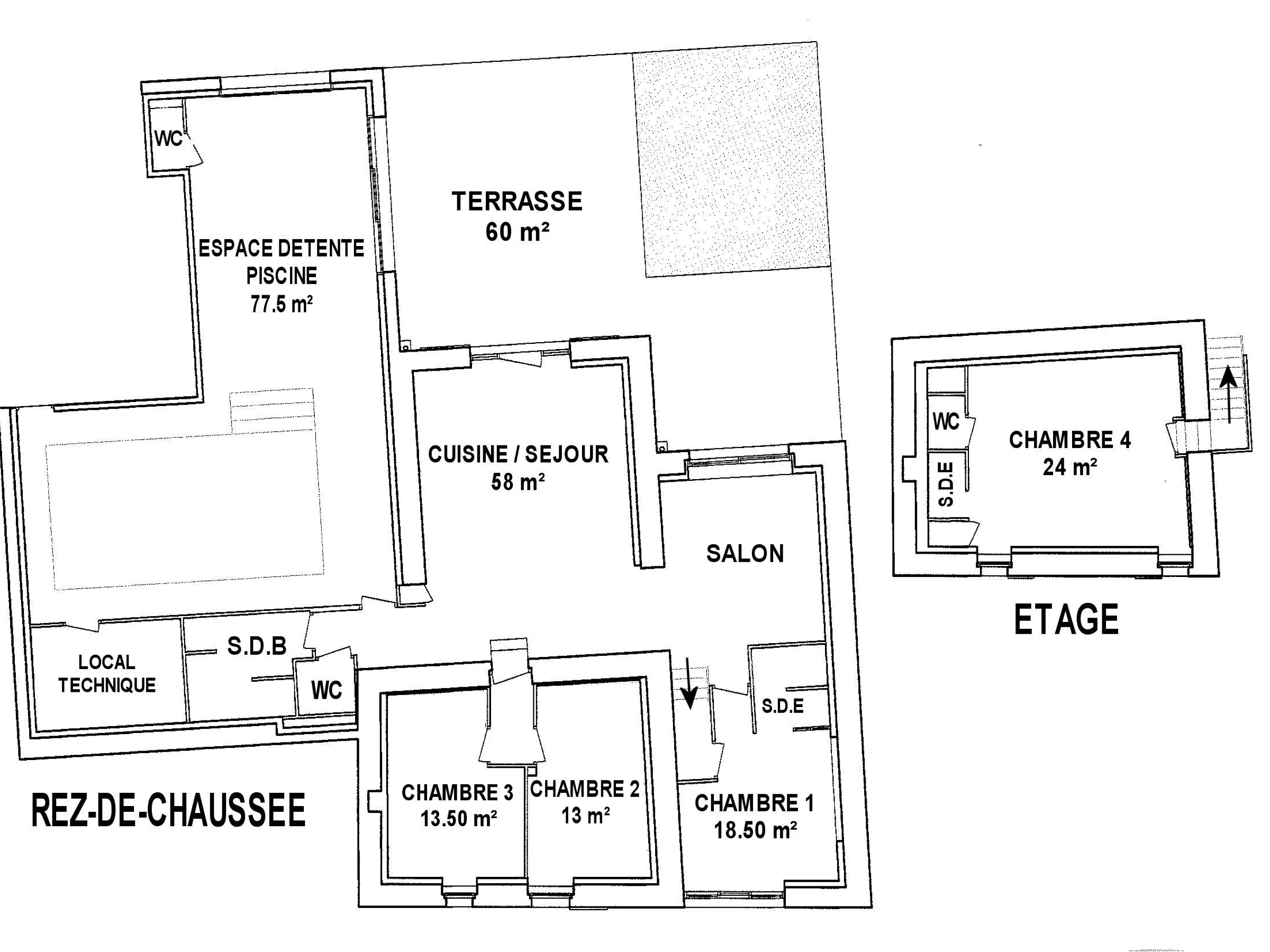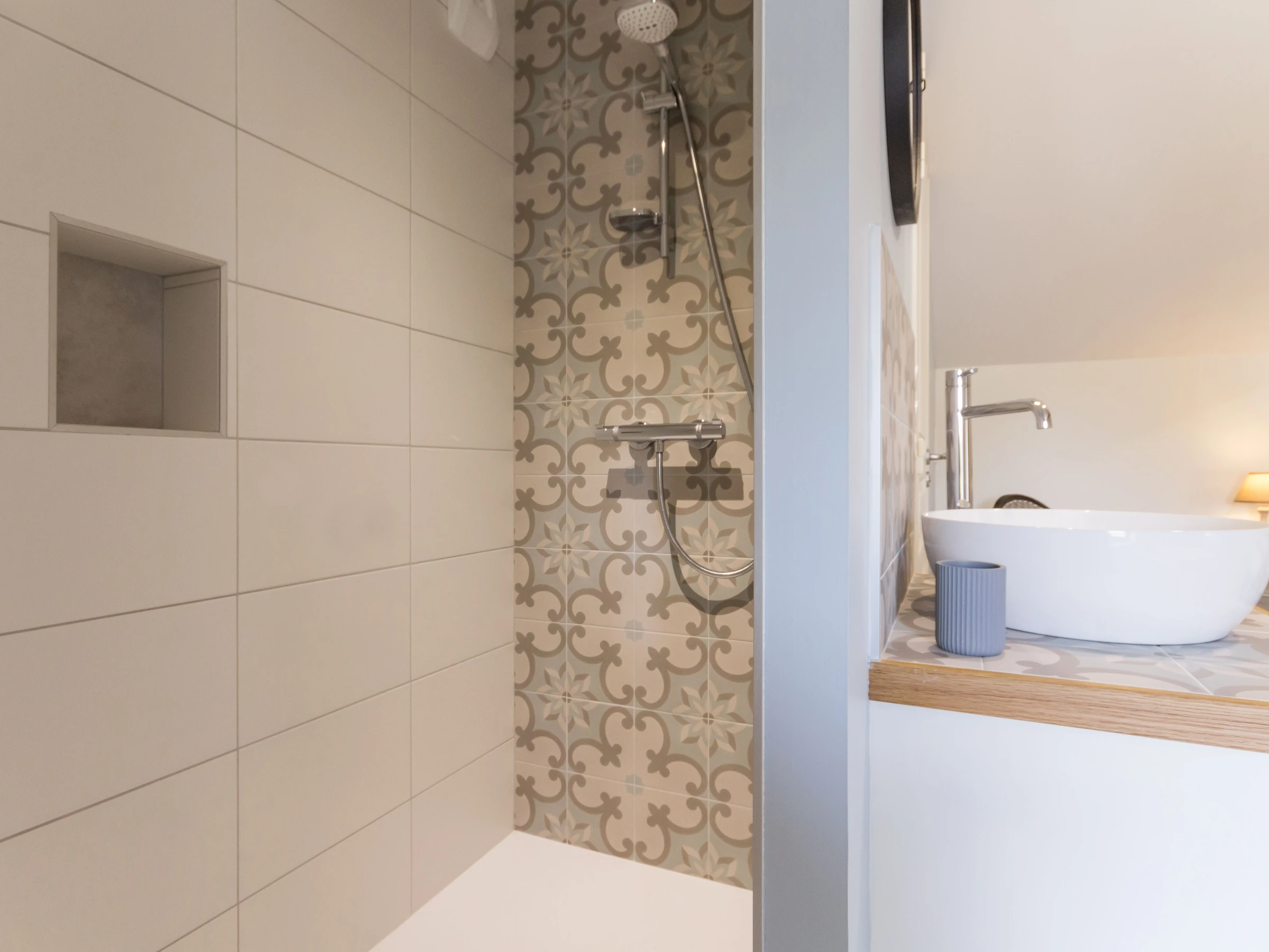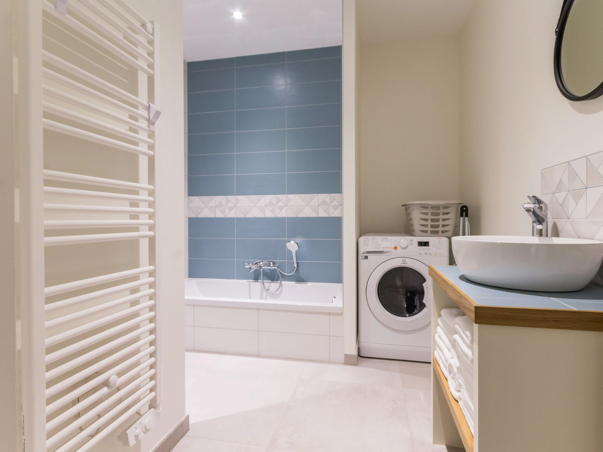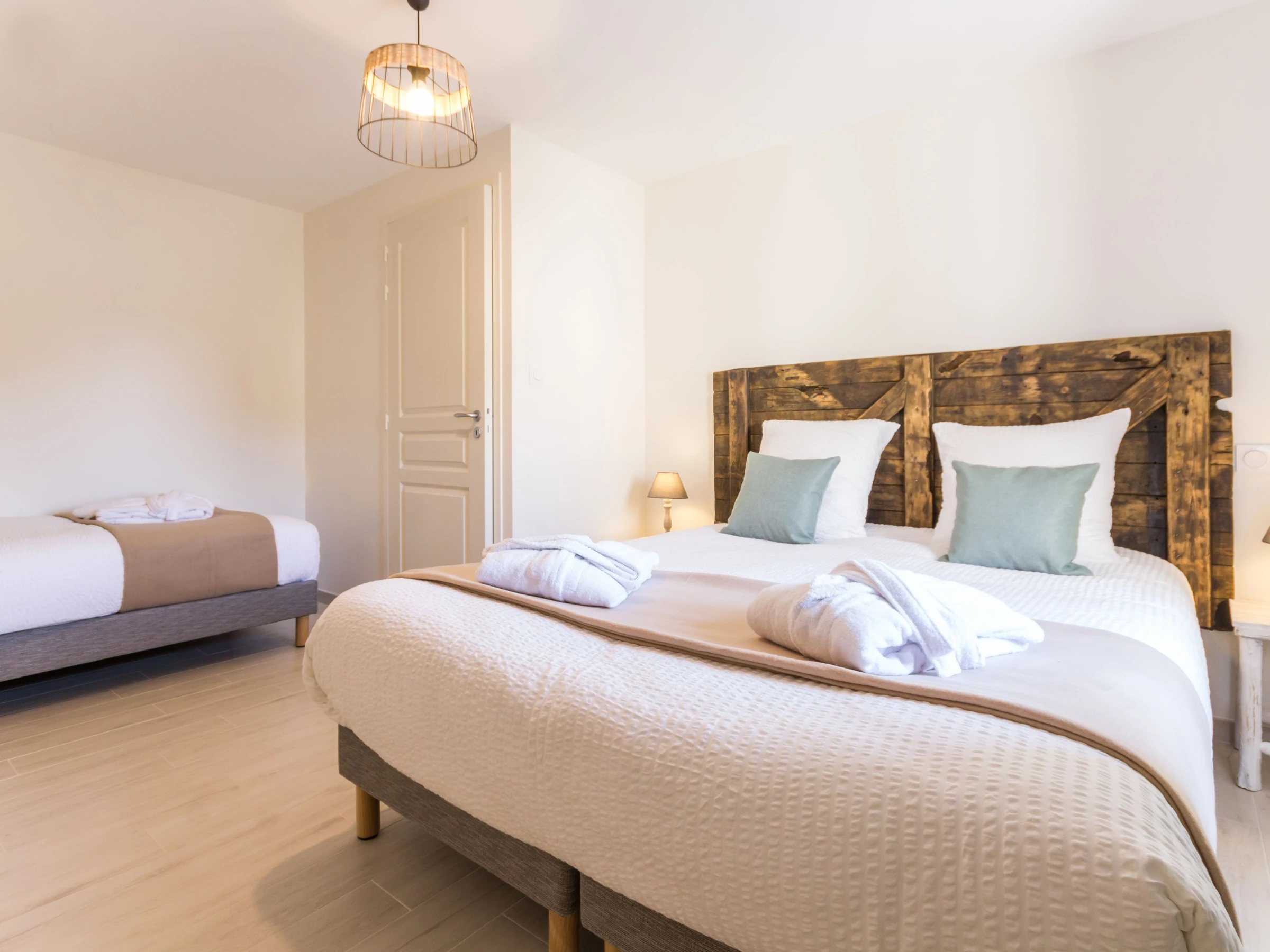 Ground floor: spacious and bright living room with open kitchen, open lounge, 1 bedroom (160x200 bed) with PMR shower room, 2 bedrooms (each with 1 90x200 bed + 2 twin 80x200 beds), 1 bathroom (bath + shower) and 1 separate PMR toilet. Upstairs: 1 bedroom (queen-size bed) with bathroom (bathtub + shower) and separate toilet.