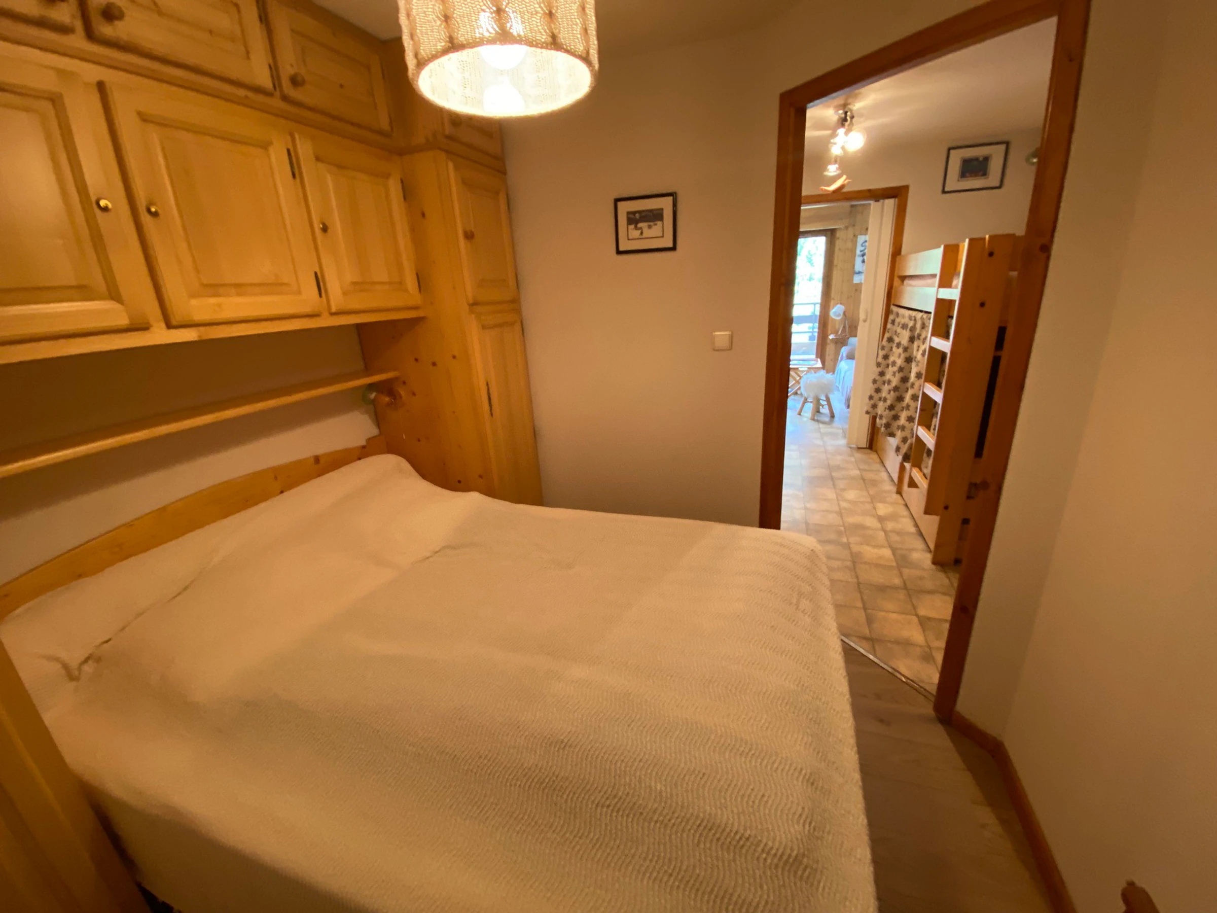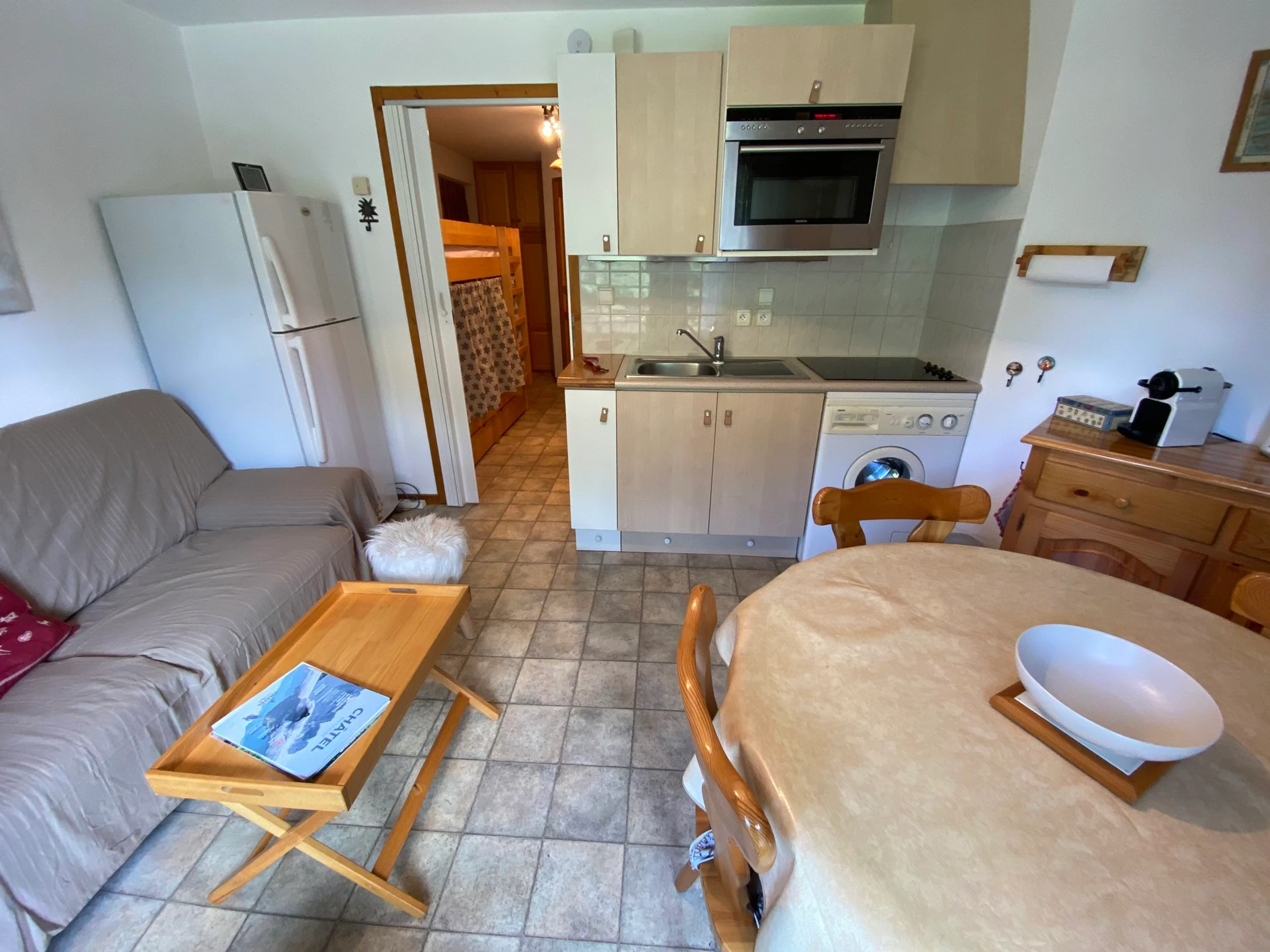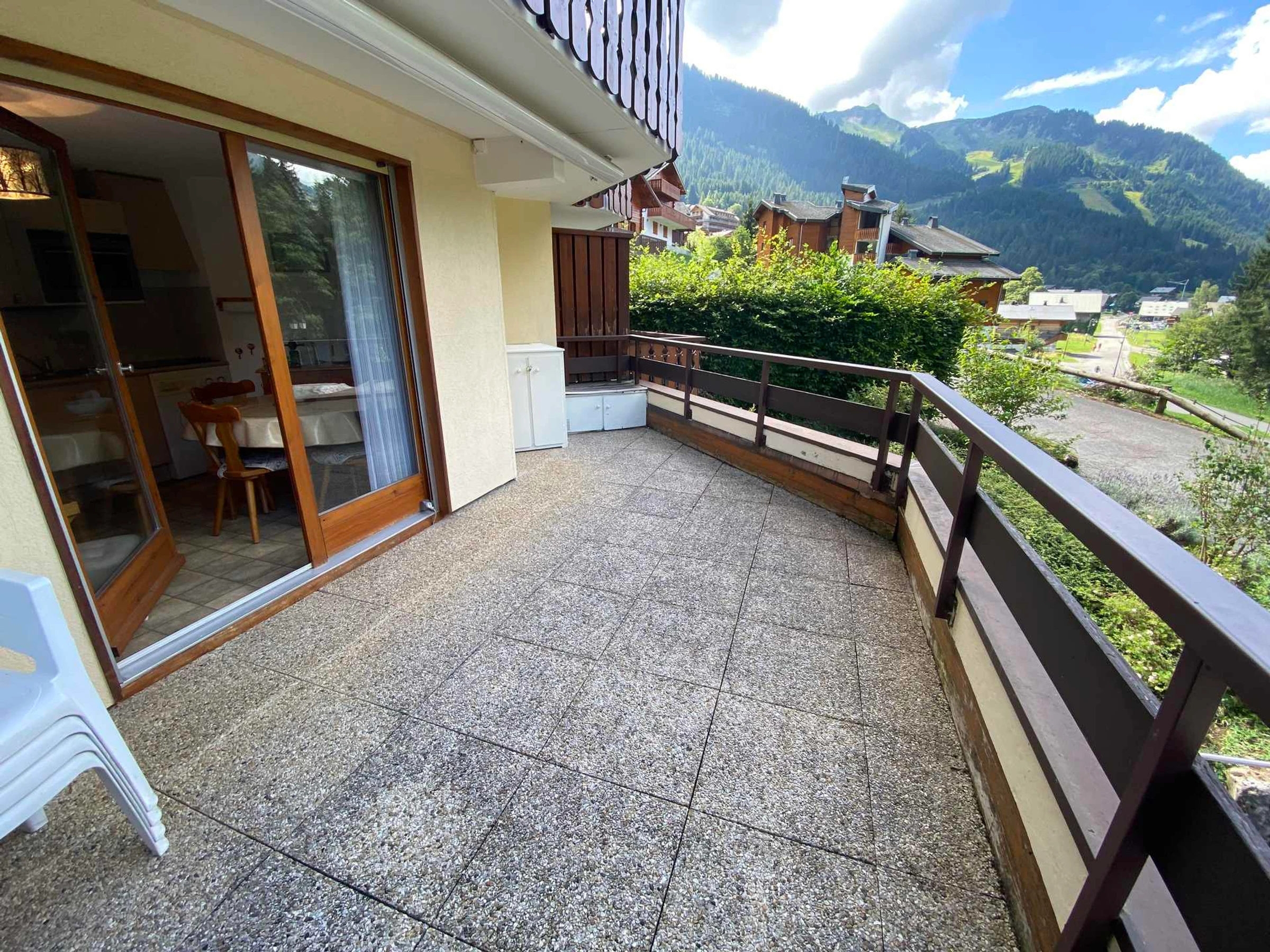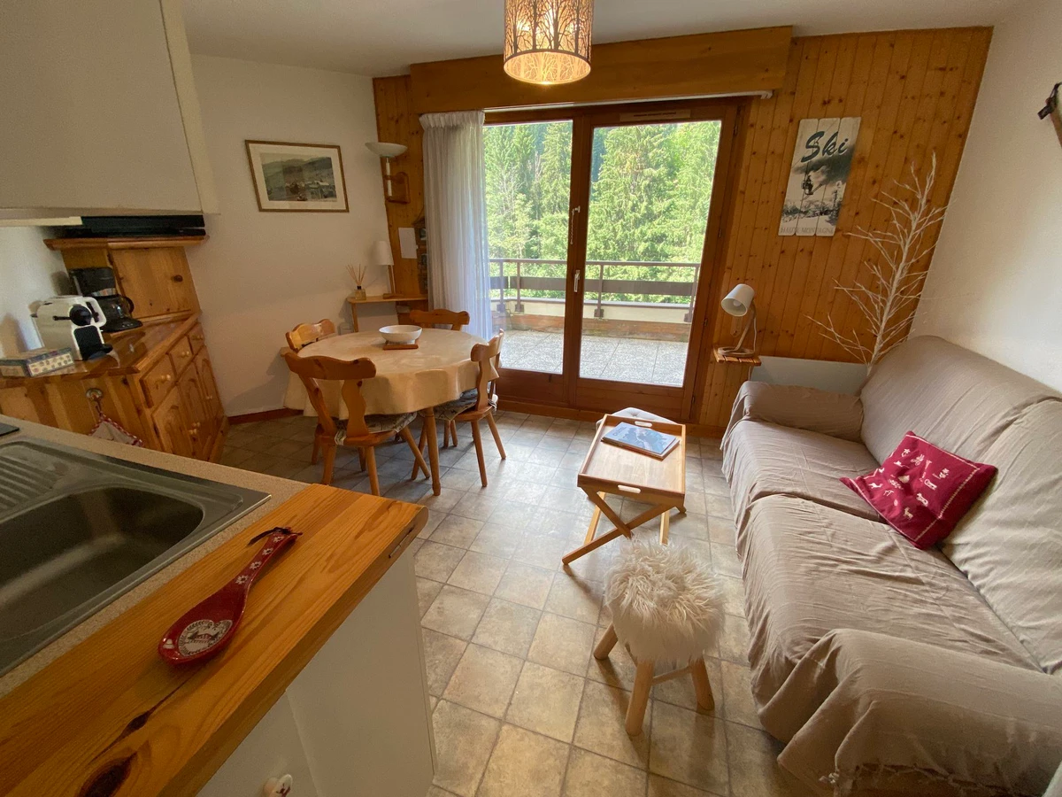 Apartment on the 1st floor, 28m², comprising an entrance with mountain corner with bunk beds (90x190), a bathroom with bathtub, separate toilet, a bedroom with a double bed (140x190), living room with fully equipped kitchen, access to a large west-facing terrace.