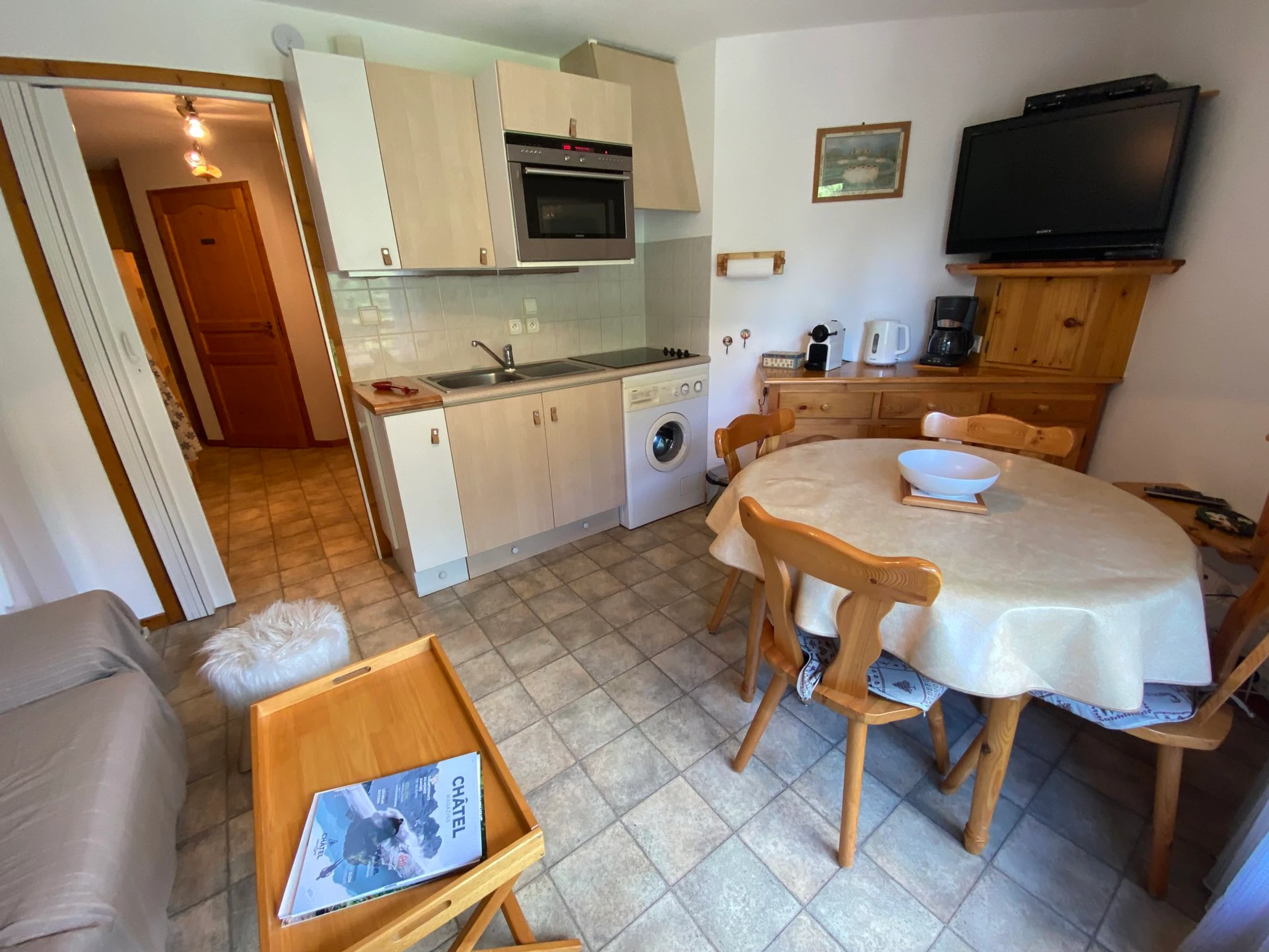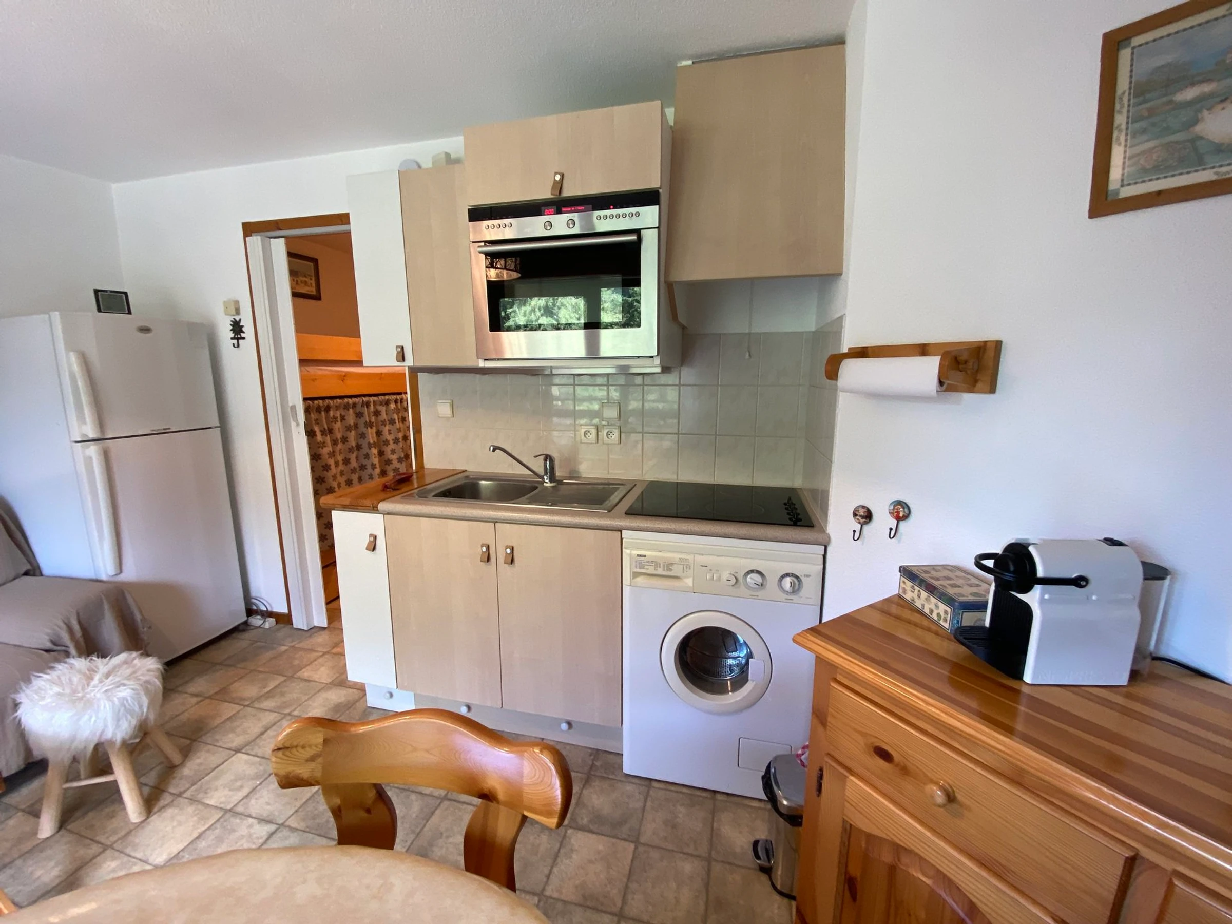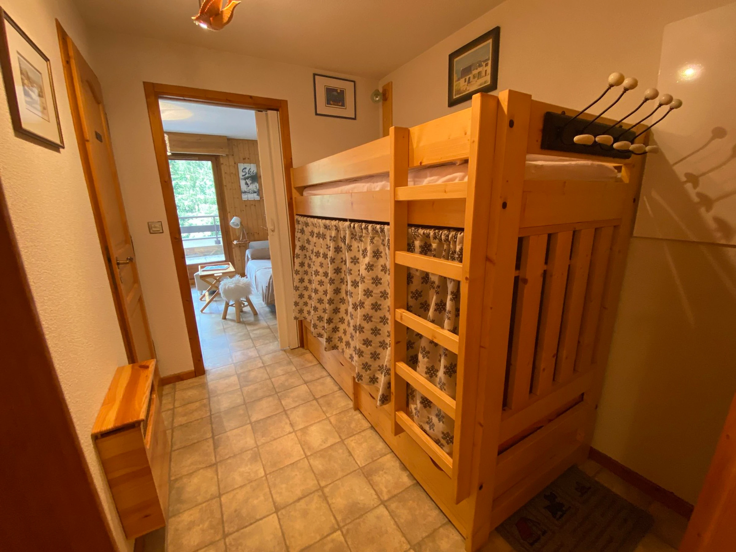 Apartment on the 1st floor, 28m², comprising an entrance with mountain corner with bunk beds (90x190), a bathroom with bathtub, separate toilet, a bedroom with a double bed (140x190), living room with fully equipped kitchen, access to a large west-facing terrace.