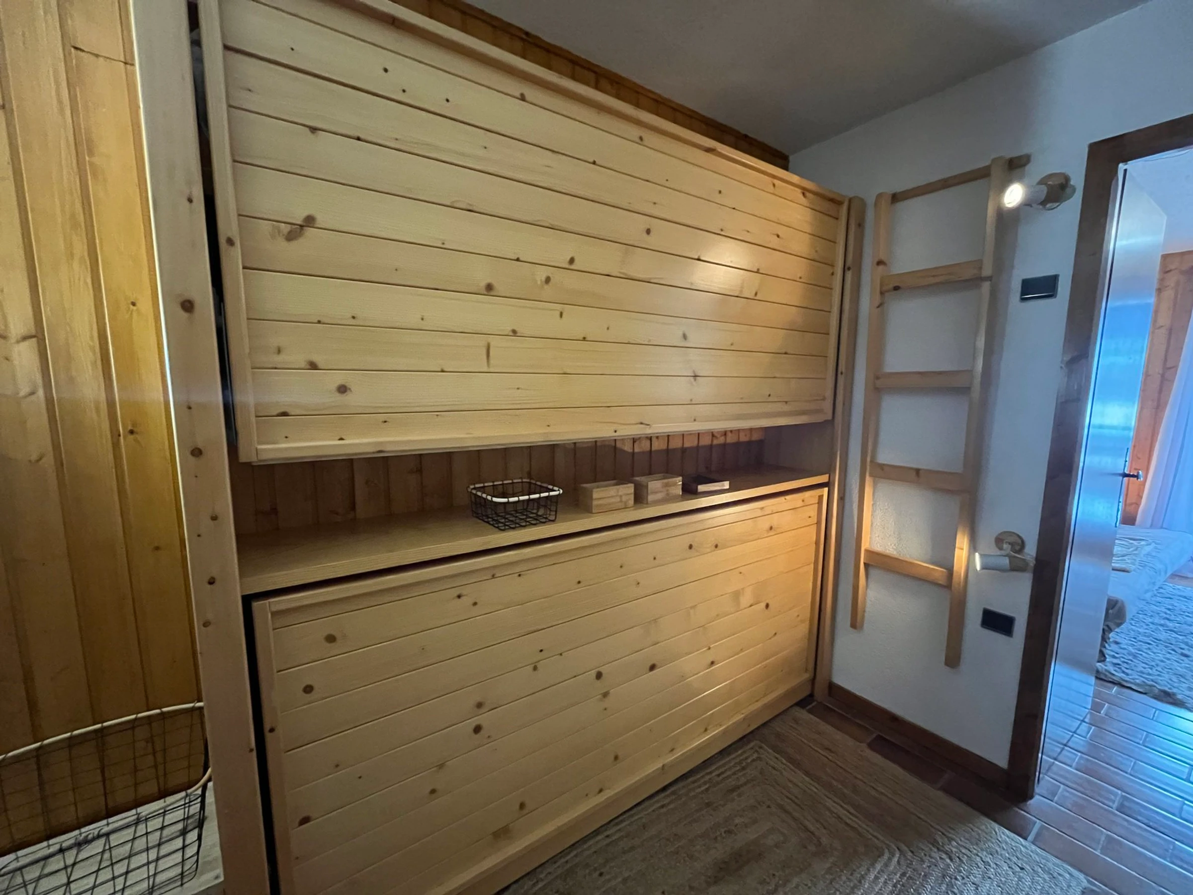 Charming one-bedroom apartment with mountain sleeping area, ideal for a mountain getaway in any season. It features a bedroom with a 140×190 cm double bed, a mountain sleeping area, a bathroom, separate WC, and an open-plan kitchen leading to a bright living area with a sofa bed.