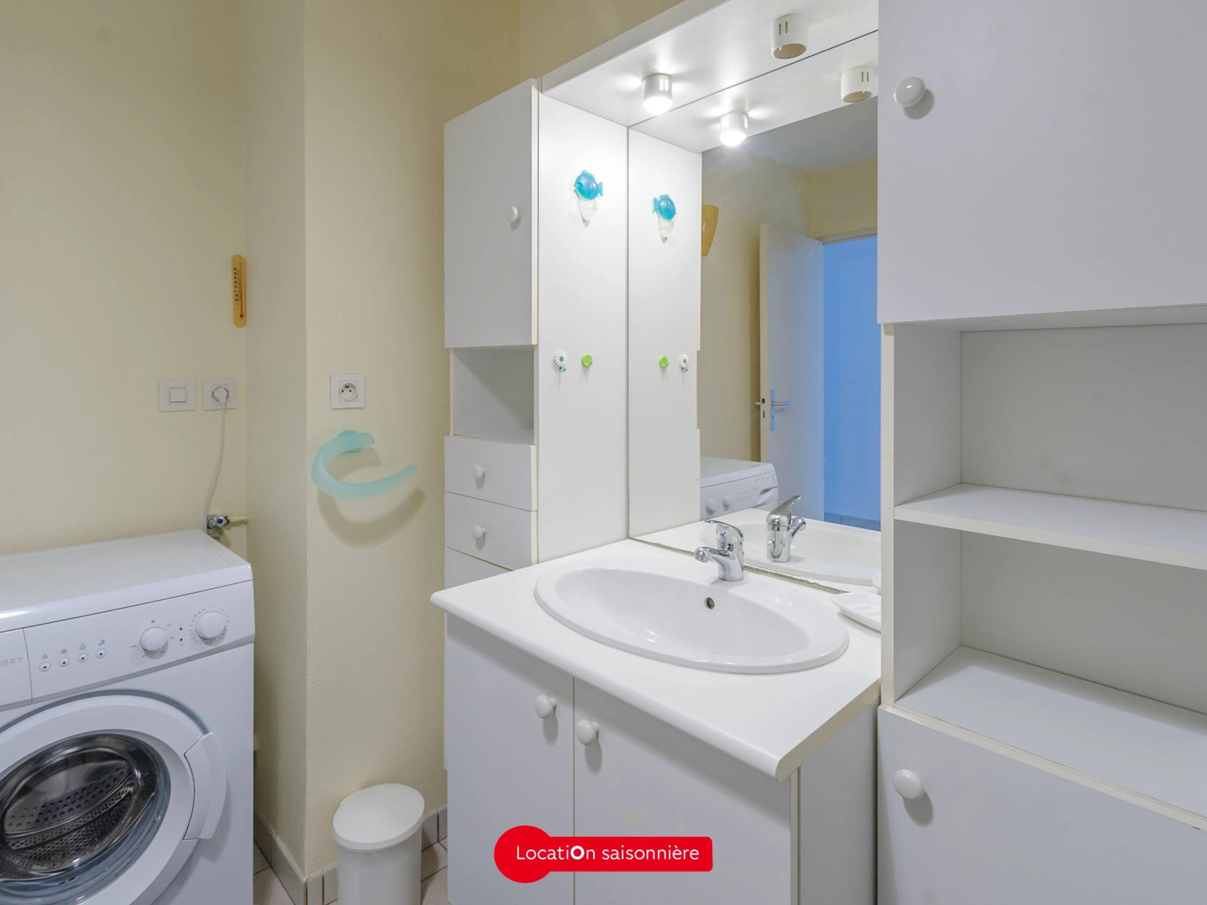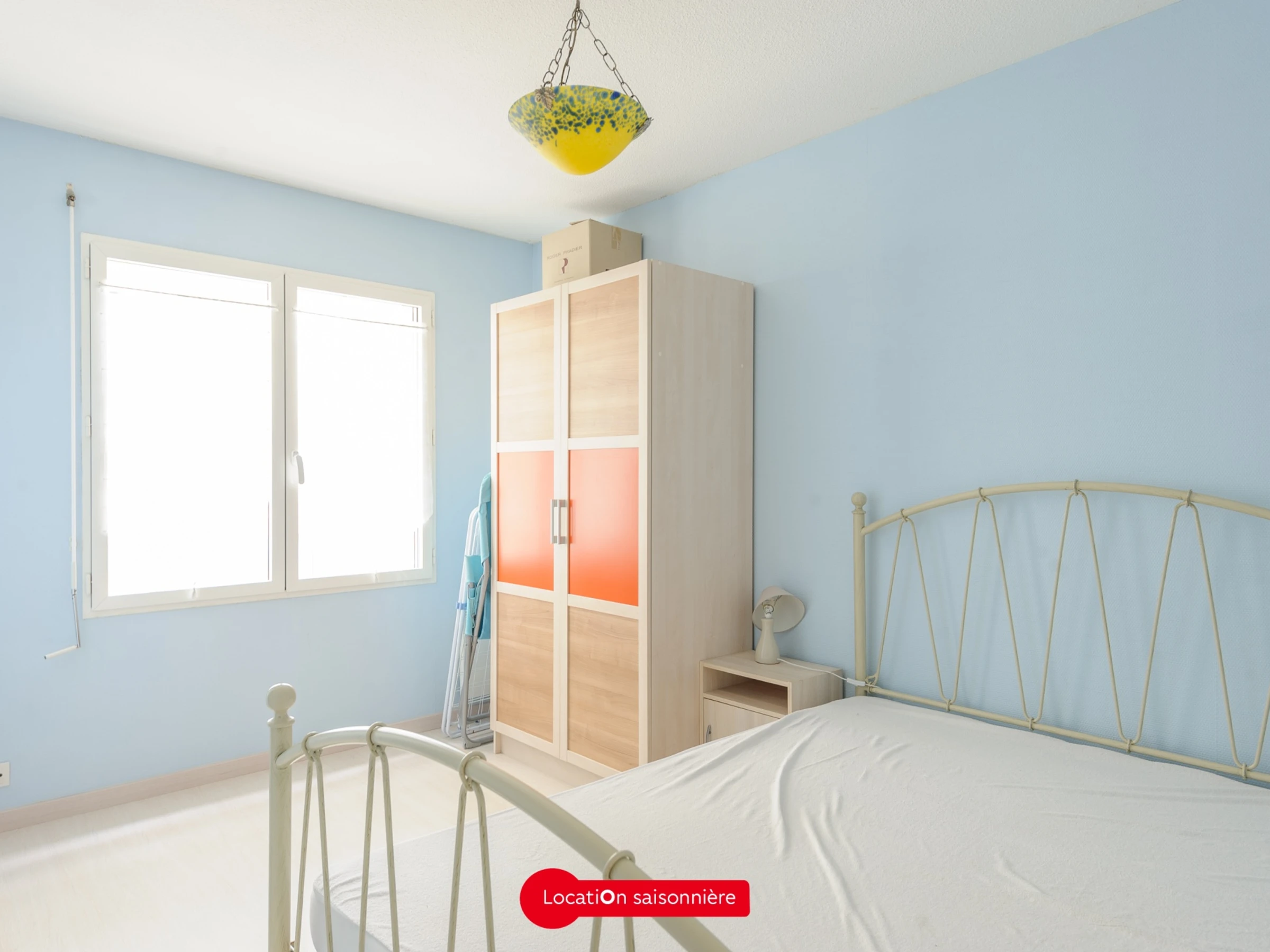 At your disposal, independent entrance with storage cupboard (ironing board, iron at your disposal), living room - dining room opening onto balcony with garden furniture for 4 people, electric blind, open fitted kitchen (fridge-freezer, microwave, cooker hood, electric hob, oven, dishwasher), two bedrooms with 140 cm bed, shower room with washing machine, WC with washbasin. Private parking space.