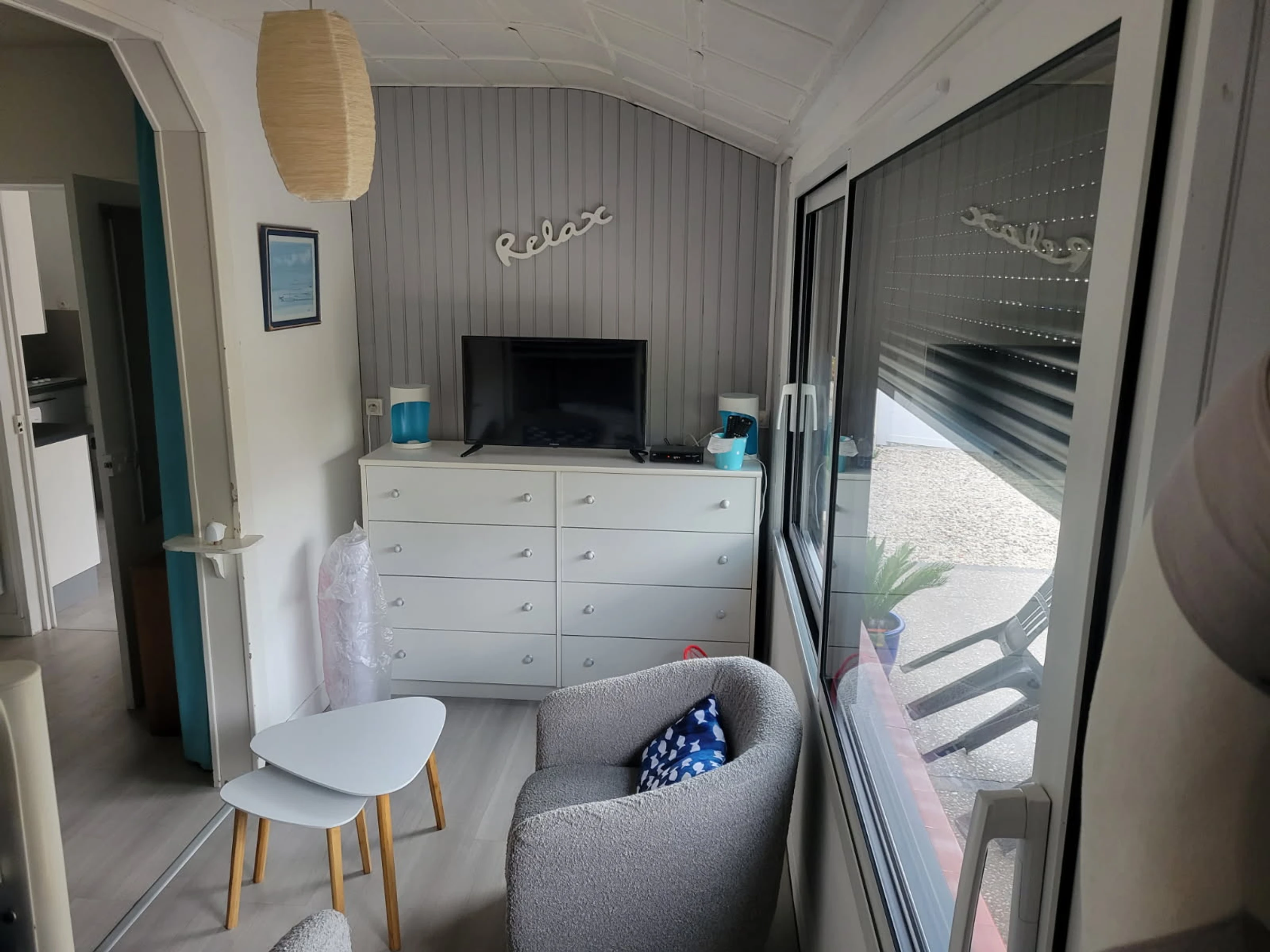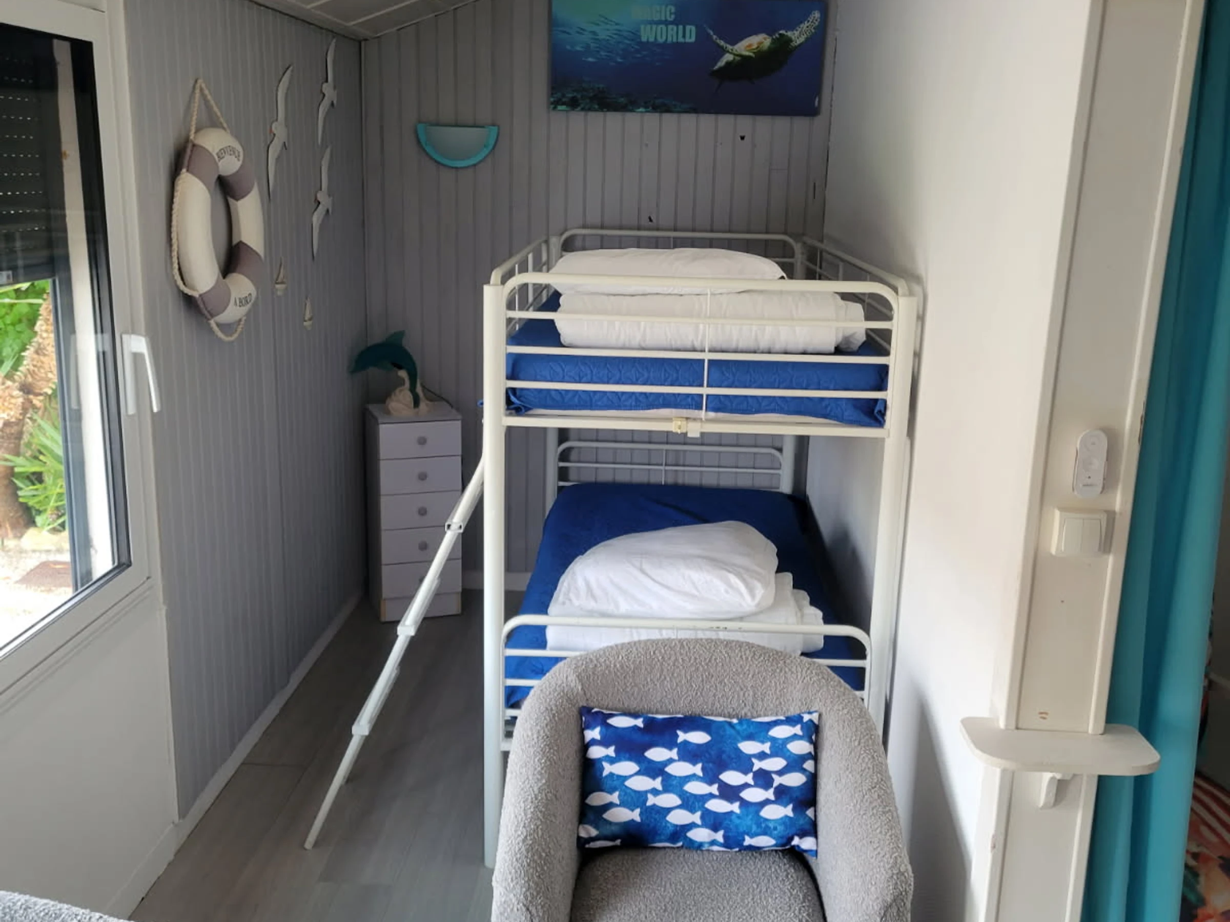 - a dining room in a veranda, a fully fitted and equipped kitchen (dishwasher, fridge-freezer, oven/grill, microwave), a living area with a flat-screen TV and bunk beds, 2 bedrooms with double beds (140cm), a shower room with toilet and washing machine.