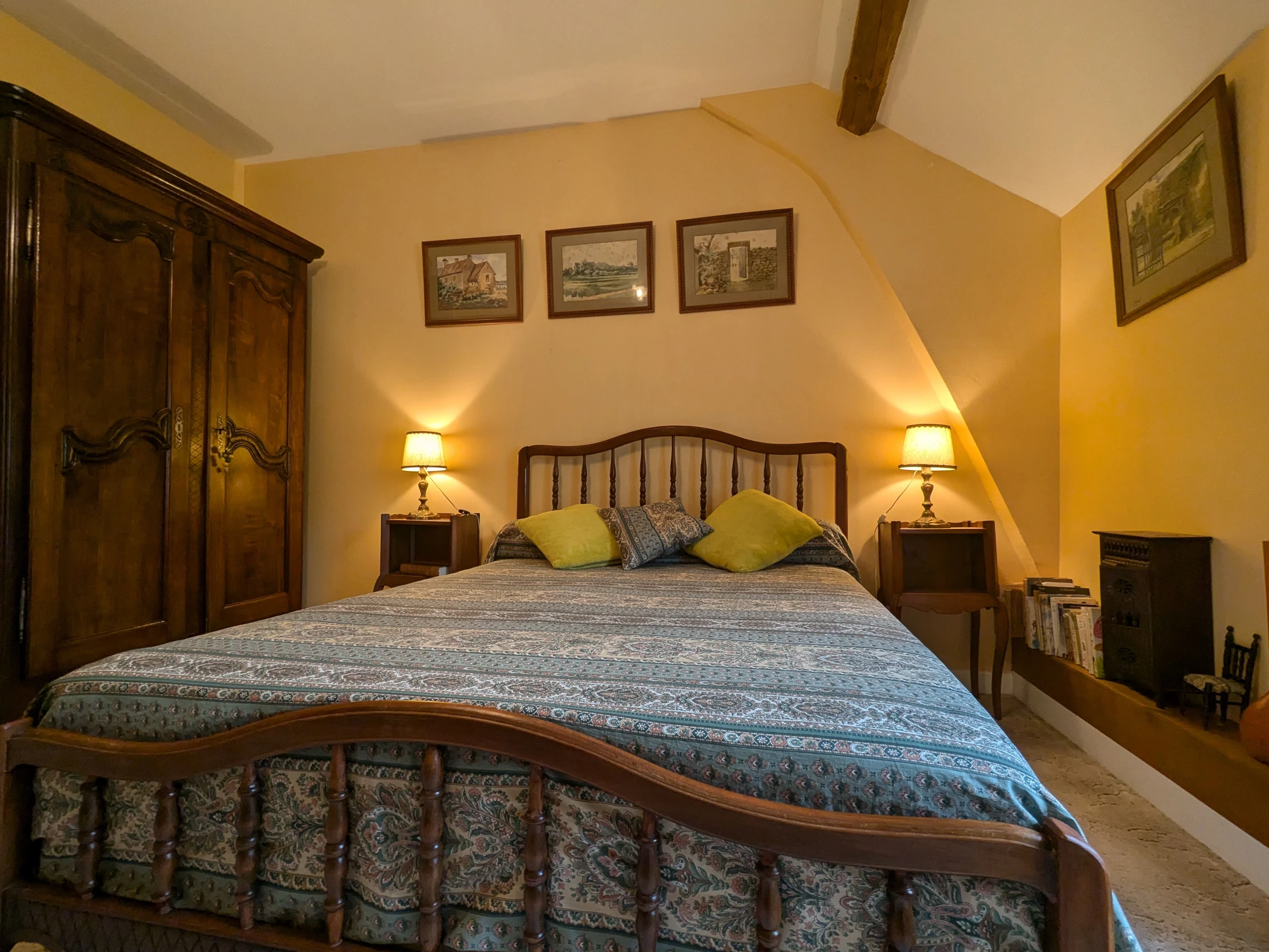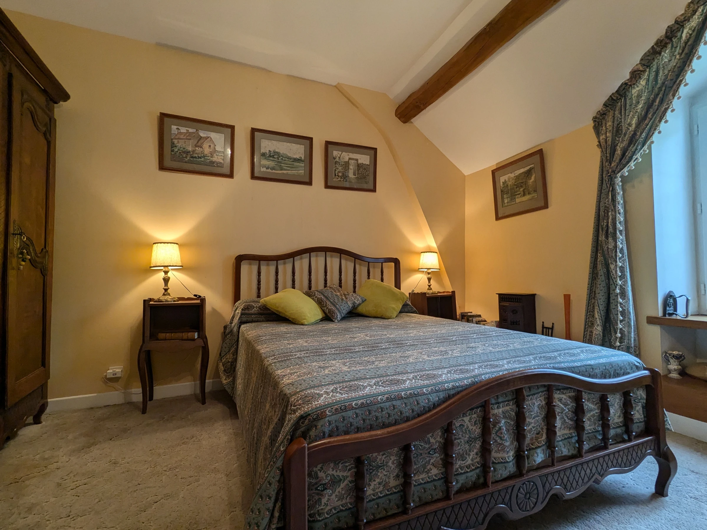 On the upper floor of a characterful house, in a shaded park bordered by a river, 4 guest rooms and a rural gîte are located on the property: the "Rose" room (1 double bed), the "Verte" room (1 double bed), the "Bleue" room (2 120 cm beds), and the "Rouge" room (1 double bed and 2 single beds) with full bathrooms.