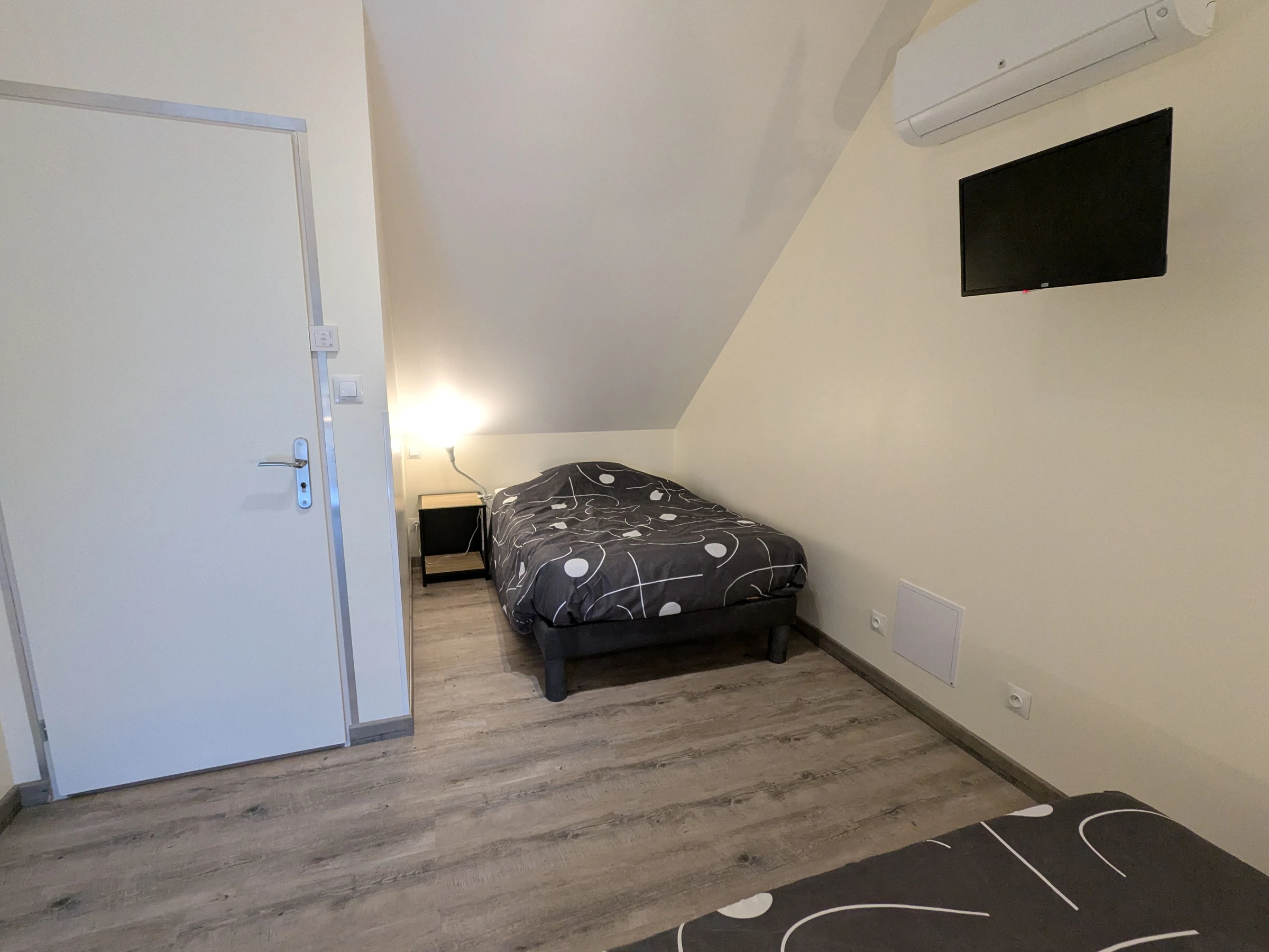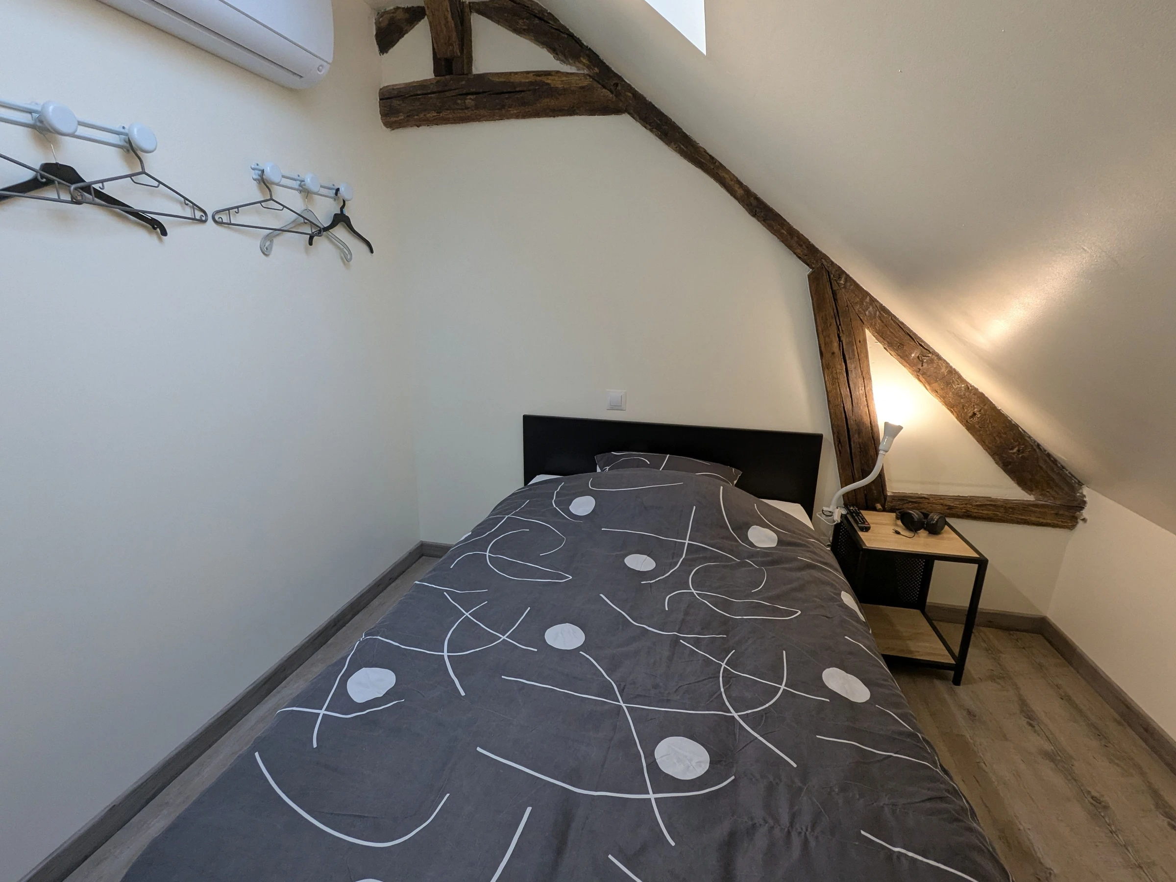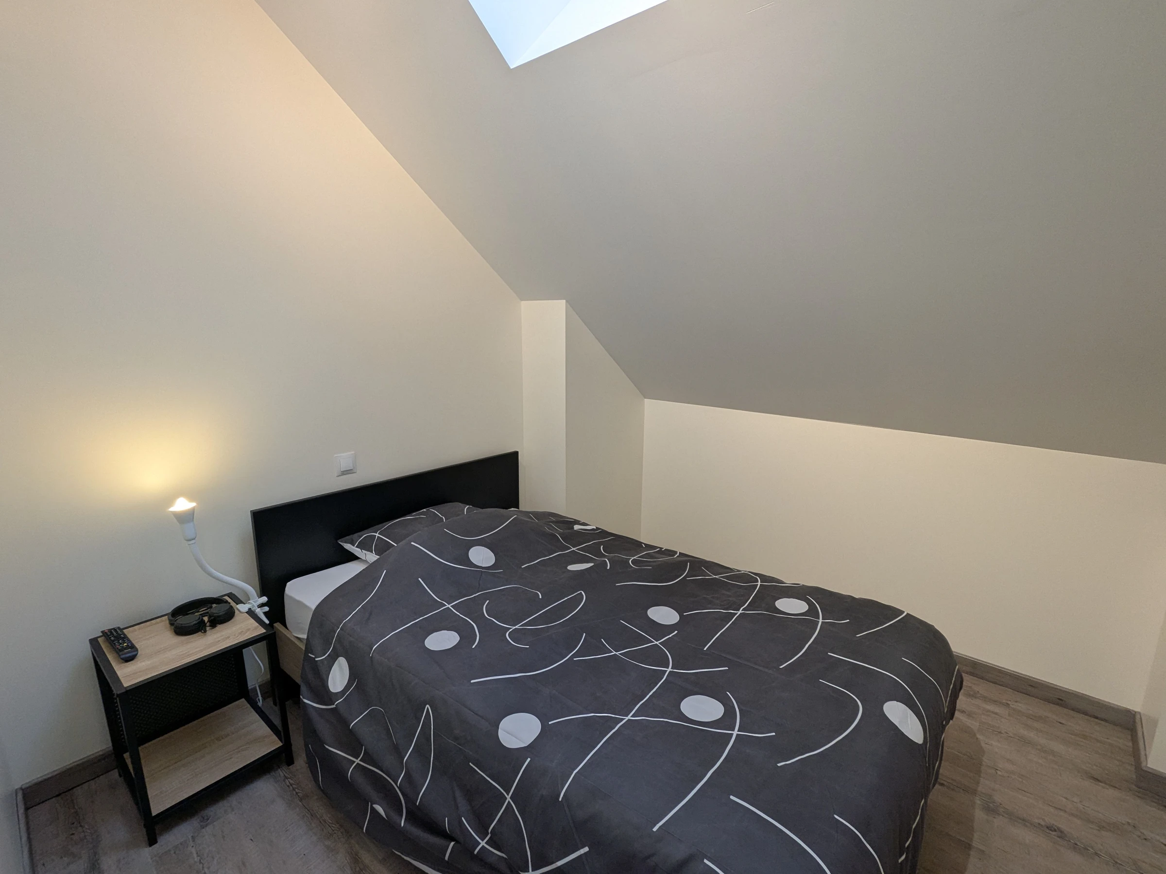 Whether you're traveling for business or looking for a tourist getaway, the cottage is the ideal starting point for a stay combining comfort, nature, and heritage! On the ground floor, there's a living room with a dining area (with television) and an open-plan equipped kitchen (no lounge area), a semi-open bathroom, and a separate toilet. Upstairs, there is a bedroom with a 140x190 cm double bed and a 120x190 cm single bed, and three smaller bedrooms, each with a 120x190 cm single bed. Each bedroom has a television and headphones, as well as a private, secure storage space in the hallway opposite the bedroom.