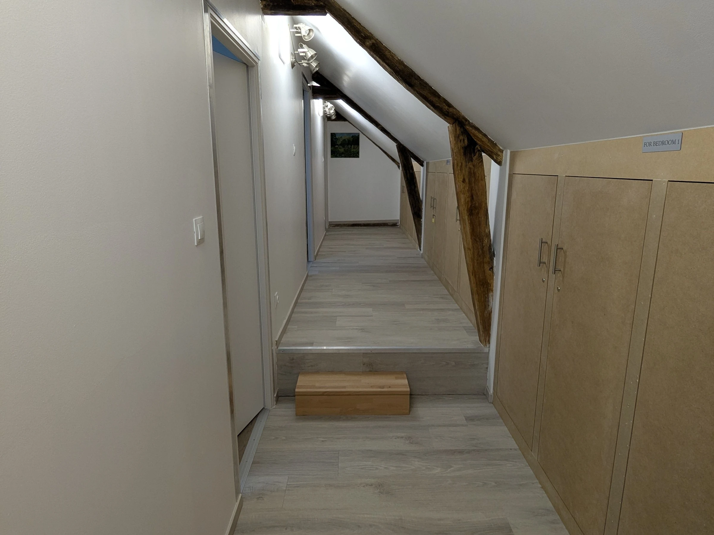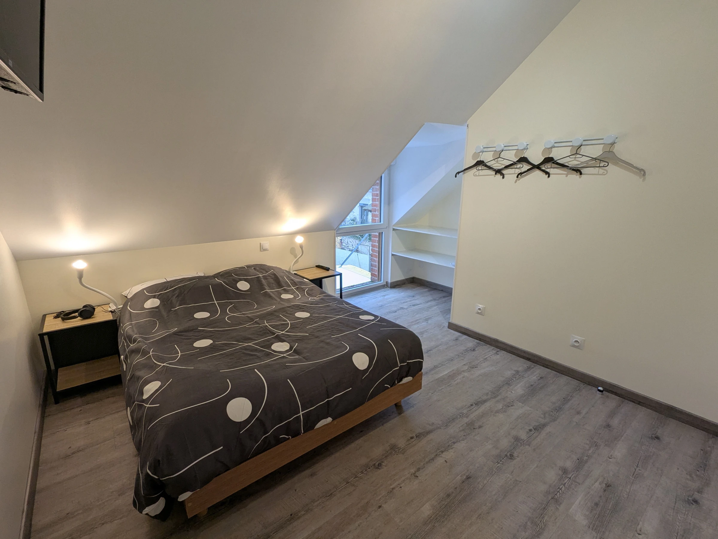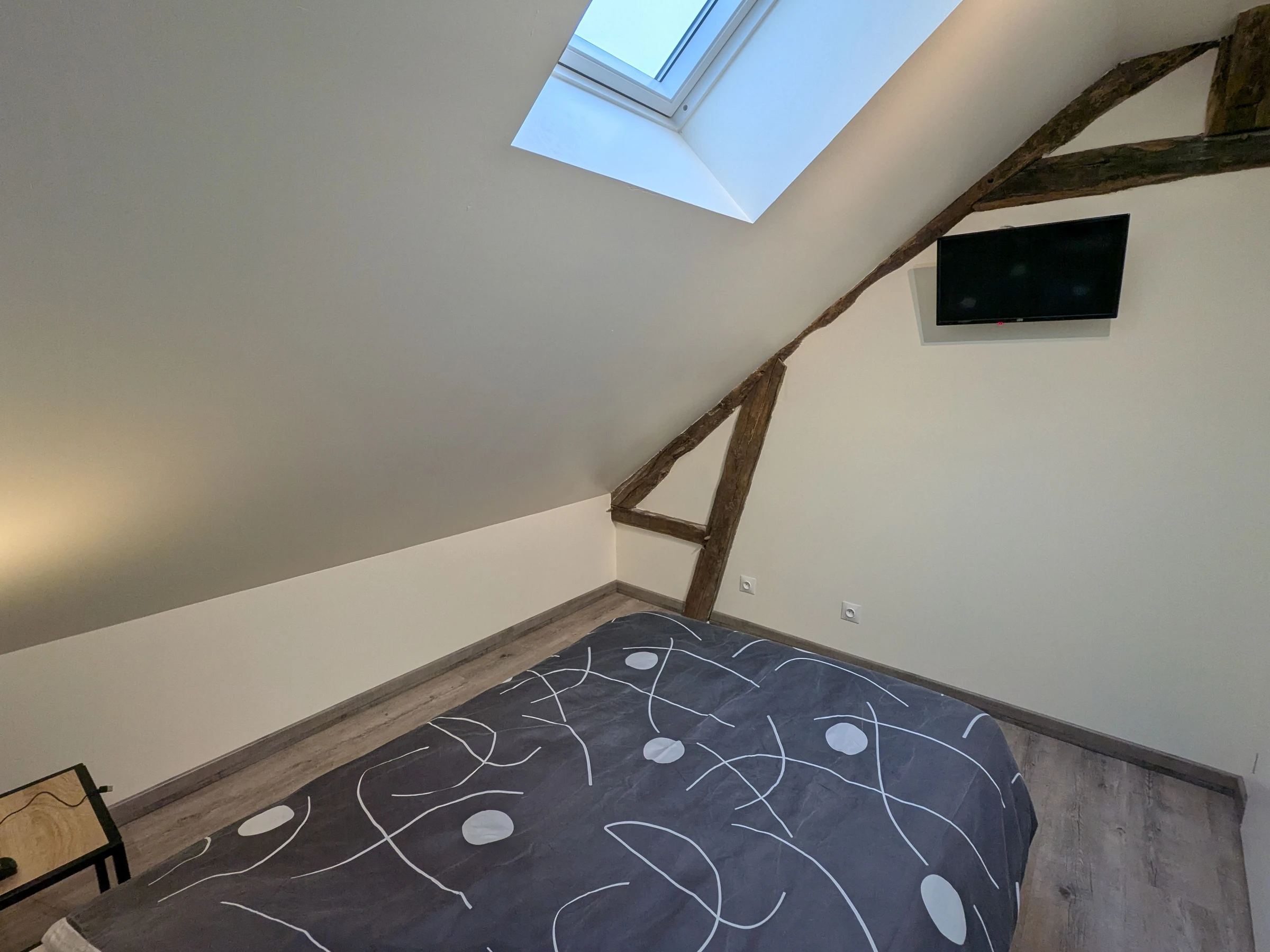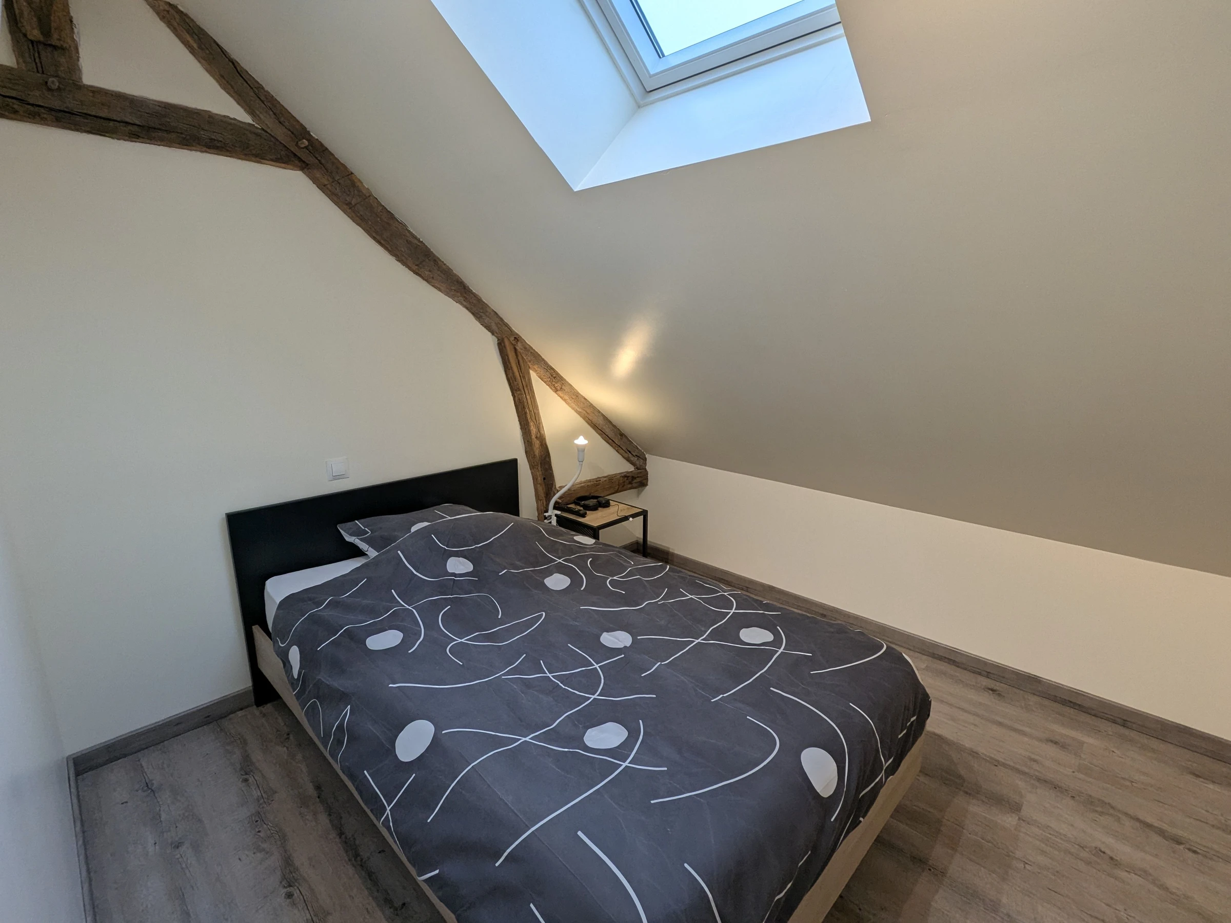 Whether you're traveling for business or looking for a tourist getaway, the cottage is the ideal starting point for a stay combining comfort, nature, and heritage! On the ground floor, there's a living room with a dining area (with television) and an open-plan equipped kitchen (no lounge area), a semi-open bathroom, and a separate toilet. Upstairs, there is a bedroom with a 140x190 cm double bed and a 120x190 cm single bed, and three smaller bedrooms, each with a 120x190 cm single bed. Each bedroom has a television and headphones, as well as a private, secure storage space in the hallway opposite the bedroom.