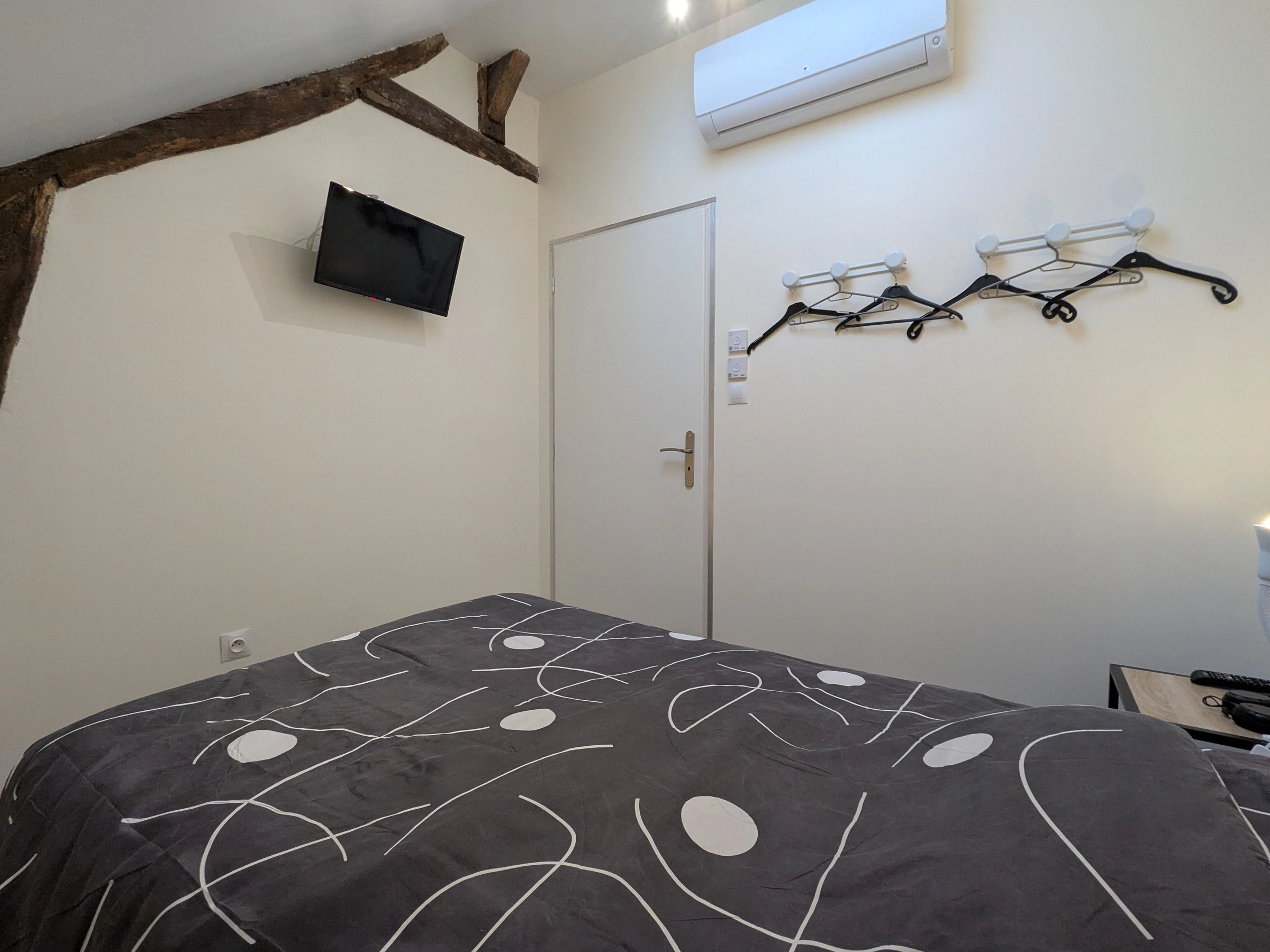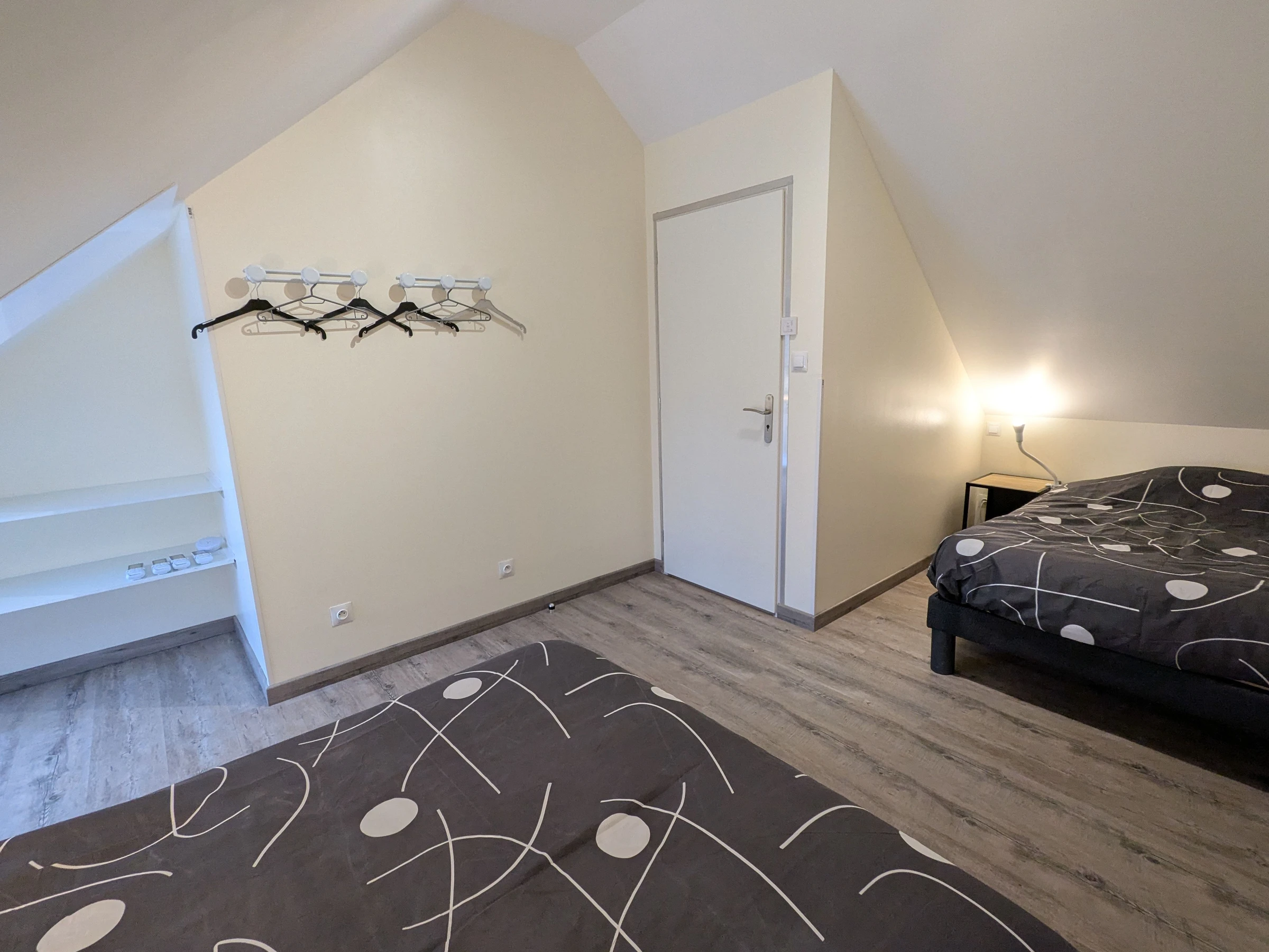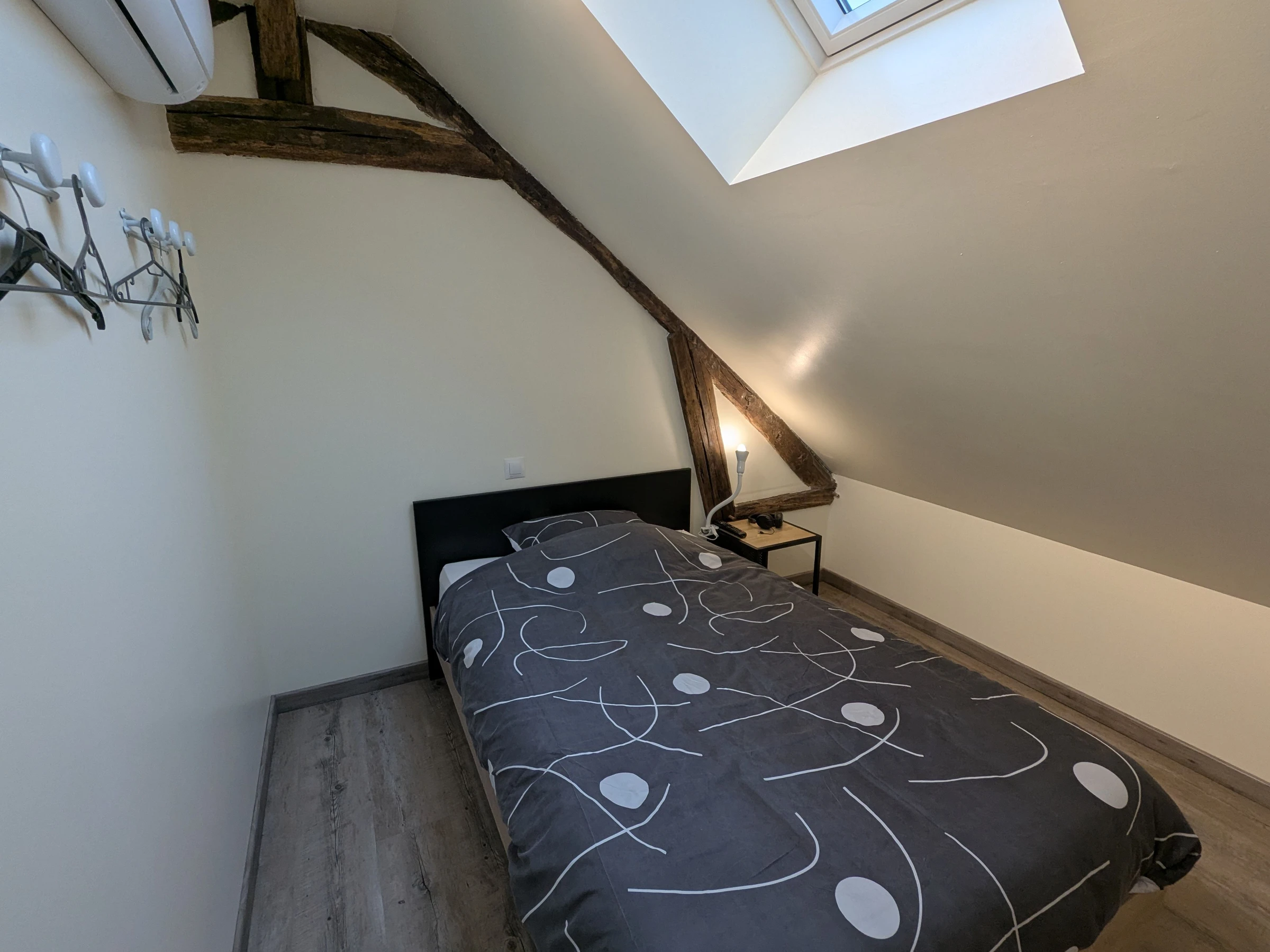 Whether you're traveling for business or looking for a tourist getaway, the cottage is the ideal starting point for a stay combining comfort, nature, and heritage! On the ground floor, there's a living room with a dining area (with television) and an open-plan equipped kitchen (no lounge area), a semi-open bathroom, and a separate toilet. Upstairs, there is a bedroom with a 140x190 cm double bed and a 120x190 cm single bed, and three smaller bedrooms, each with a 120x190 cm single bed. Each bedroom has a television and headphones, as well as a private, secure storage space in the hallway opposite the bedroom.