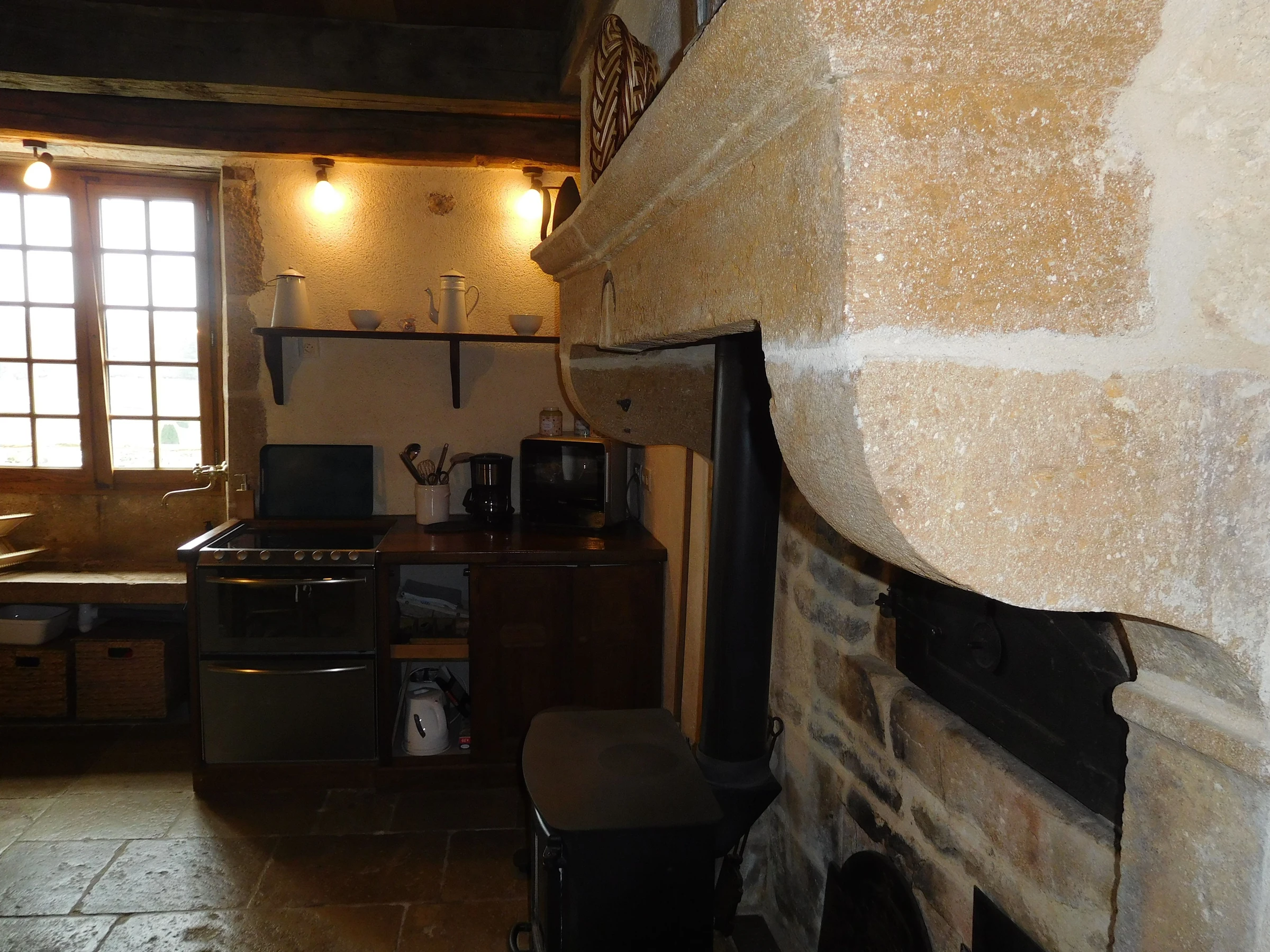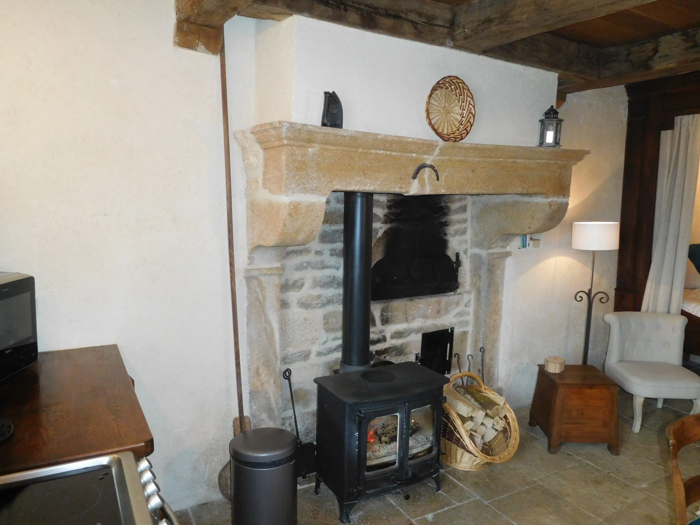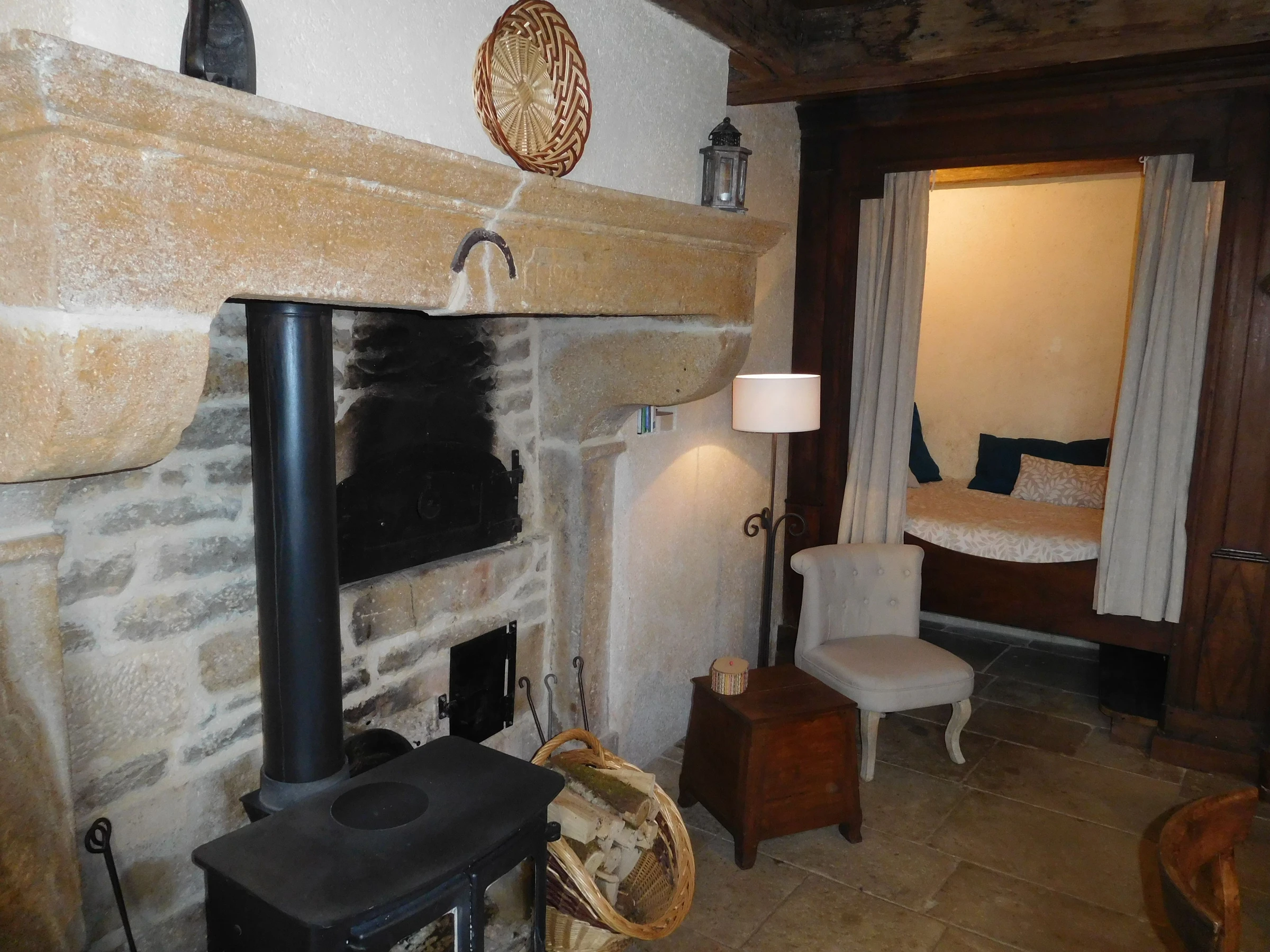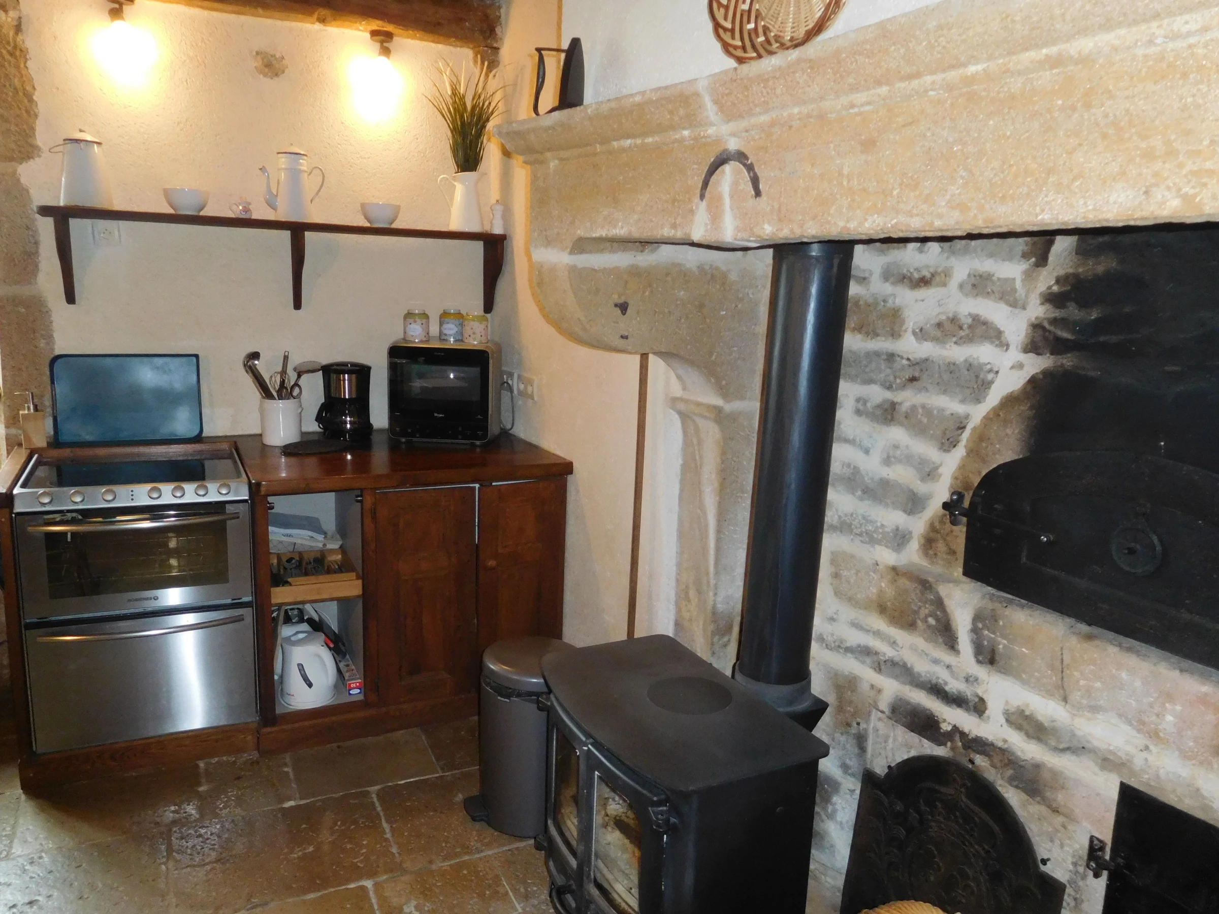 On the ground floor of the gîte: Living room, dining room with kitchen area (alcove: 1 extra single bed for a child).