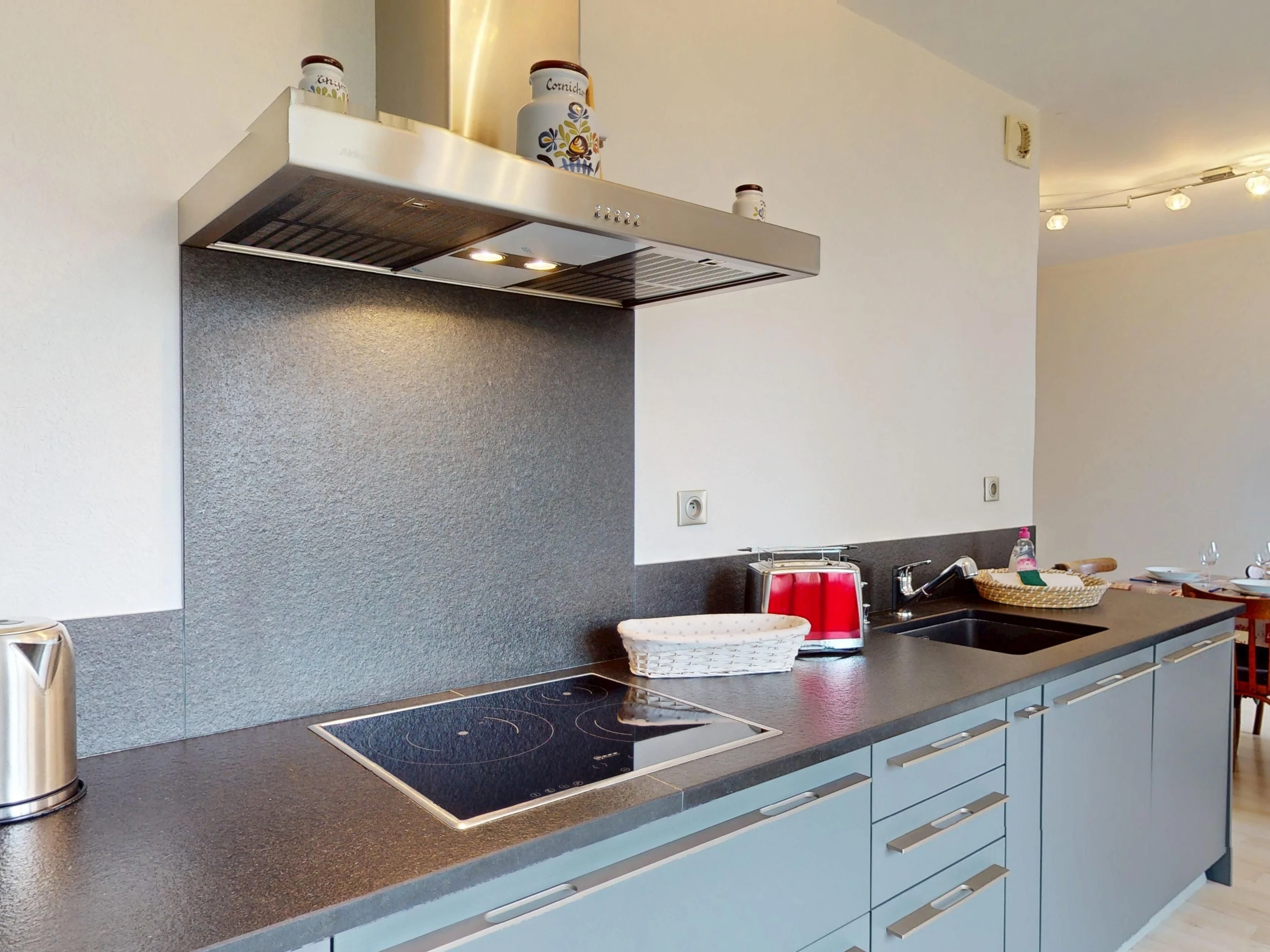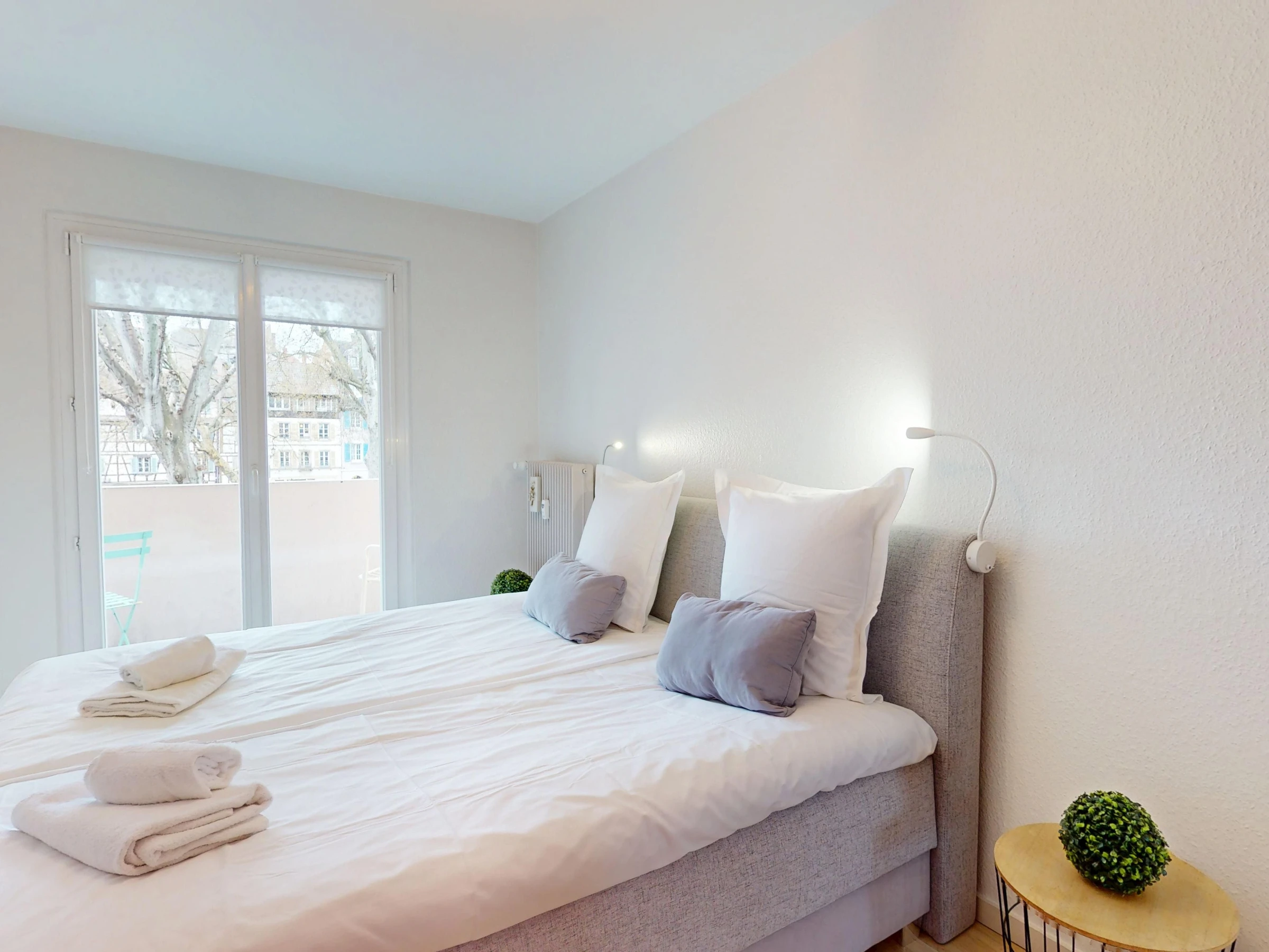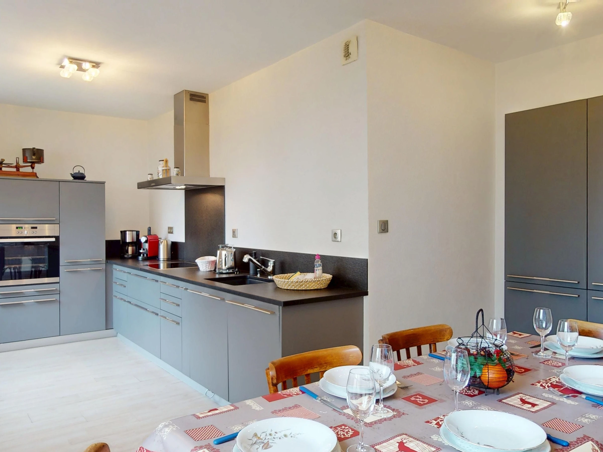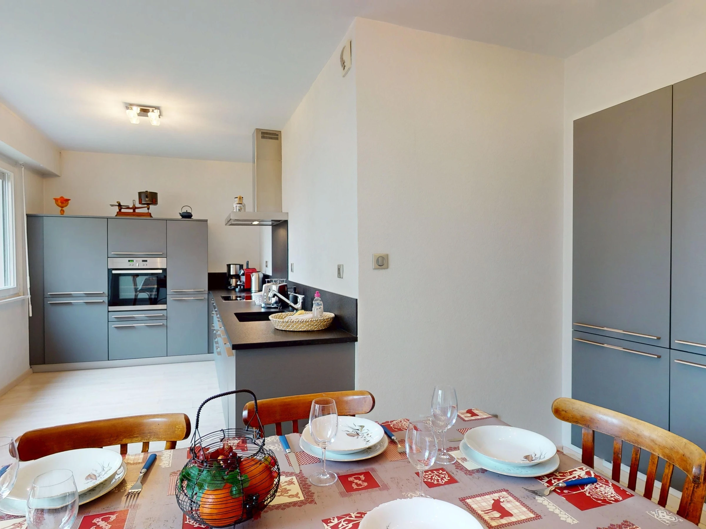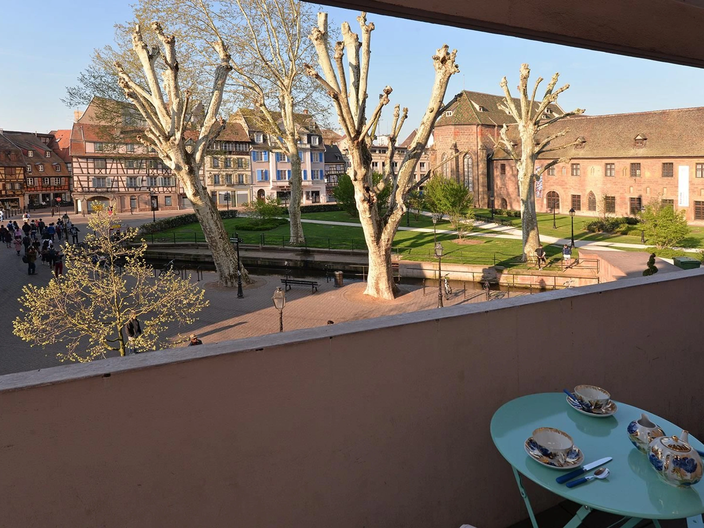 The apartment features a fully equipped kitchen with a Nespresso machine, kettle, toaster, refrigerator, freezer, oven, microwave, induction cooktop with range hood, dishwasher, and all necessary dishes and utensils, as well as a dining area and a television. You will also find a living room with a television and direct access to a balcony overlooking Place Unterlinden.