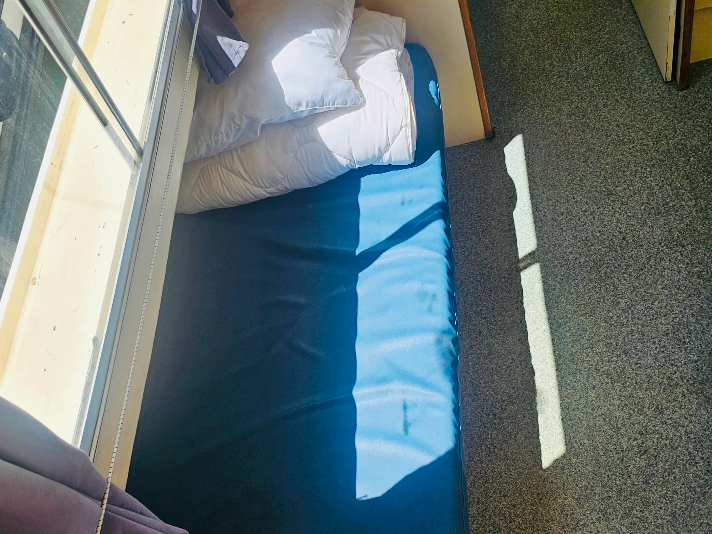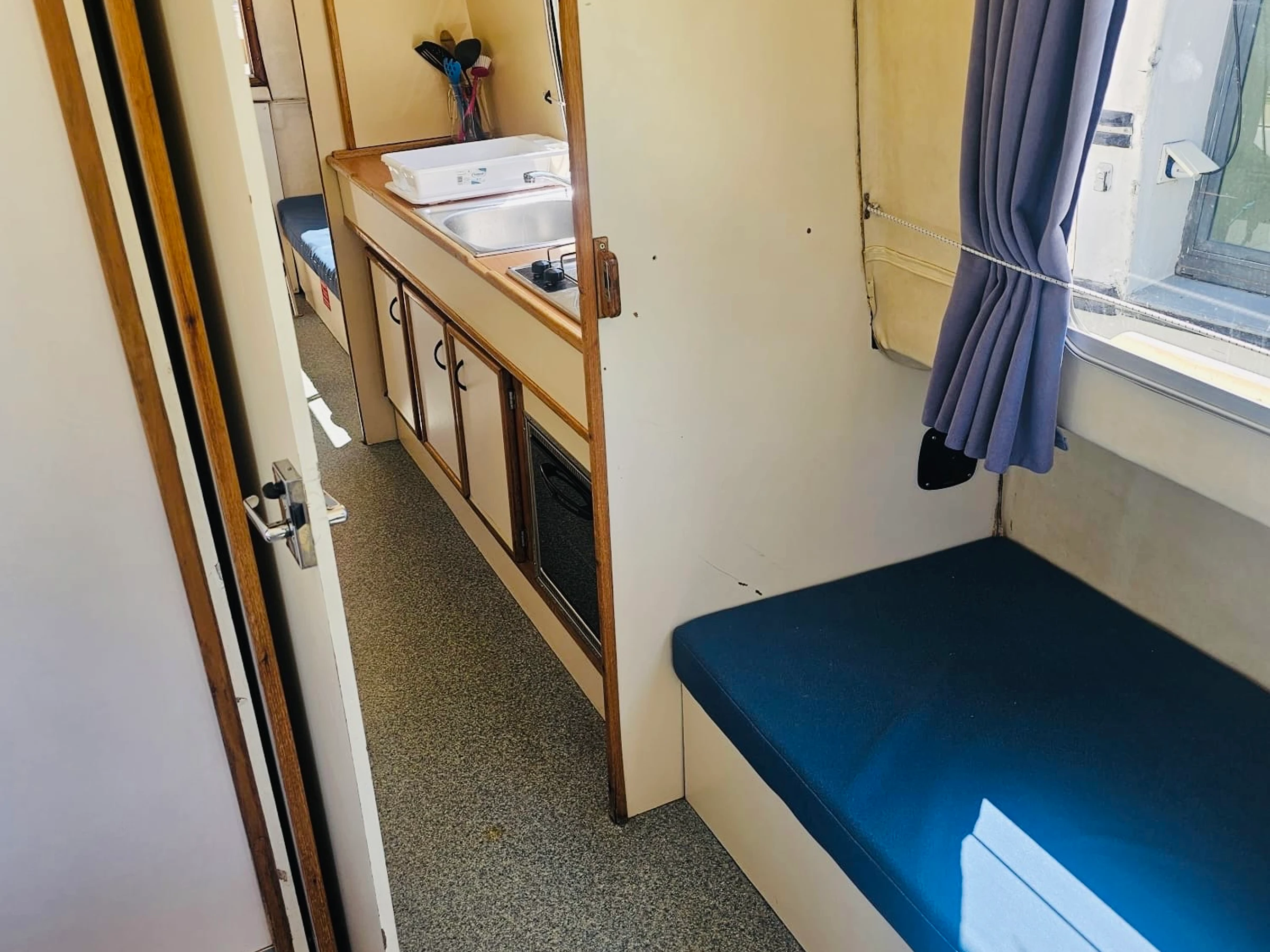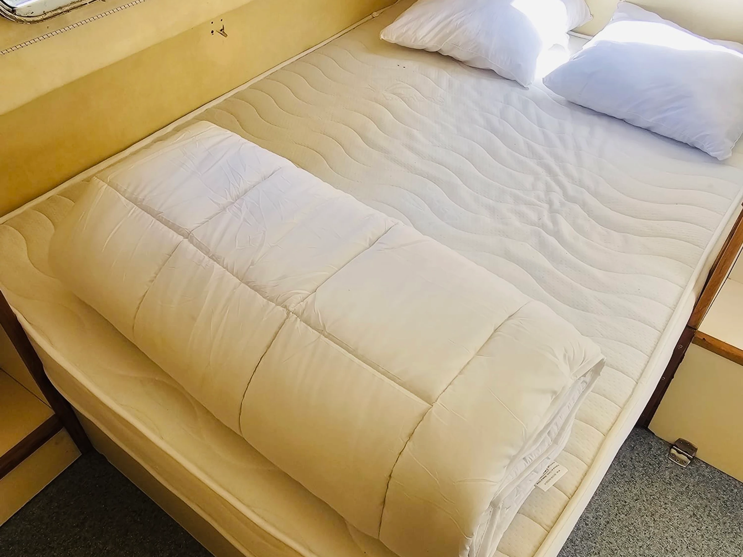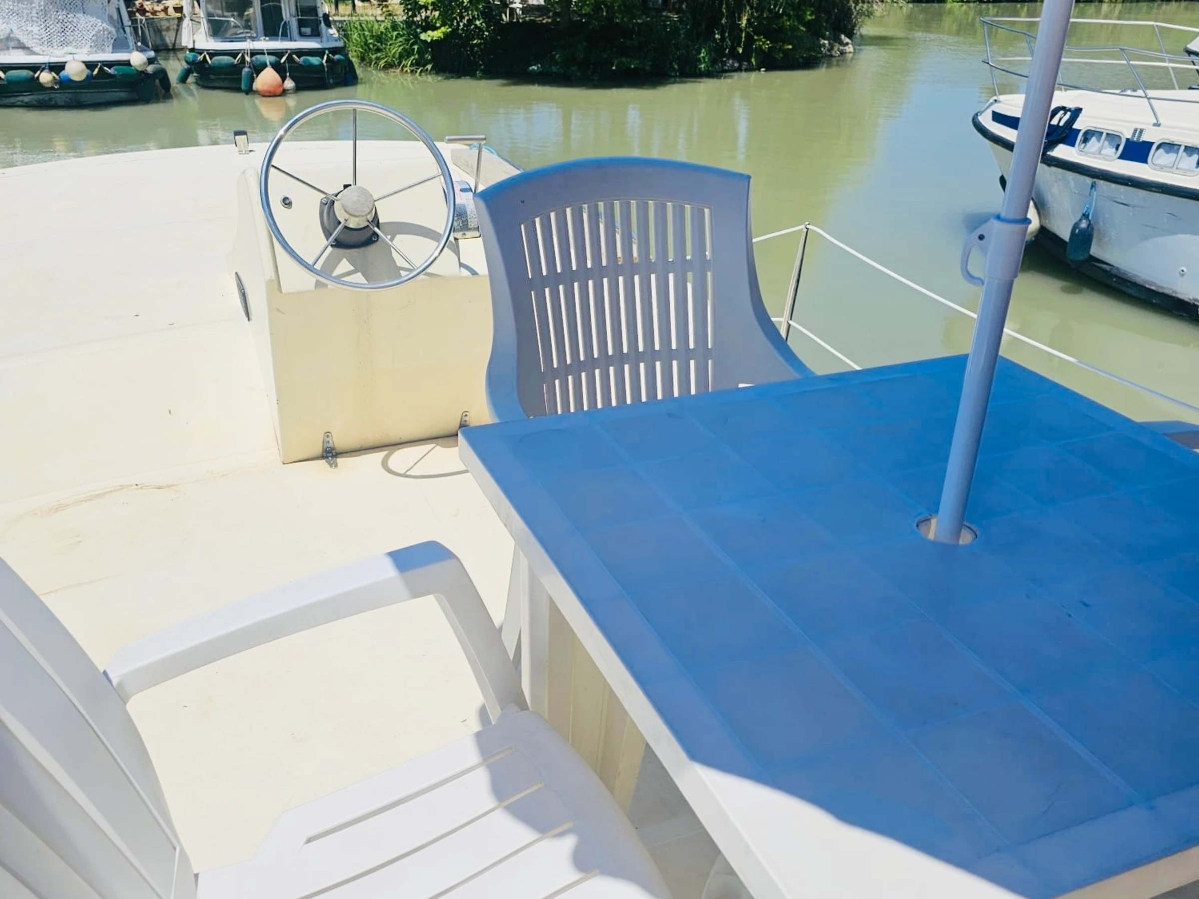 Come aboard the Eau Claire 930 Fly and enjoy comfortable accommodations for up to 6 people. You'll remain docked for the duration of your stay in a private space. The boat features a cabin with a double bed and a single bed, and a bathroom with a shower, sink, and toilet. The living area includes a kitchenette, a sofa bed that converts into a double bed, and a single sofa. A small outdoor area is accessible at the rear of the boat.