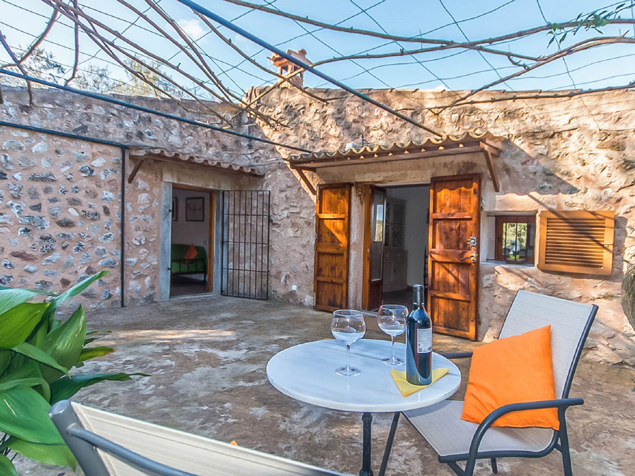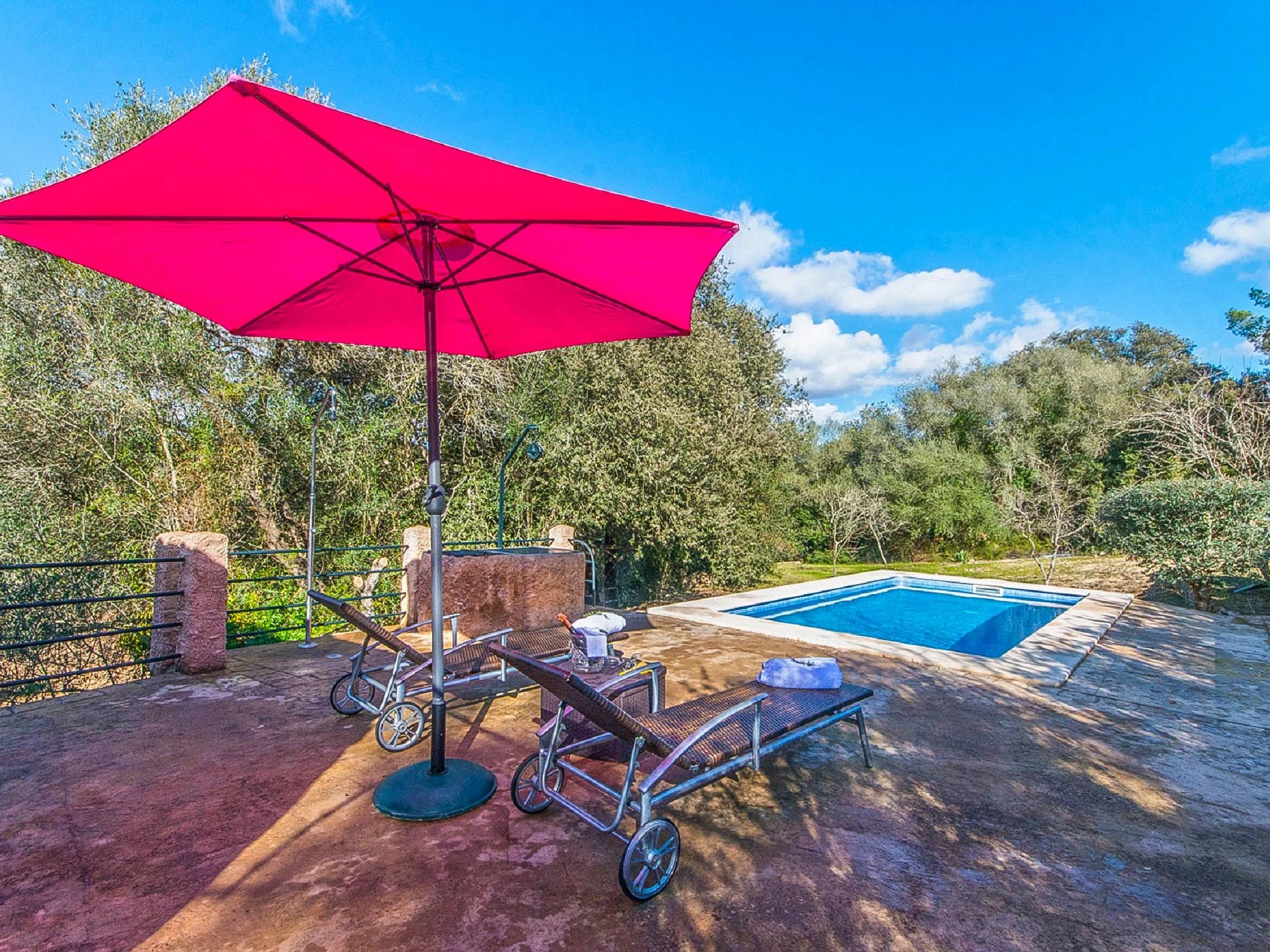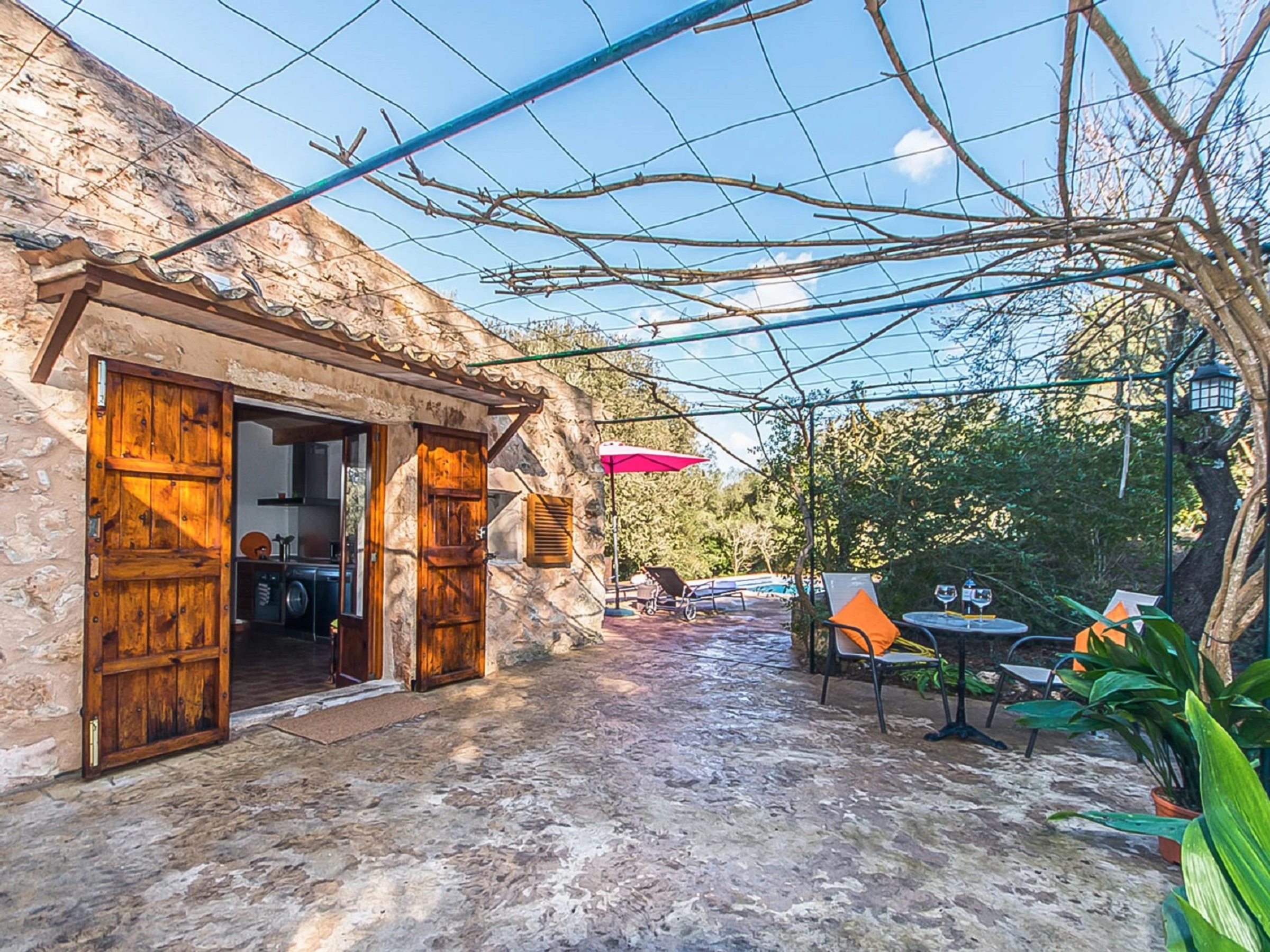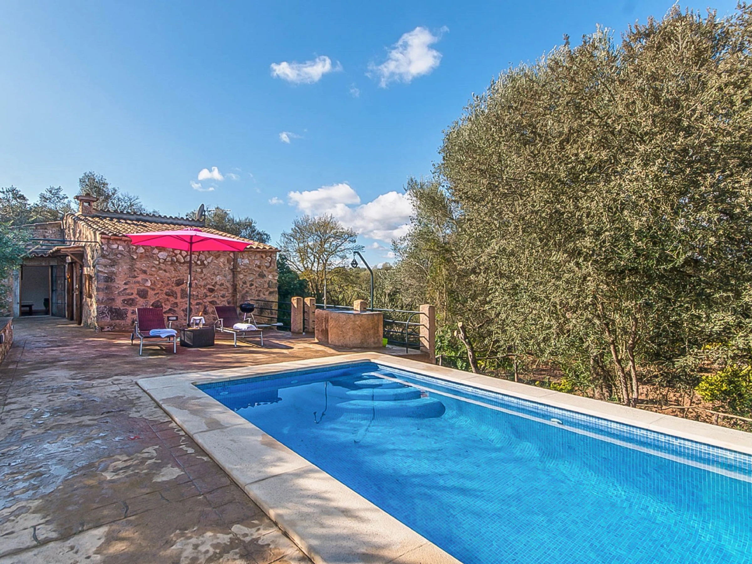 Costitx: Beautiful, cosy, rustic farm estate "Es Gorg", surrounded by trees and fields. Outside the resort Costitx, in a quiet, sunny position, 27 km from the sea, 27 km from the beach, in the countryside. Private: natural state property (fenced), flowers and trees, lawn for sunbathing, beautiful garden to relax, swimming pool angular (4 x 8 m, depth 100 - 200 cm, seasonal availability: [hidden] - [hidden] with salt water. Outdoor shower, patio, pergola, garden furniture, barbecue. In the house: internet access, WiFi, central heating system, air conditioning, washing machine. Parking at the house on the premises. Shop 2.5 km, grocery 2.5 km, supermarket 8 km, restaurant 8 km, bar 2.5 km, bakery 2.5 km, café 2.5 km, internet café 8 km, bicycle rental 9 km, pub garden 2.5 km, sandy beach "Ca'n Picafort" 27 km. Sports harbour 35 km, marina 35 km, golf course (18 hole) 38 km. Nearby attractions: Finca Son Bordils (Vineyards) 7 km, Mallorca Planetarium 3 km, Museo de Ciencia Natural 2.3 km. Please note: car recommended. Suitable for seniors baby equipment on request (included). Object suitable for 2 adults. Loading and unloading of baggage is possible at the holiday house. Airfield 30 km from the property.