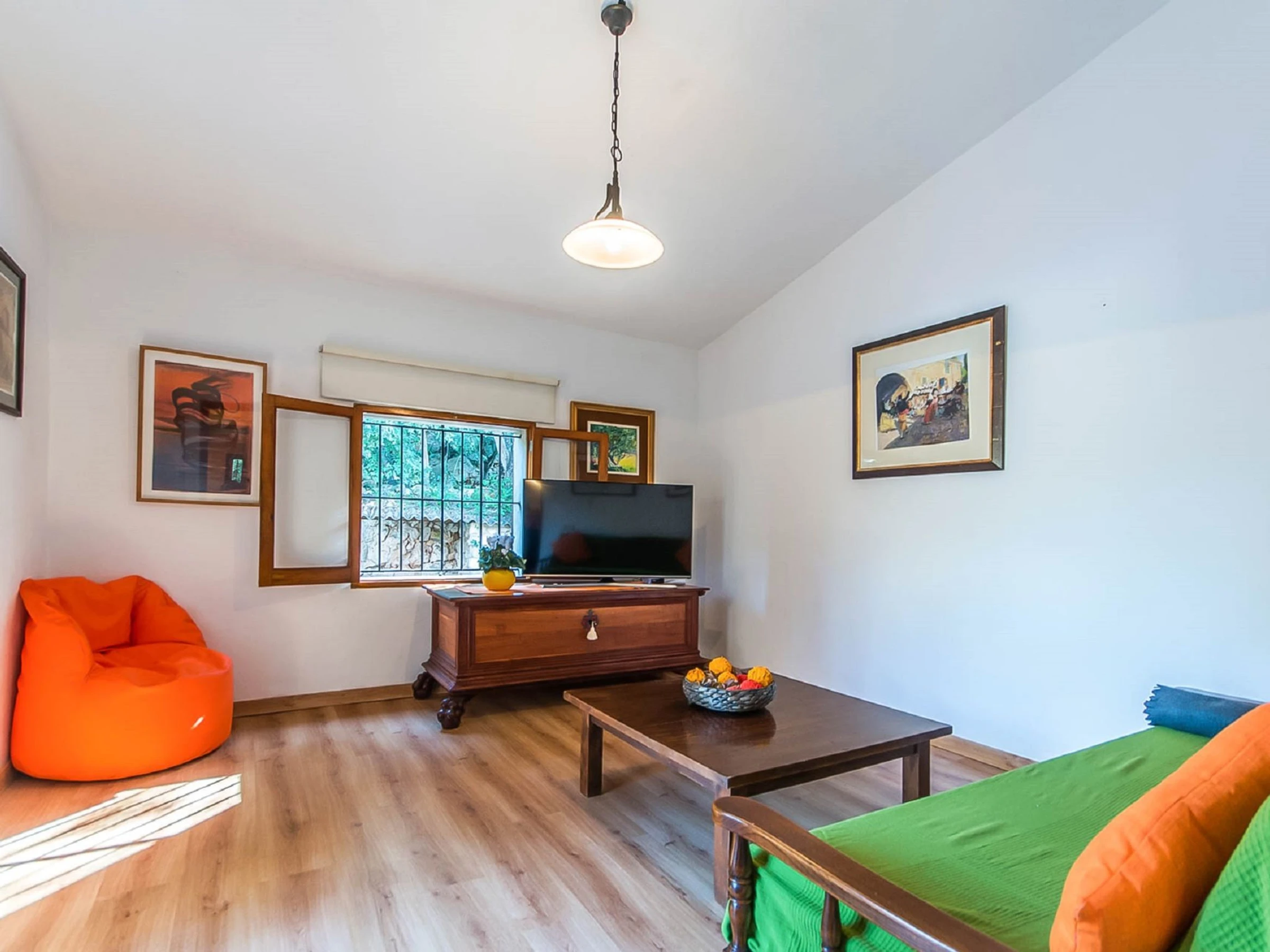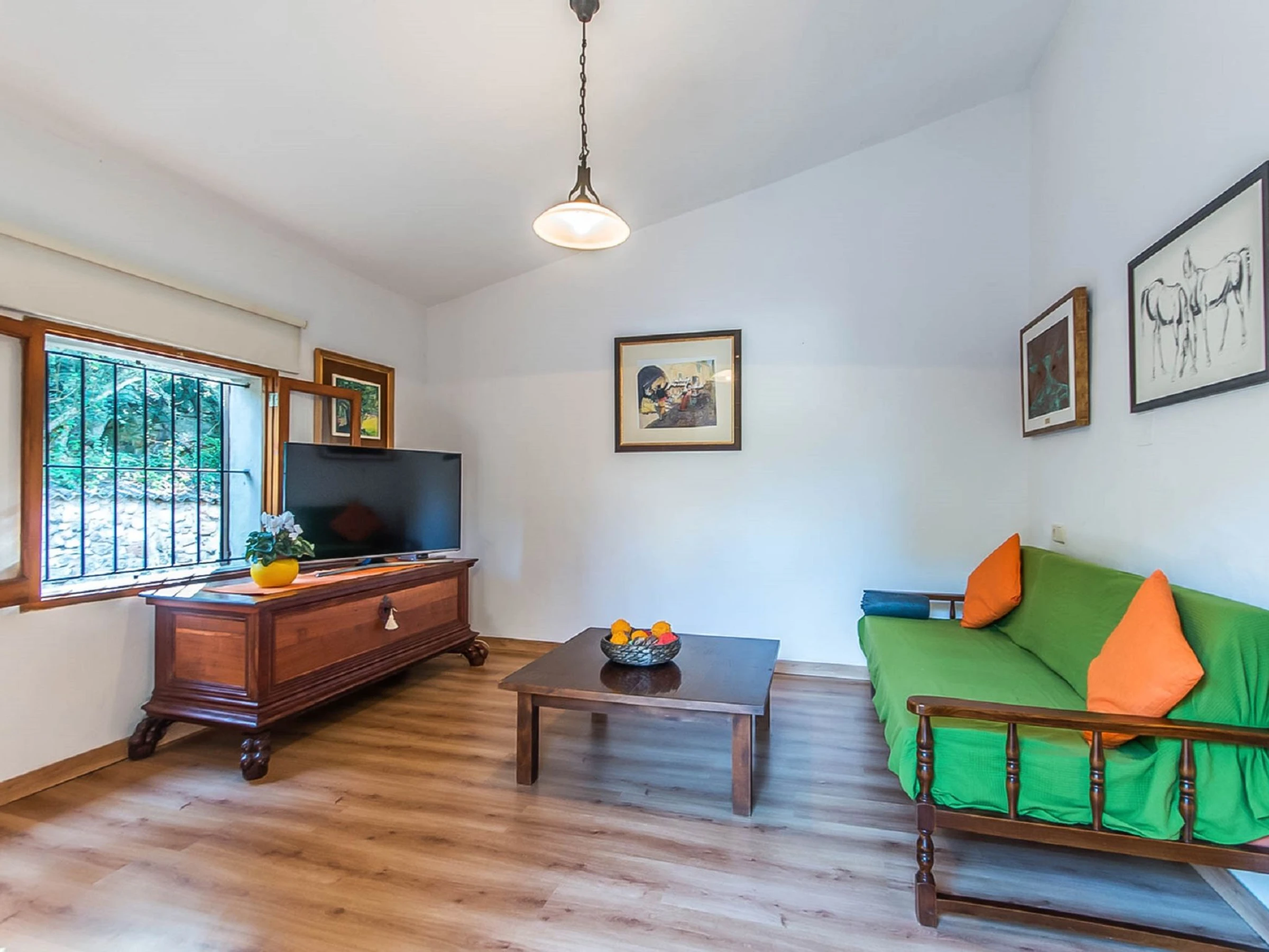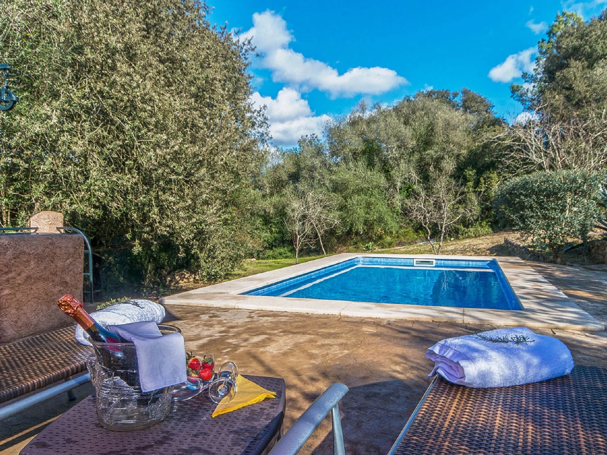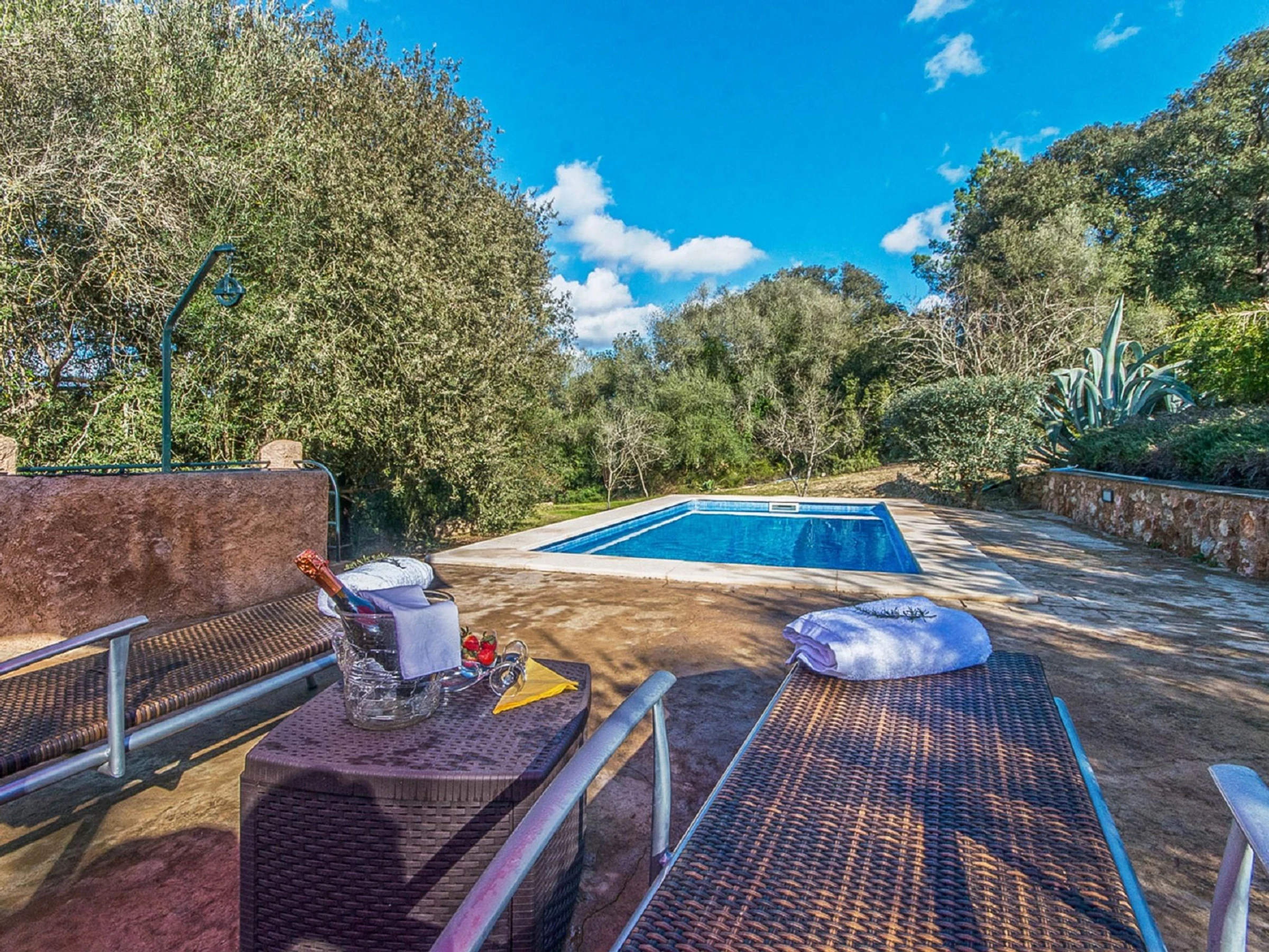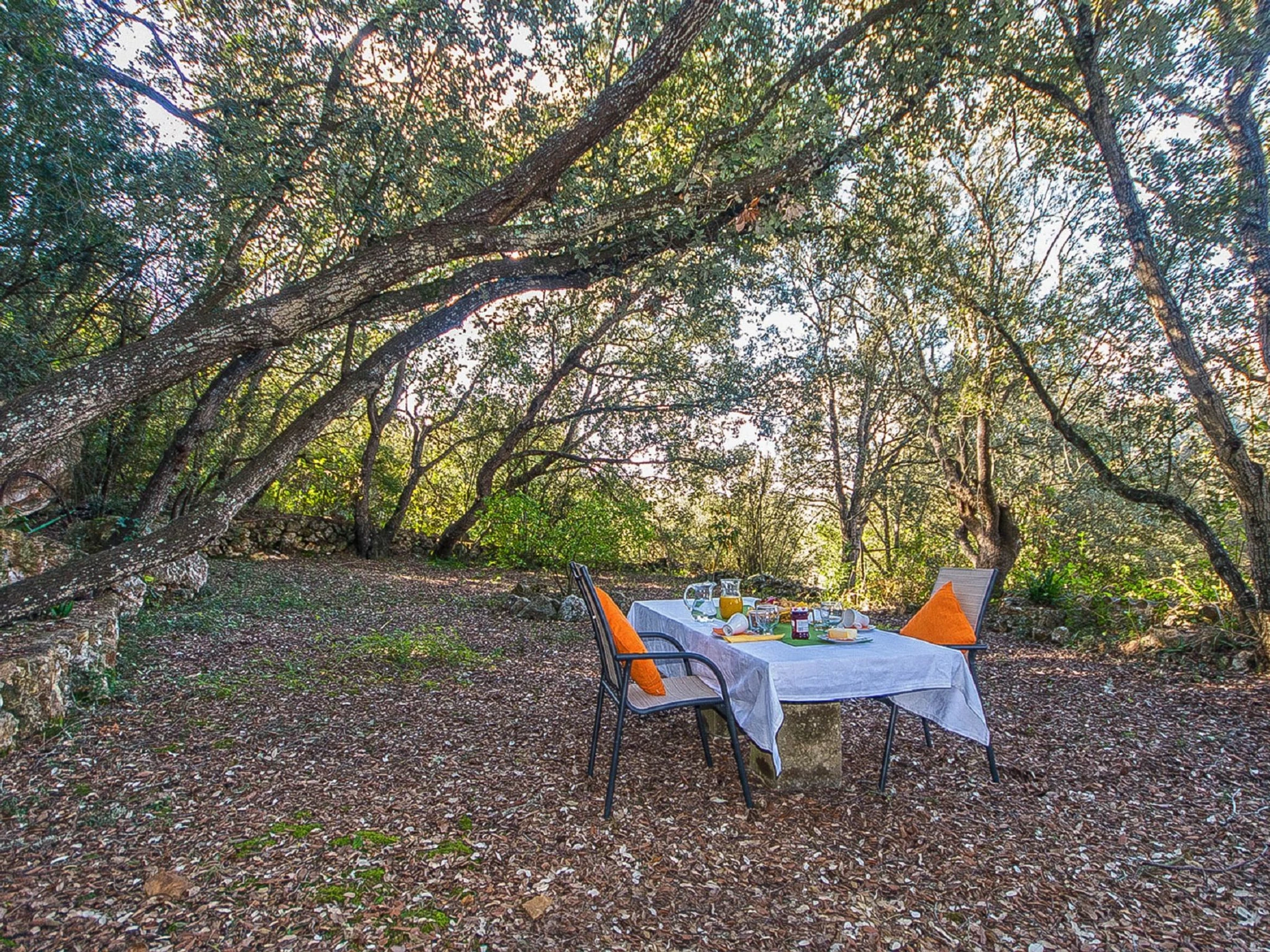 "Es Gorg", 2-room farmhouse 70 m2. Rustic and cosy furnishings: lounge with open-hearth fireplace, cable TV, digital TV and flat screen. Exit to the patio, to the swimming pool. 1 double bedroom with 1 double bed (150 cm, length 200 cm), air conditioning and forced-air heating. Kitchen-/living room (oven, dishwasher, 3 induction hot plates, toaster, kettle, microwave, freezer) with open-hearth fireplace. Exit to the patio, to the swimming pool. Shower/bidet/WC. Patio. Terrace furniture, barbecue, deck chairs (2). View of the swimming pool, the garden, the countryside and the forest. Facilities: washing machine, iron, children's high chair, baby cot for up to 2 year olds, hair dryer. Internet (WiFi, free). [hidden]