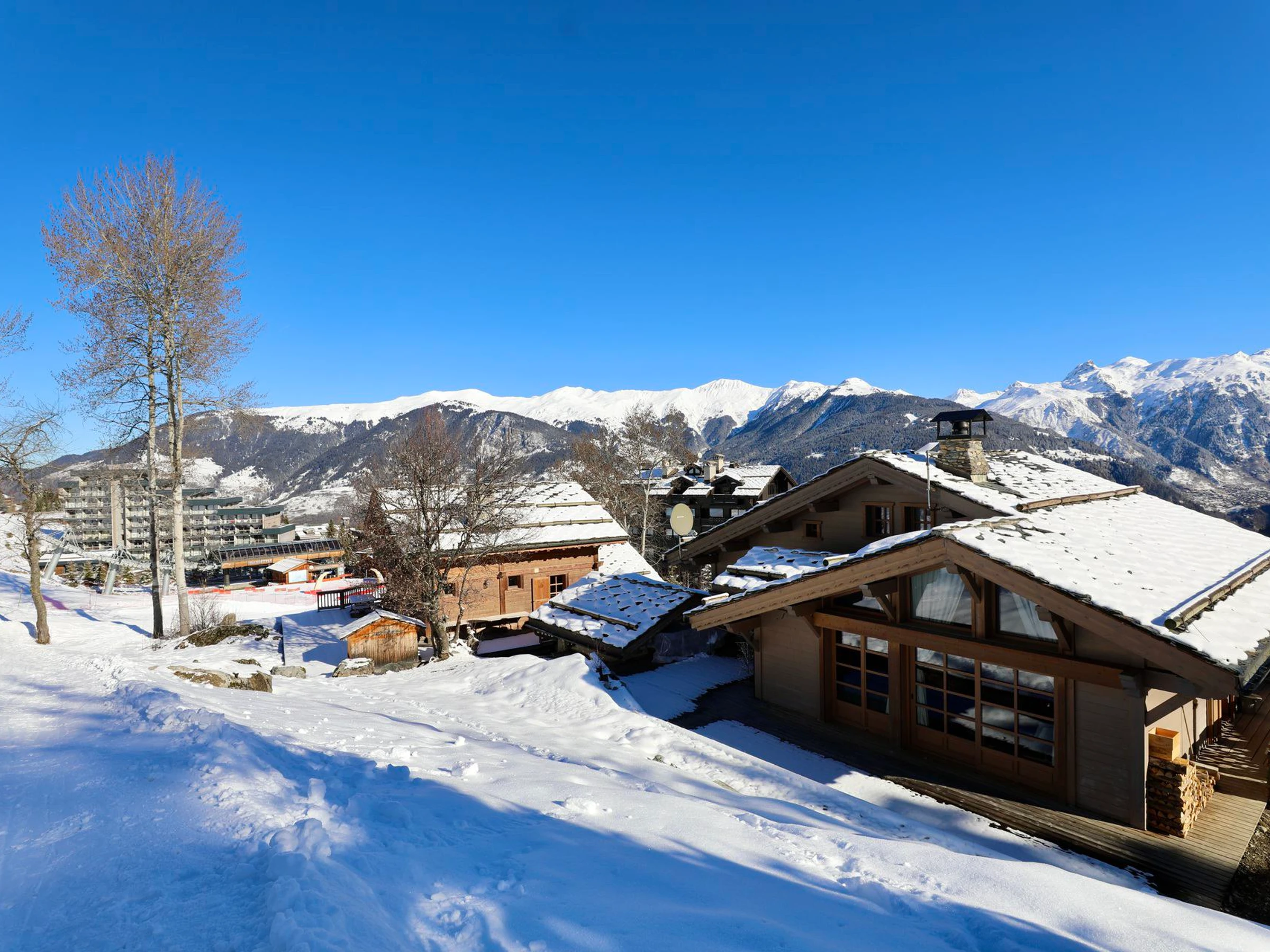 Admire panoramic views of the mountains and slopes from the illuminated balcony surrounding the spacious living room. Make yourself comfortable on the cozy sofas by the stone fireplace, ideal for cosy evenings. The dining room seats up to 14, and the modern kitchen, equipped with two ovens, two dishwashers and a Nespresso machine, offers everything you need for convivial meals.