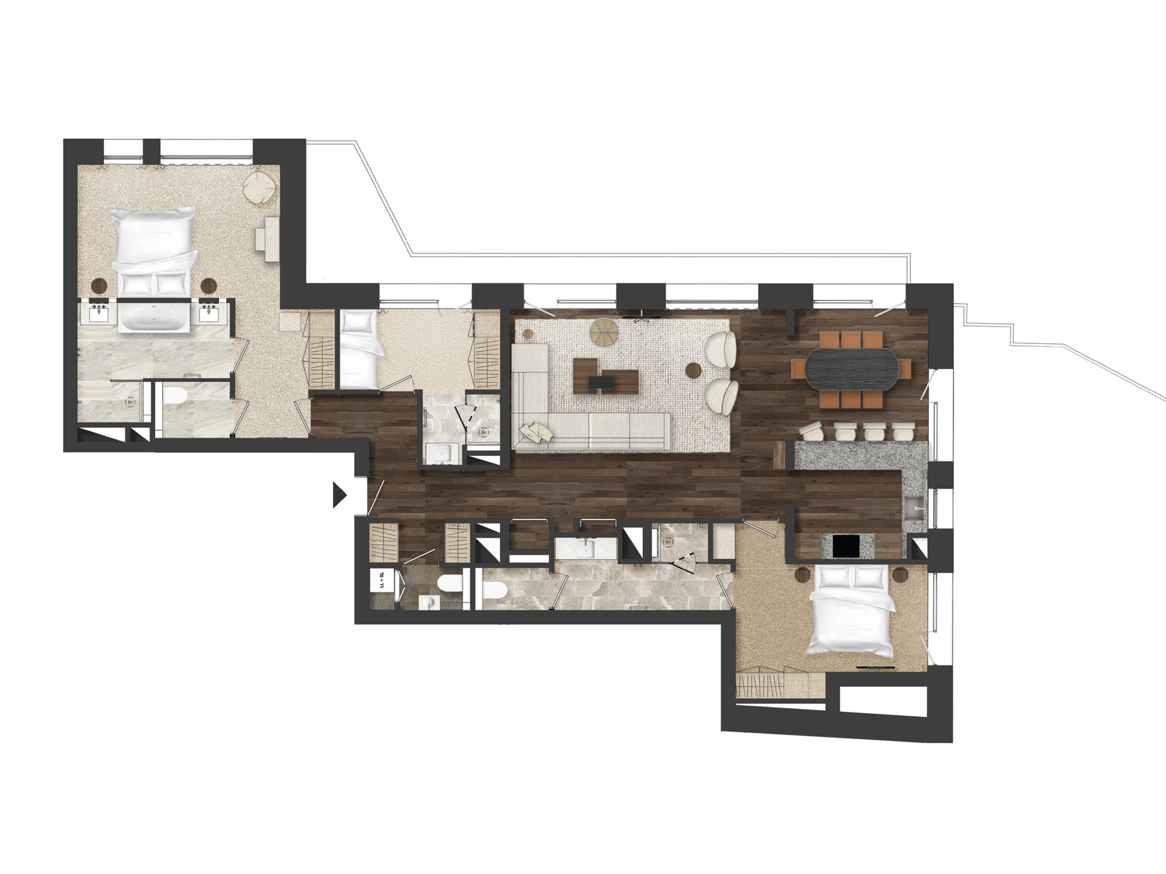 The apartment 402 boasts two luxurious suites and a children's bedroom for up to six people, each with its own bathroom. The spacious, light-filled living room adds to the comfort of this refined space. Direct access to a spacious, private, west-facing terrace on the ground floor provides an exceptional living environment that combines privacy and elegance. This 144 sqm home invites you to savour moments of conviviality in an environment that is both elegant and warm.