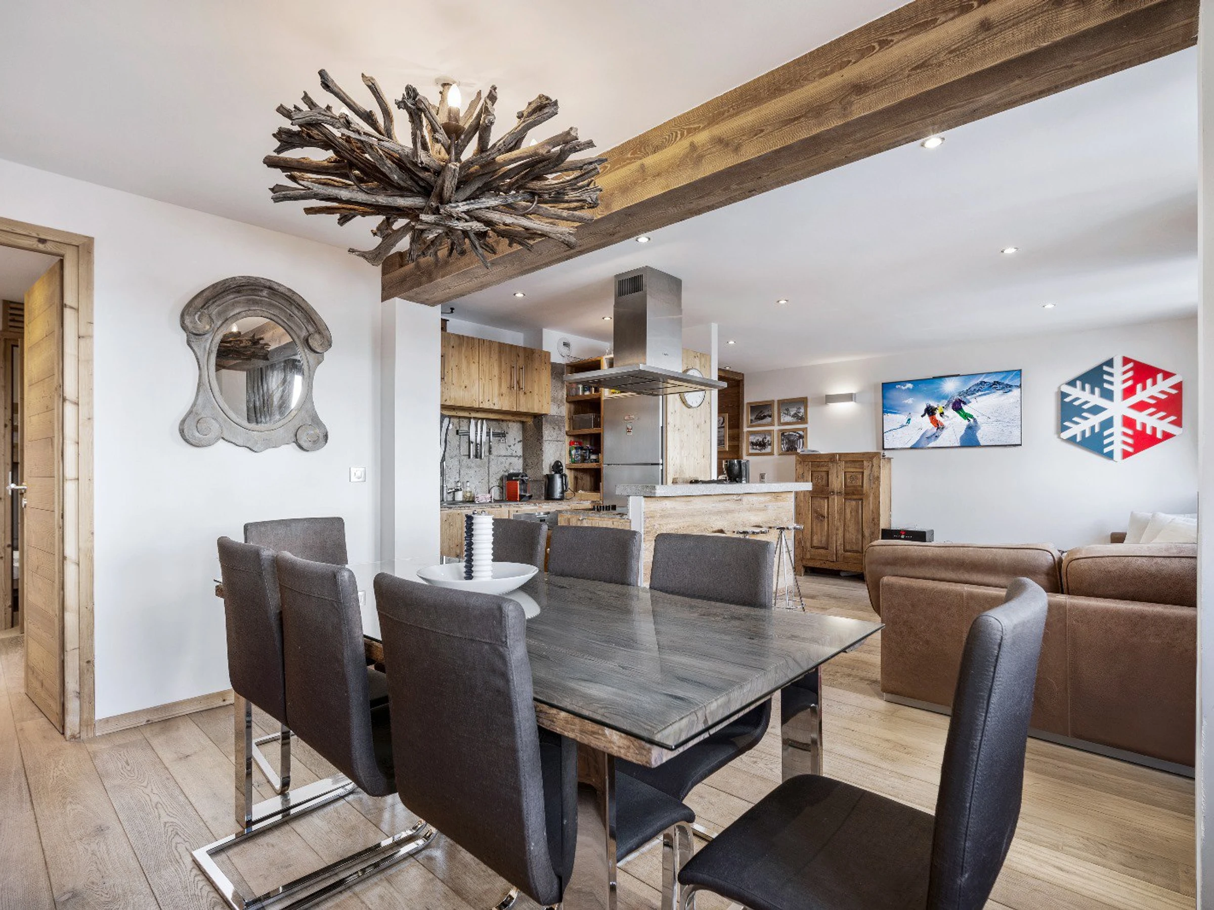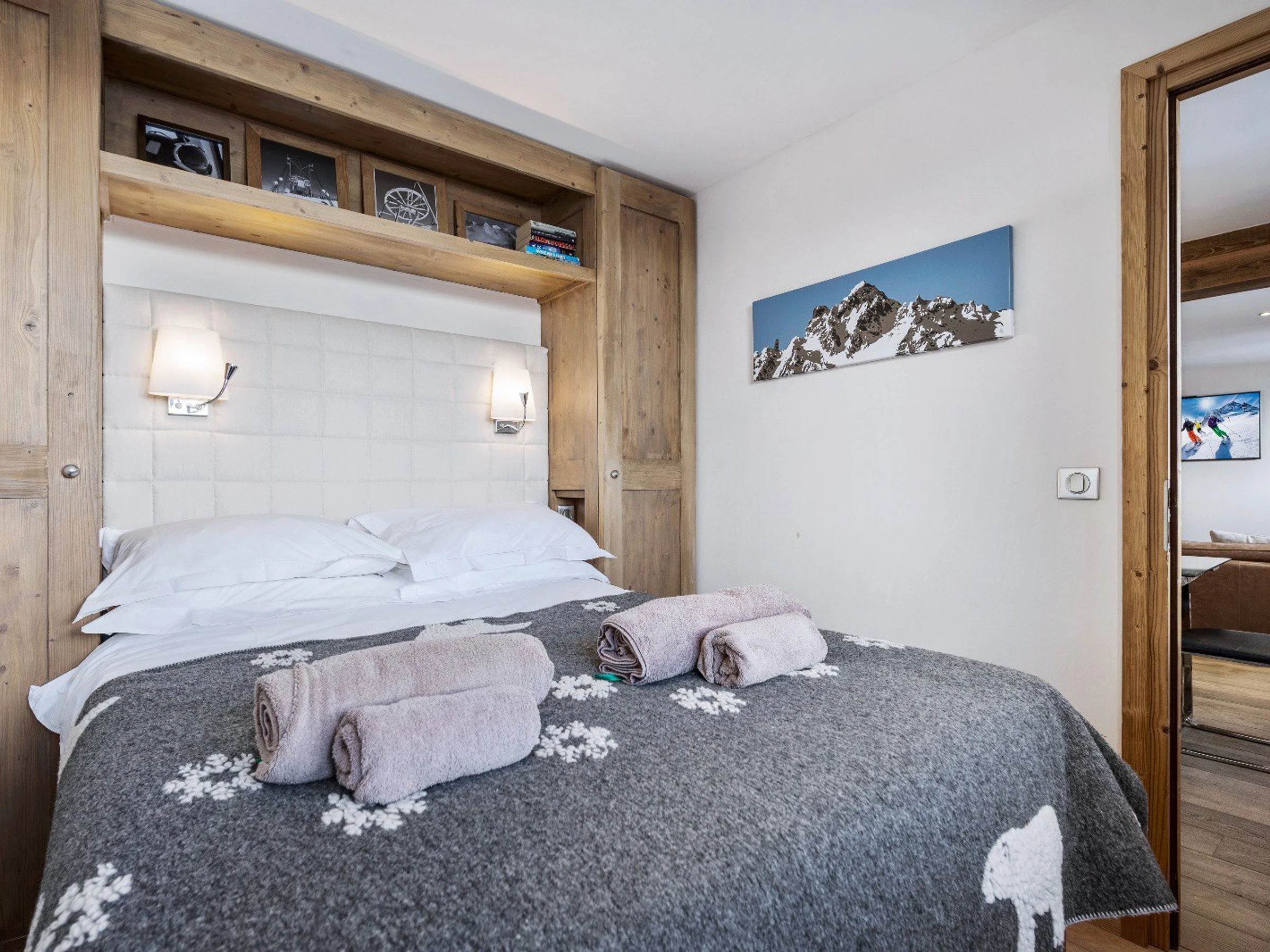 Apartment 330B, located in the Portes de Courchevel residence, enjoys an ideal location at the foot of the slopes and just steps from the shops. With a surface area of 77 sqm, it features 4 bedrooms, including a windowless cabin room, and comfortably accommodates 8 guests.