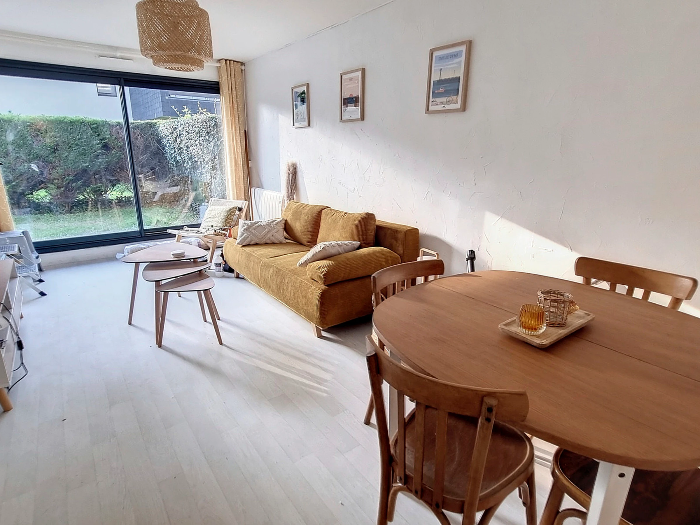 Appartement deux pièces pouvant accueillir quatre couchages situé dans une station balnéaire à 500m de la mer et des commerces dans une résidence sécurisée, en rez-de-chaussée avec jardin privatif exposé sud comprenant une entrée, séjour avec canapé convertible, cuisine ouverte équipée, une chambre avec un lit de 140x160, une salle de bains, w-c indépendant.