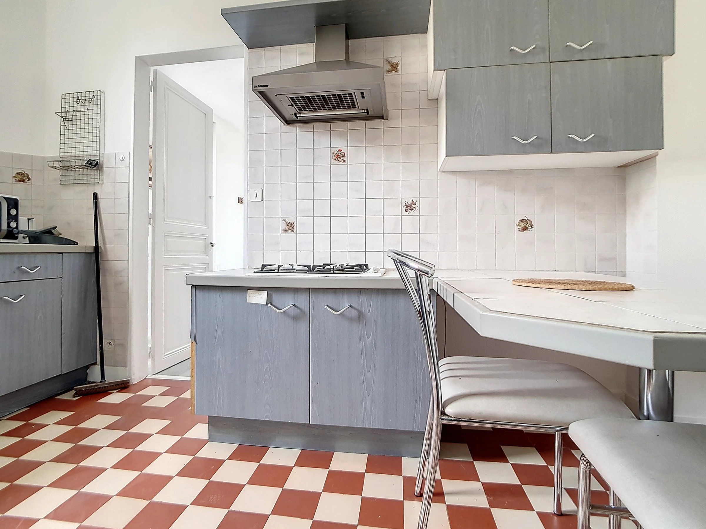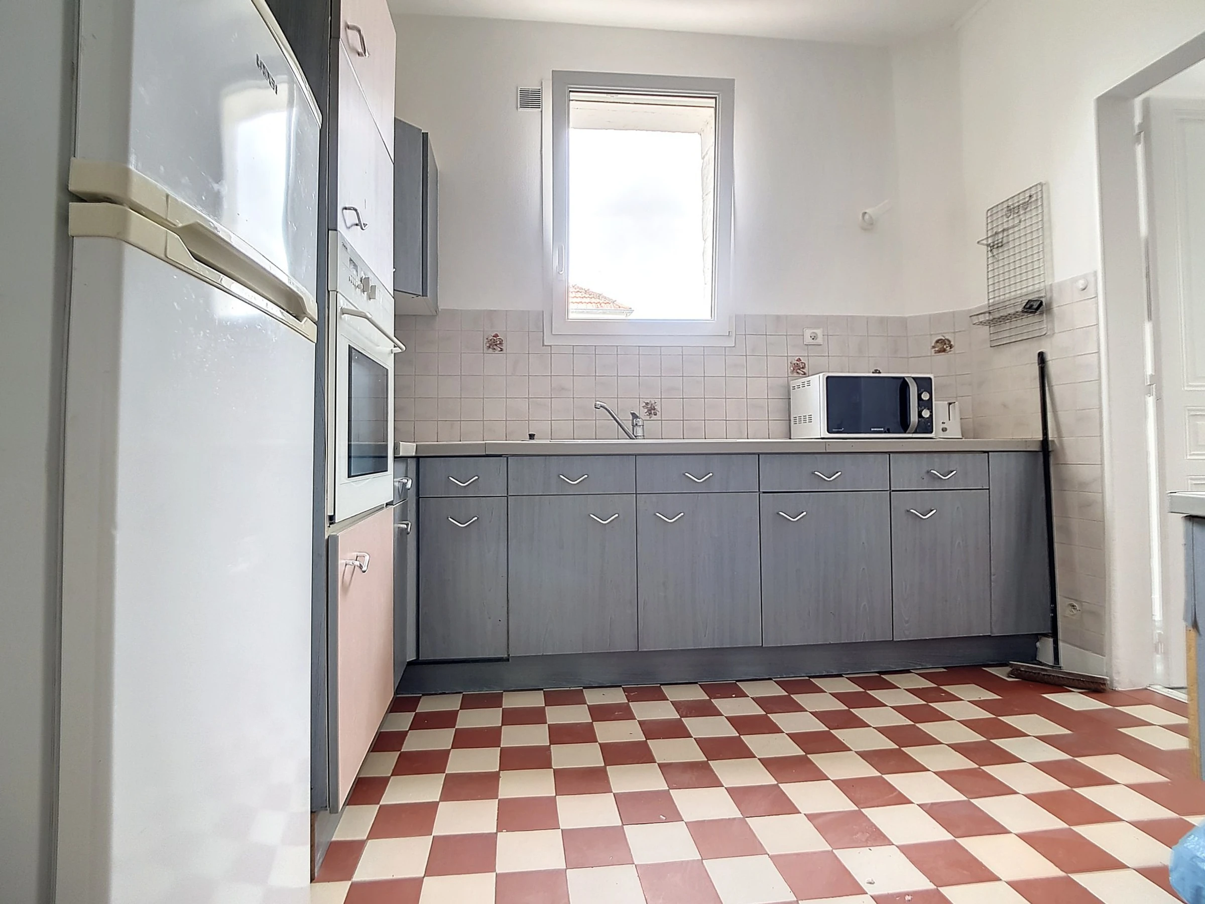 - Une cuisine aménagée avec frigidaire-congélateur, gazinière avec four plaque 3 feux gaz et un feux électrique, lave-linge, micro-onde