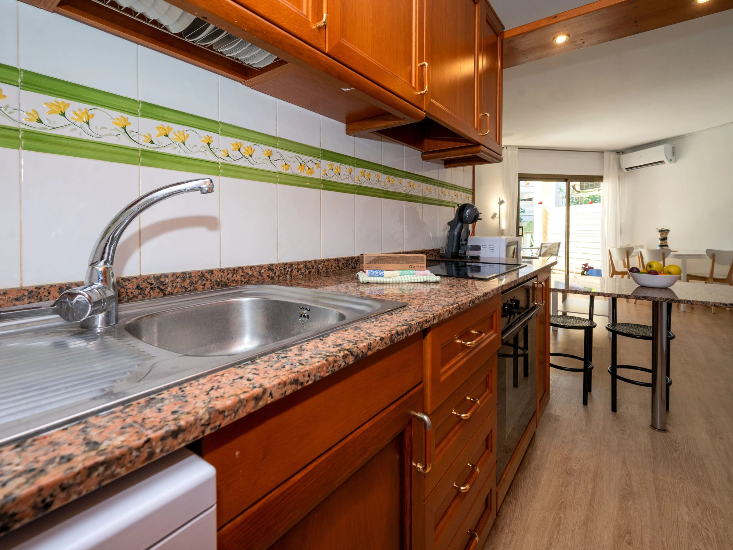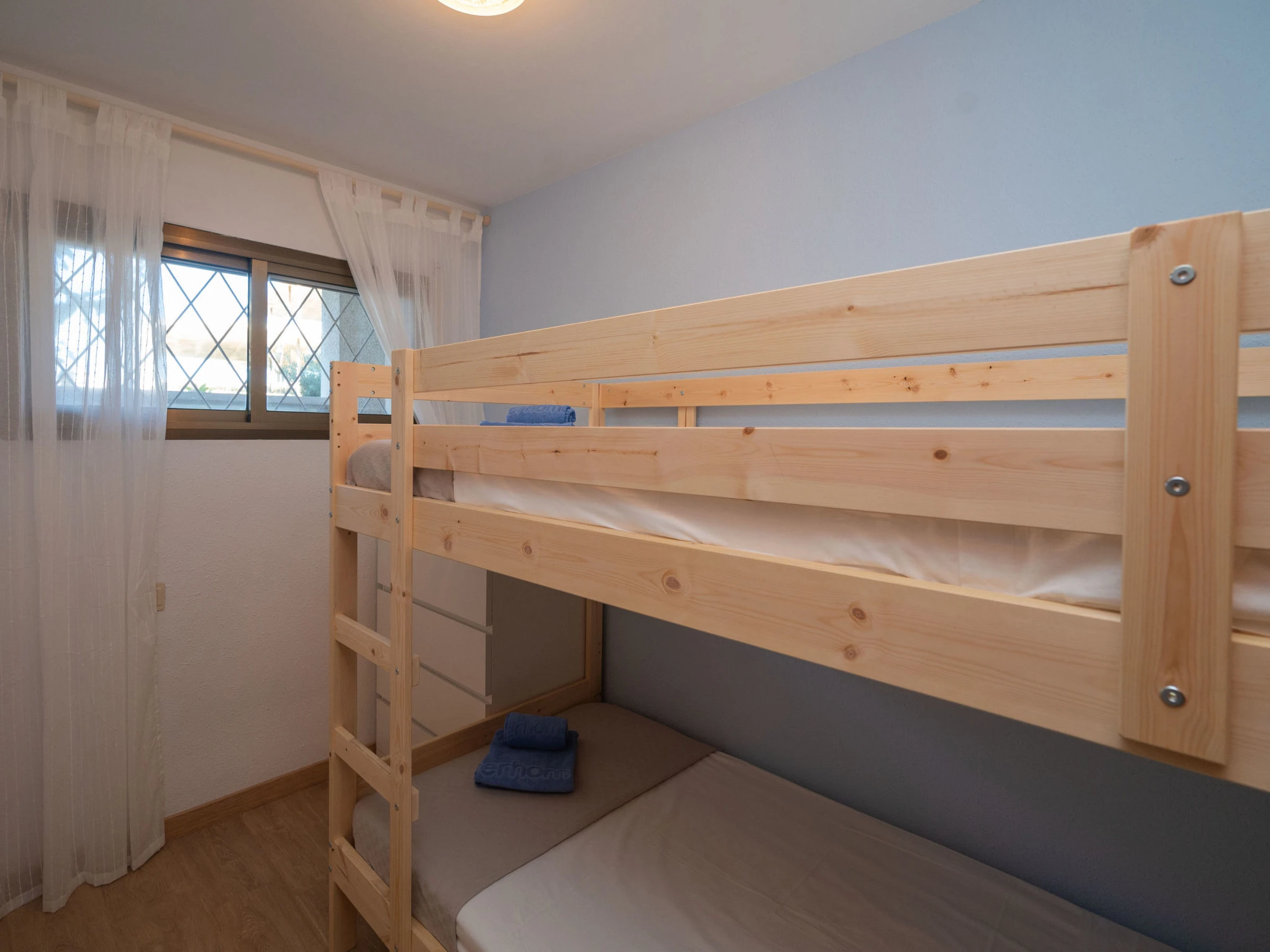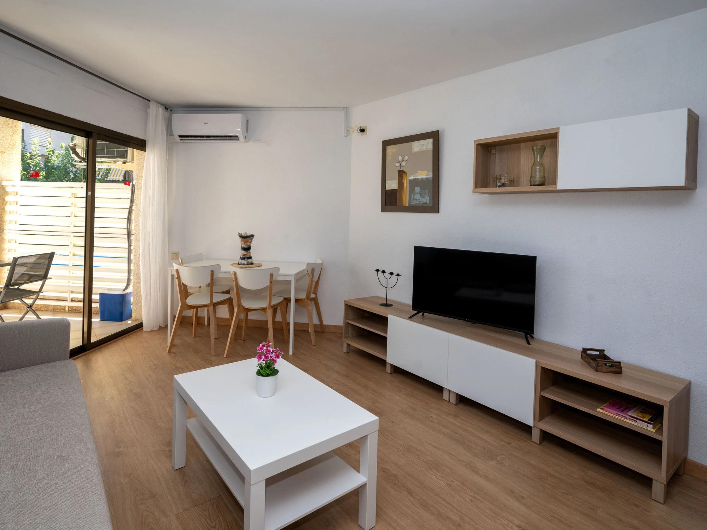 "Mimasol", 3-room apartment 76 m2, on the ground floor. Practical and modern furnishings: living/dining room with dining table, digital TV, flat screen, air conditioning and forced-air heating. Exit to the terrace. 1 room with 1 french bed (160 cm, length 200 cm) with 1 x 2 bunk beds (90 cm, length 200 cm). Kitchen (oven, dishwasher, 4 ceramic glass hob hotplates, microwave, electric coffee machine). Shower/WC. Terrace. Terrace furniture. View of the swimming pool. Facilities: washing machine, iron. Internet (WiFi, free). 1 pet/ dog allowed. table games. [hidden]