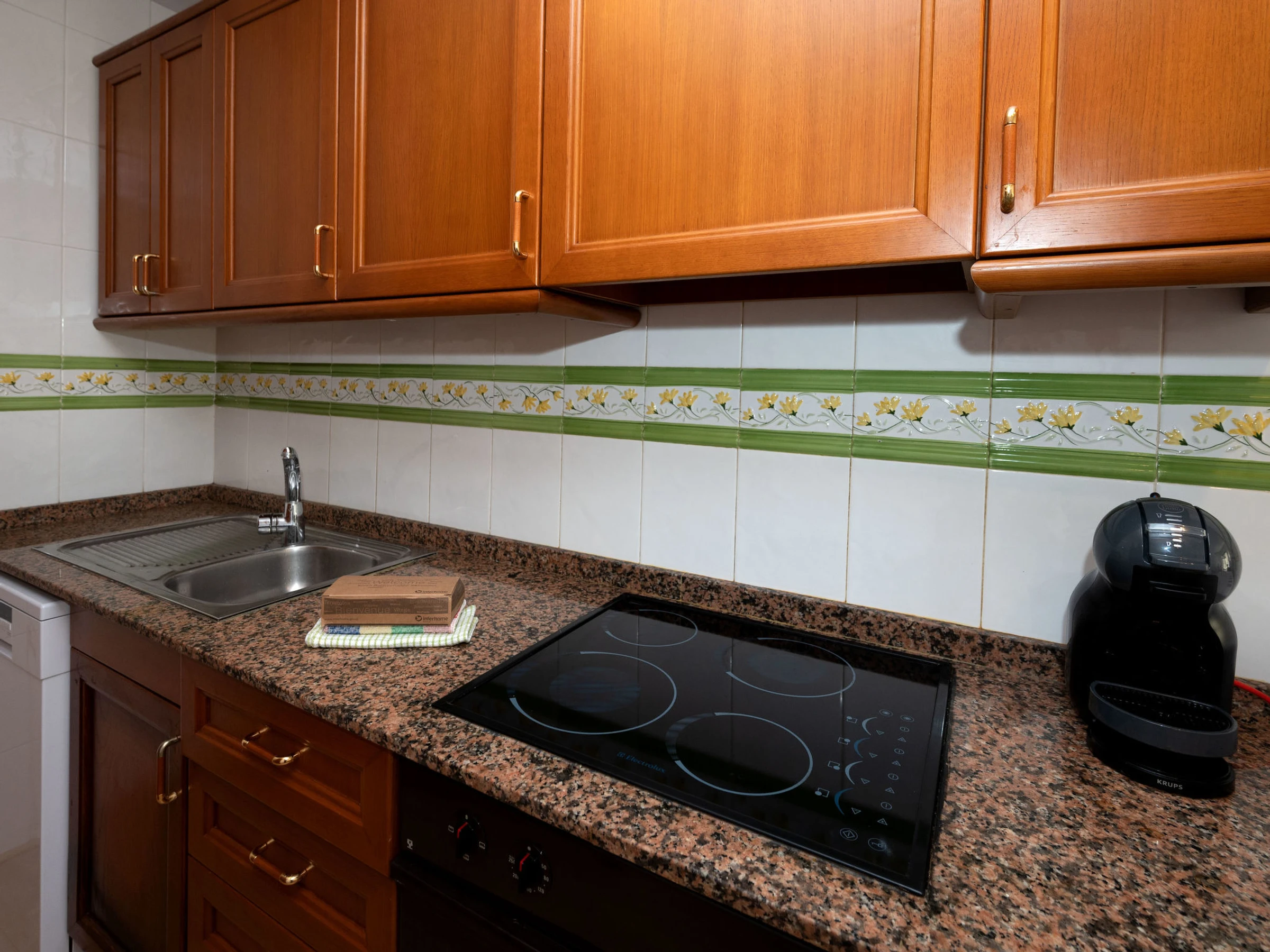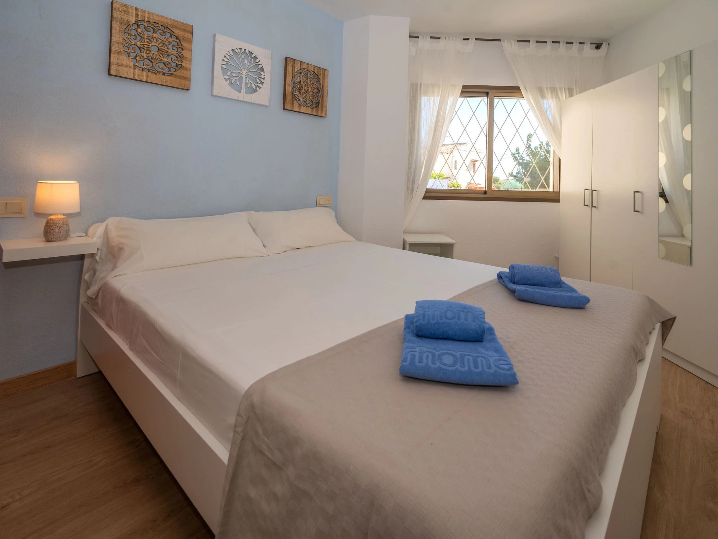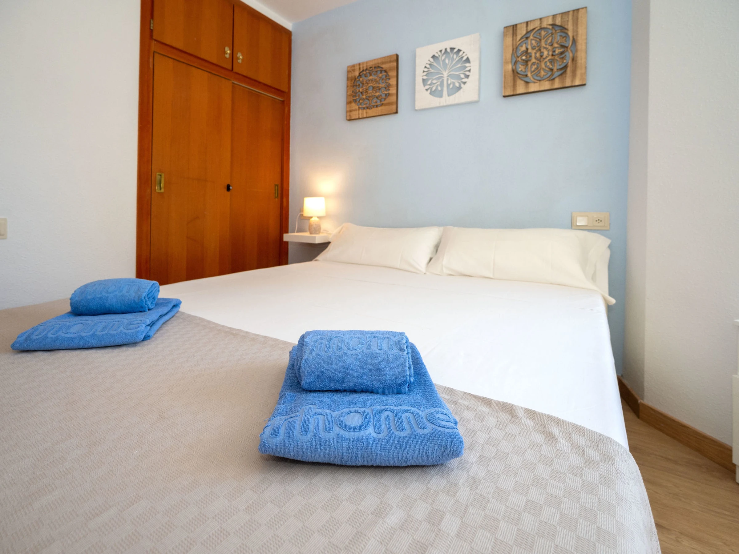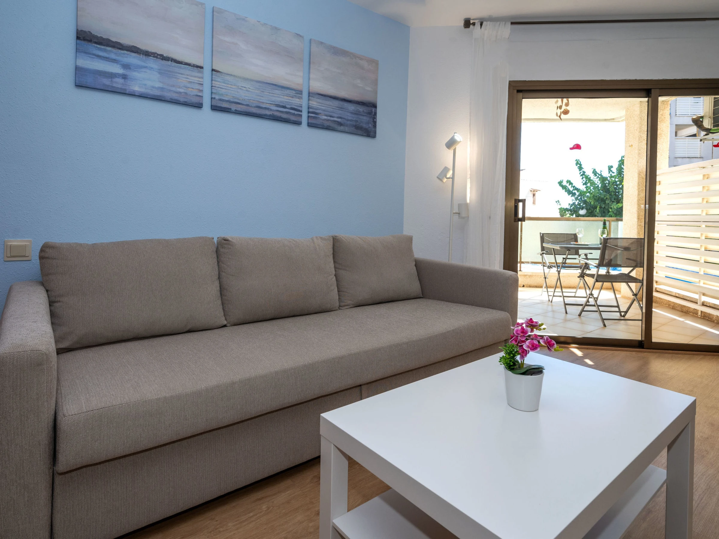"Mimasol", 3-room apartment 76 m2, on the ground floor. Practical and modern furnishings: living/dining room with dining table, digital TV, flat screen, air conditioning and forced-air heating. Exit to the terrace. 1 room with 1 french bed (160 cm, length 200 cm) with 1 x 2 bunk beds (90 cm, length 200 cm). Kitchen (oven, dishwasher, 4 ceramic glass hob hotplates, microwave, electric coffee machine). Shower/WC. Terrace. Terrace furniture. View of the swimming pool. Facilities: washing machine, iron. Internet (WiFi, free). 1 pet/ dog allowed. table games. [hidden]