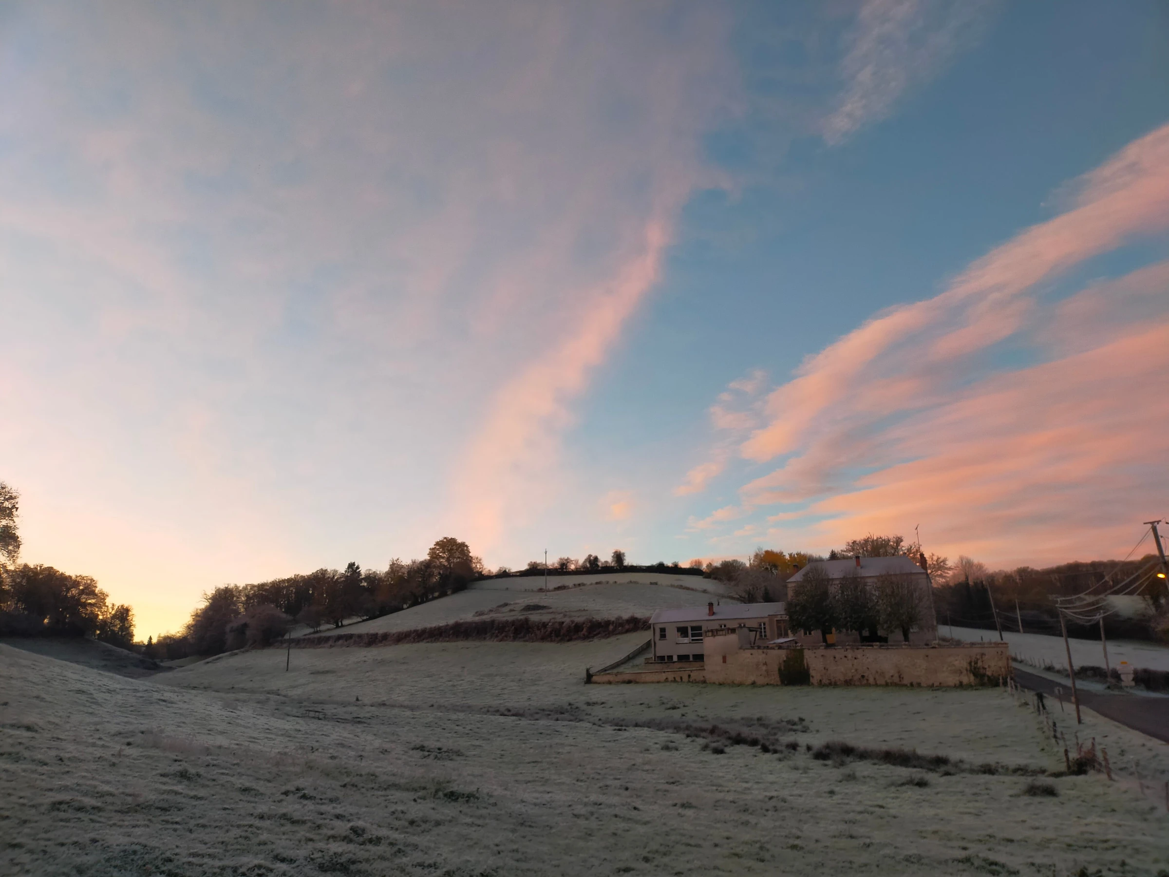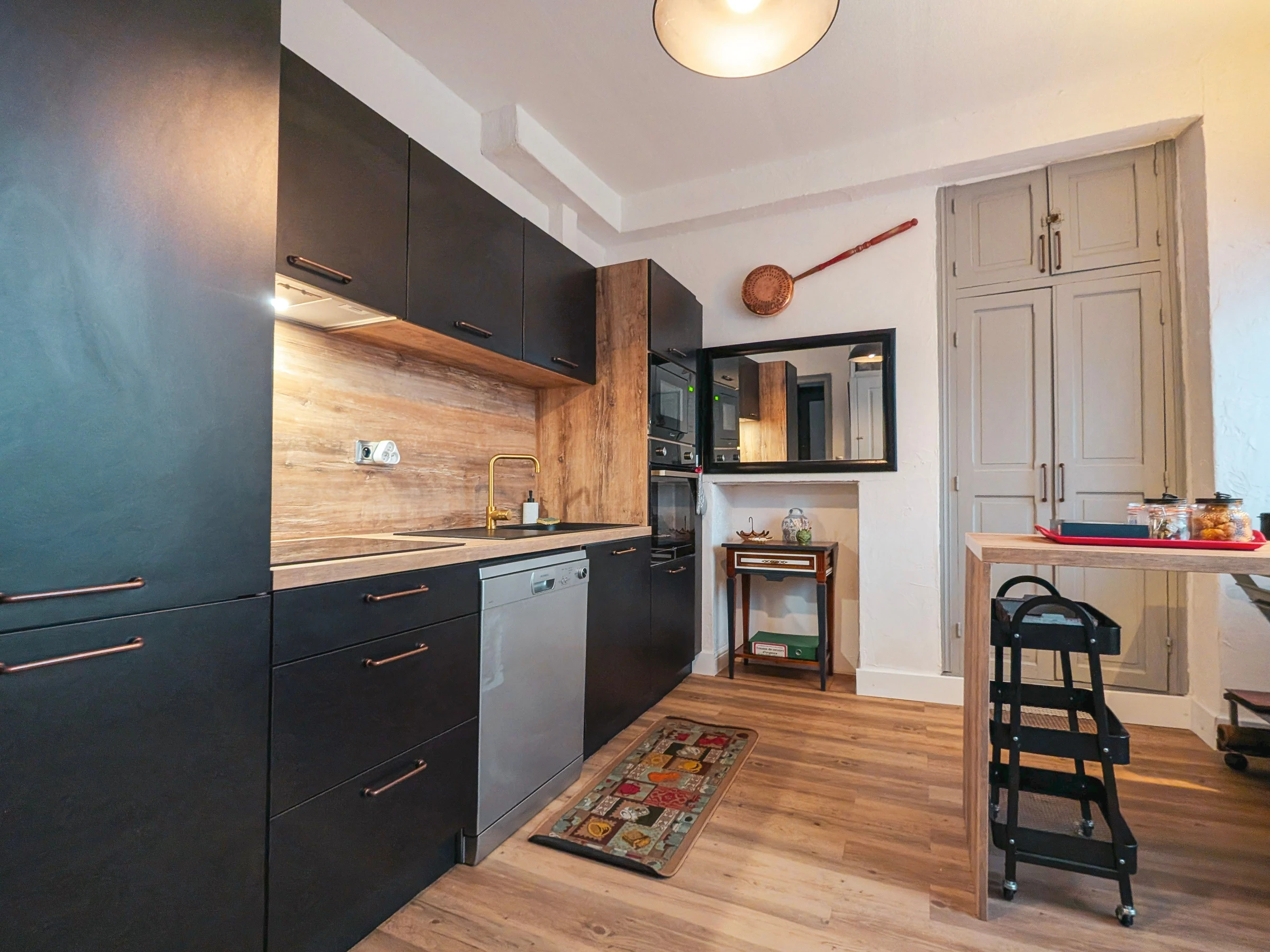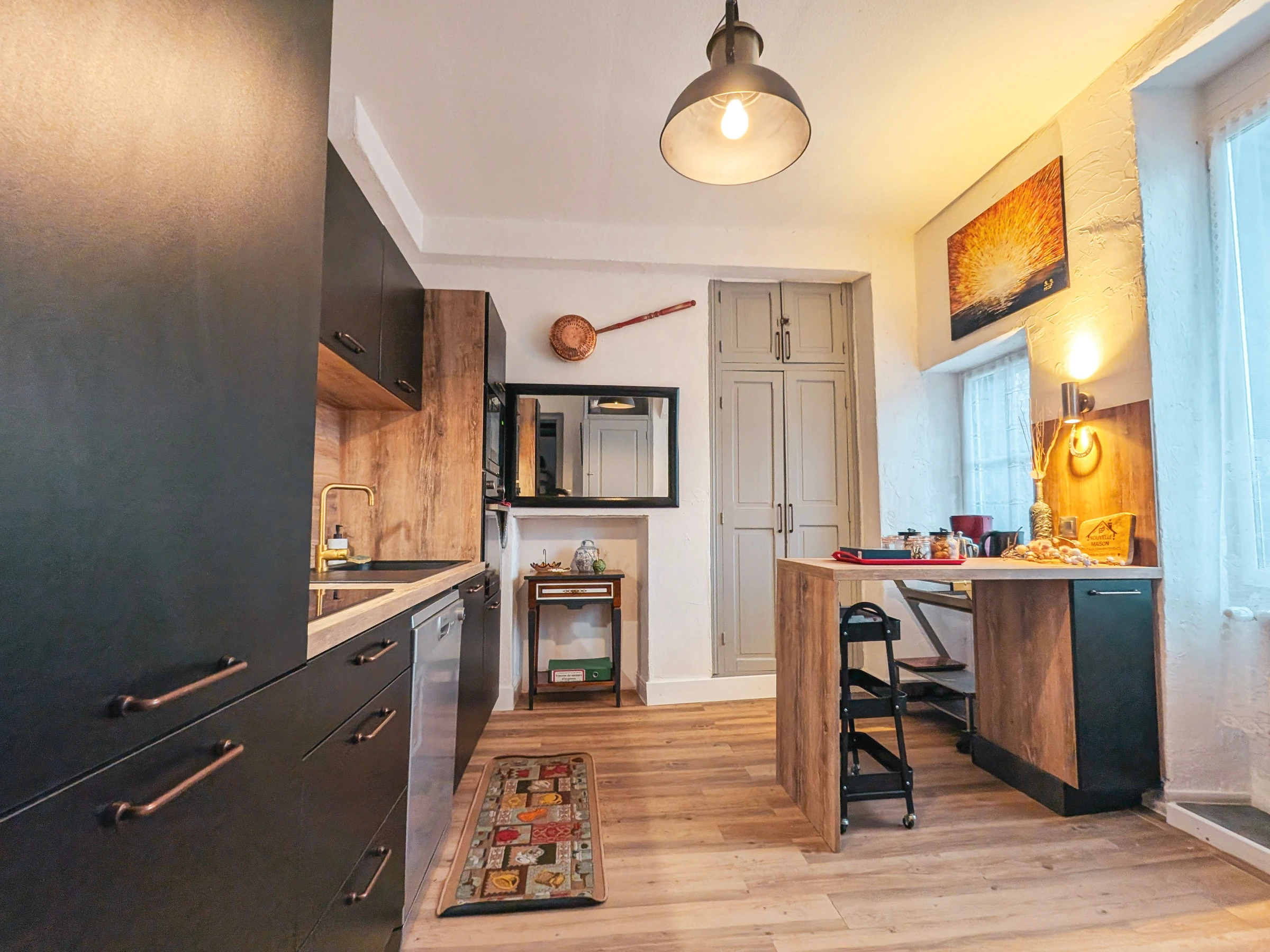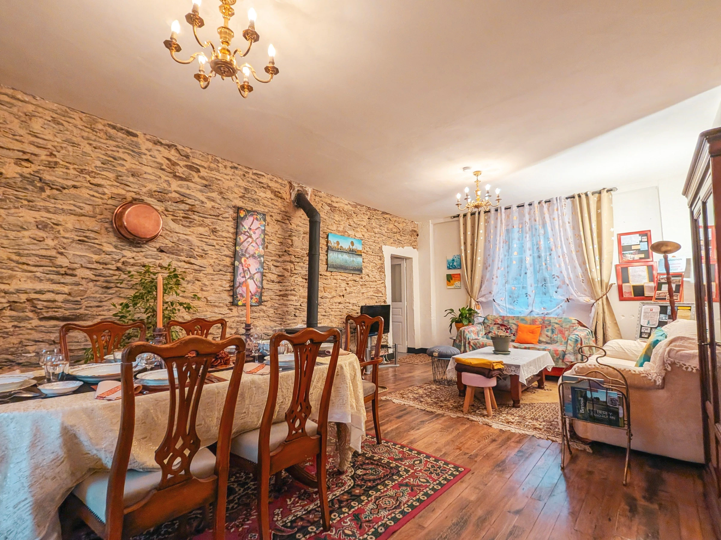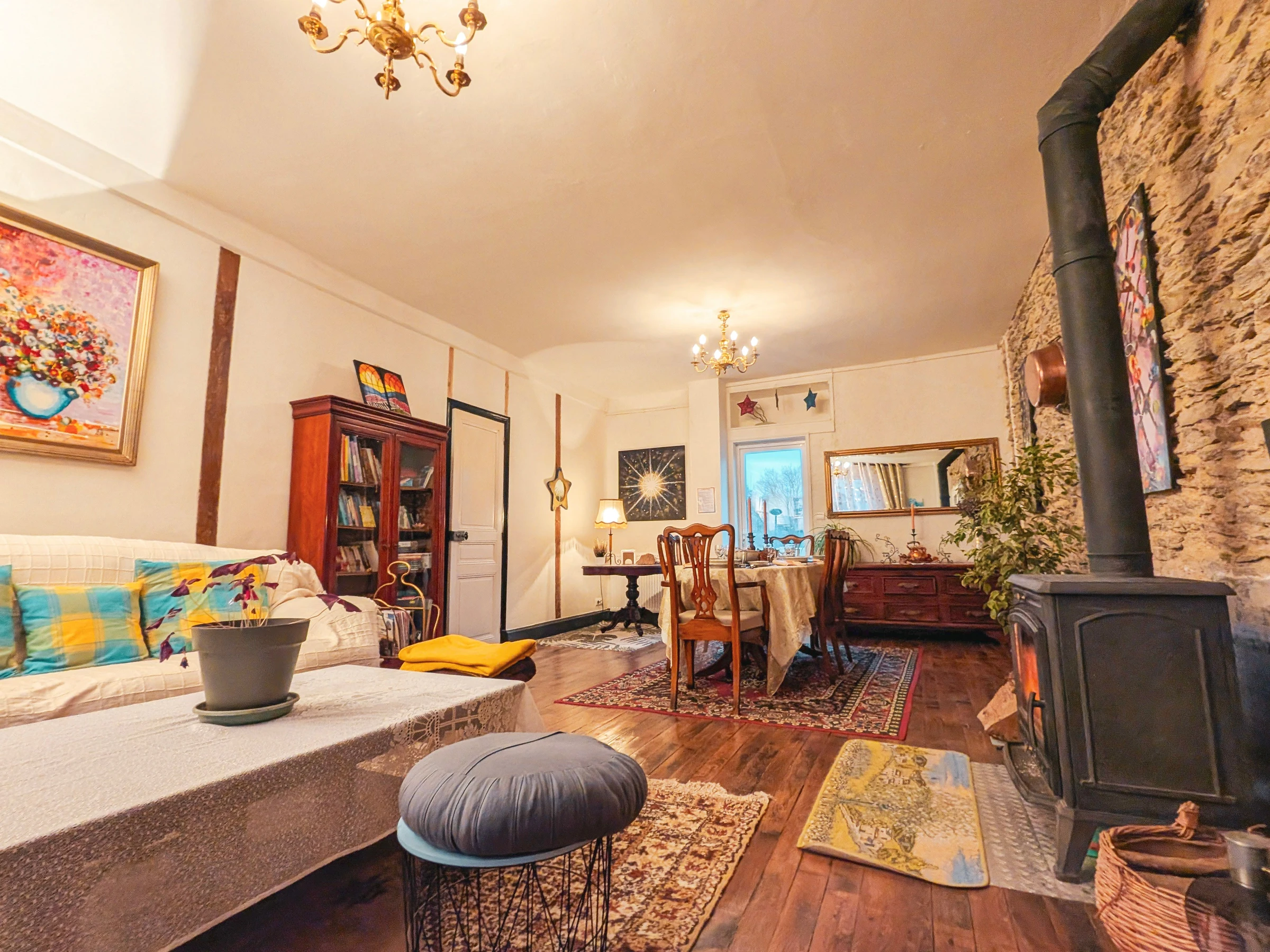 Central wood heating (shared system), wood-burning stove in the living room, and solar panels.